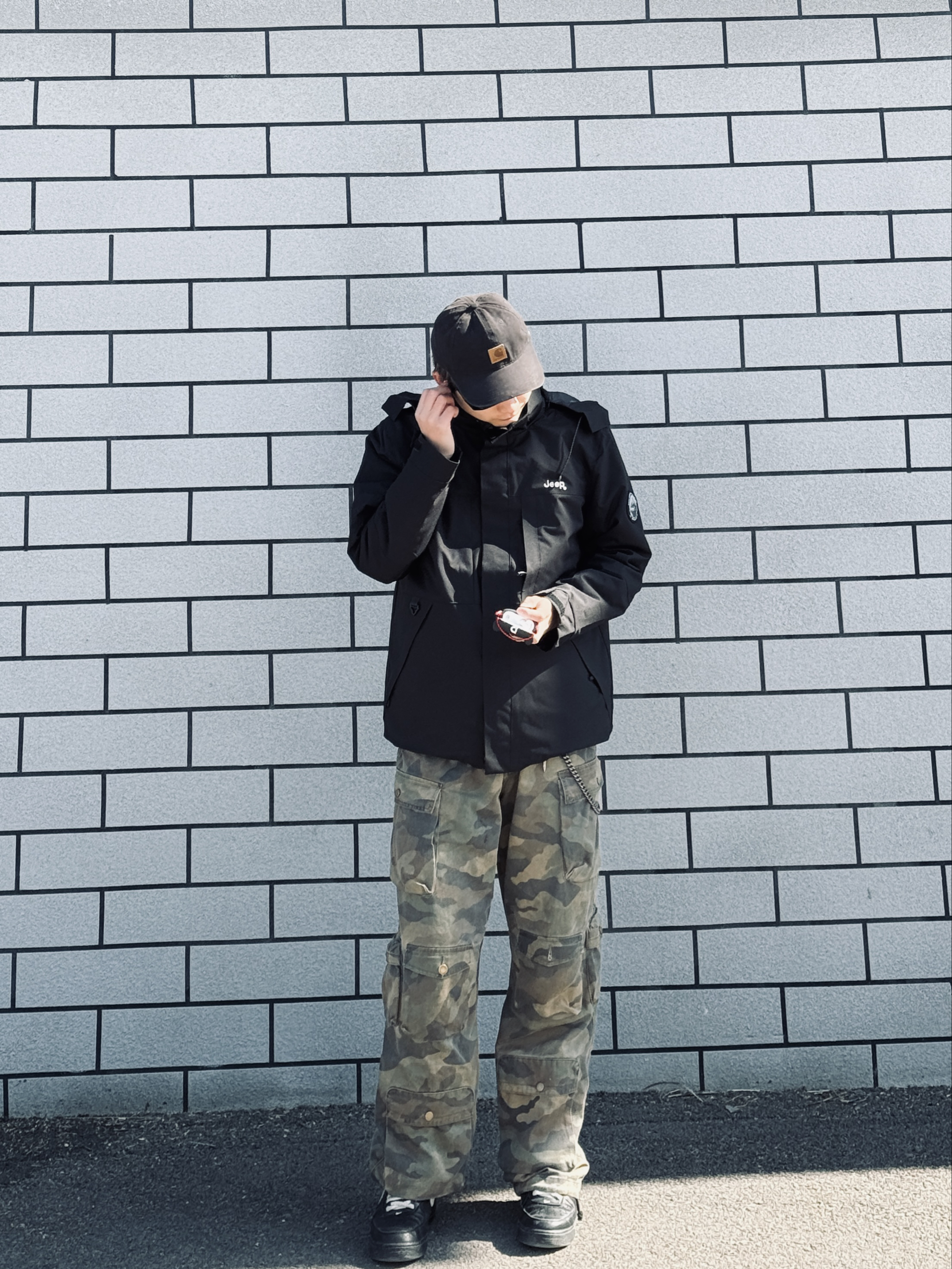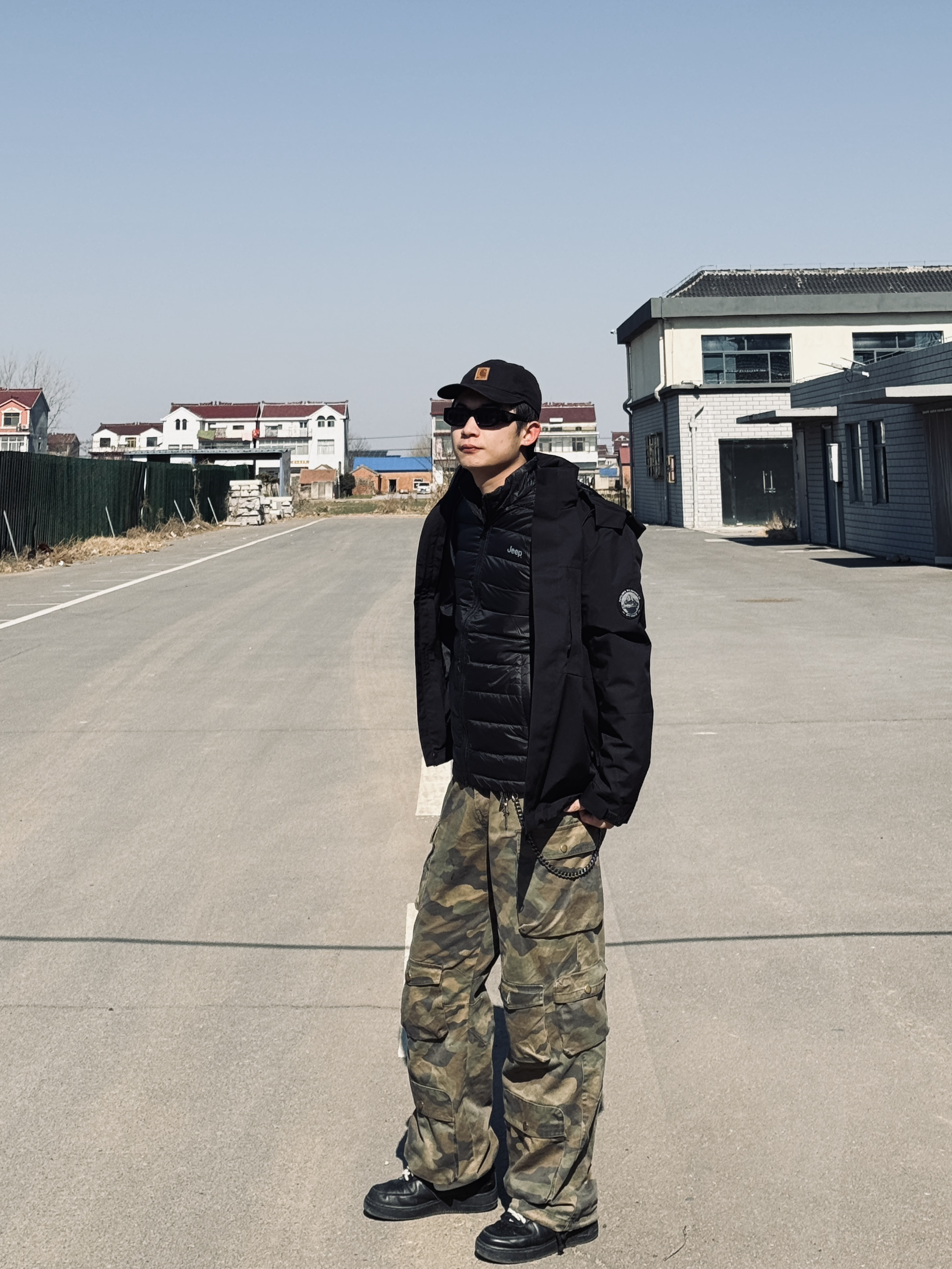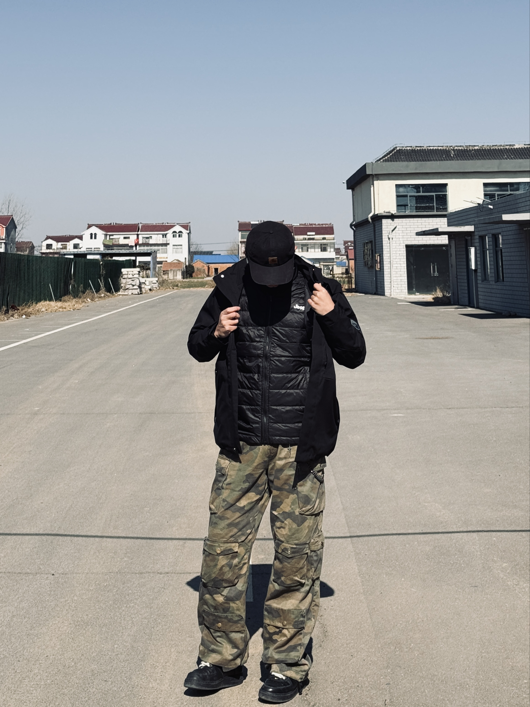 冰美式今日穿搭🍂 秋冬降温就爱这种叠穿思路❤️🔥 防风外套➕轻薄羽绒内胆 应对早晚温差很实用 — 👔外层黑色⚫️冲锋衣 面料挺括抗风🌬️ 连帽设计能护住后颈 日常通勤或短途出行都合适 内搭黑色羽绒 轻量锁温 单穿也不臃肿✨ — 👖下身迷彩工装裤 多口袋设计能装下手机📱 钥匙🔑 直筒版型修饰腿型 做旧质感很有高街味儿‼️ — 👟脚踩经典白黑板鞋 皮革面好打理 耐磨又百搭✨ — 身高178cm/体...