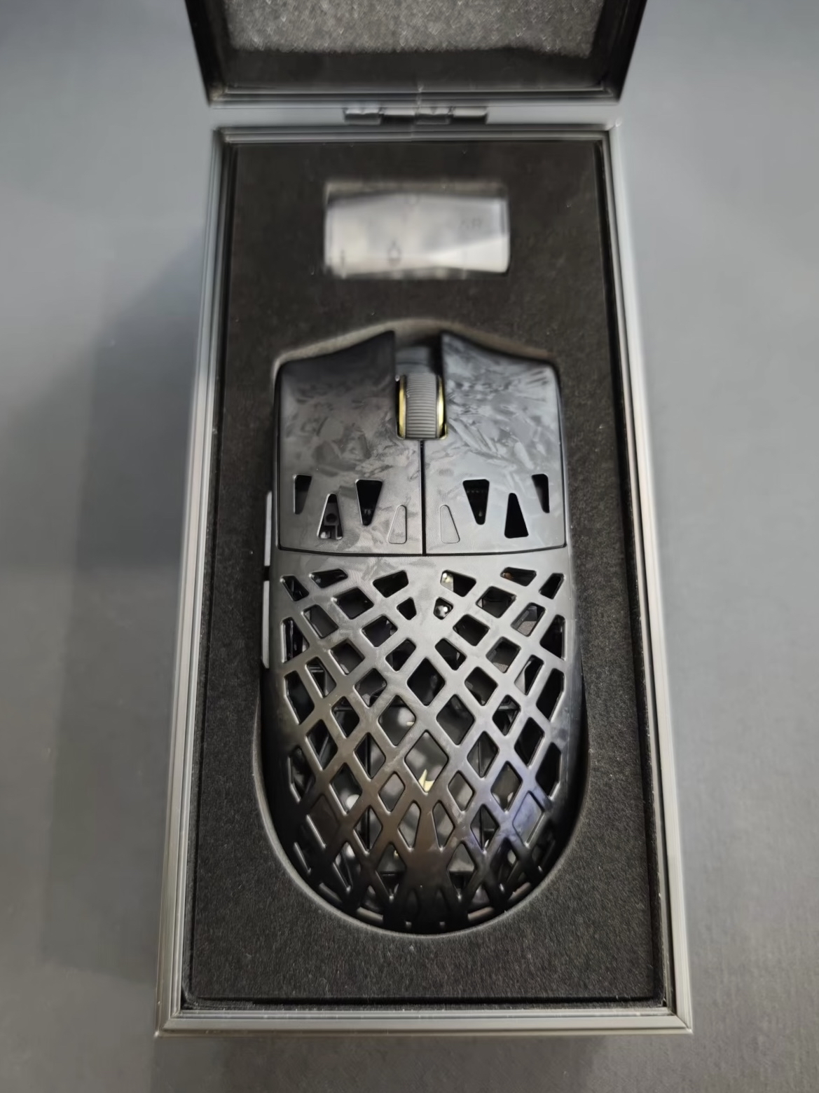 怀着对镂空鼠标的好奇入了这款,到手先被外包装惊艳到,仪式感拉满🥳!碳纤维外壳质感和强度都在线~ 我是中小手,握着很合适,滚轮刻度感也清晰。 价格也很有性价比! 不过要是有背光就更酷啦,整体还是很满意滴👏~