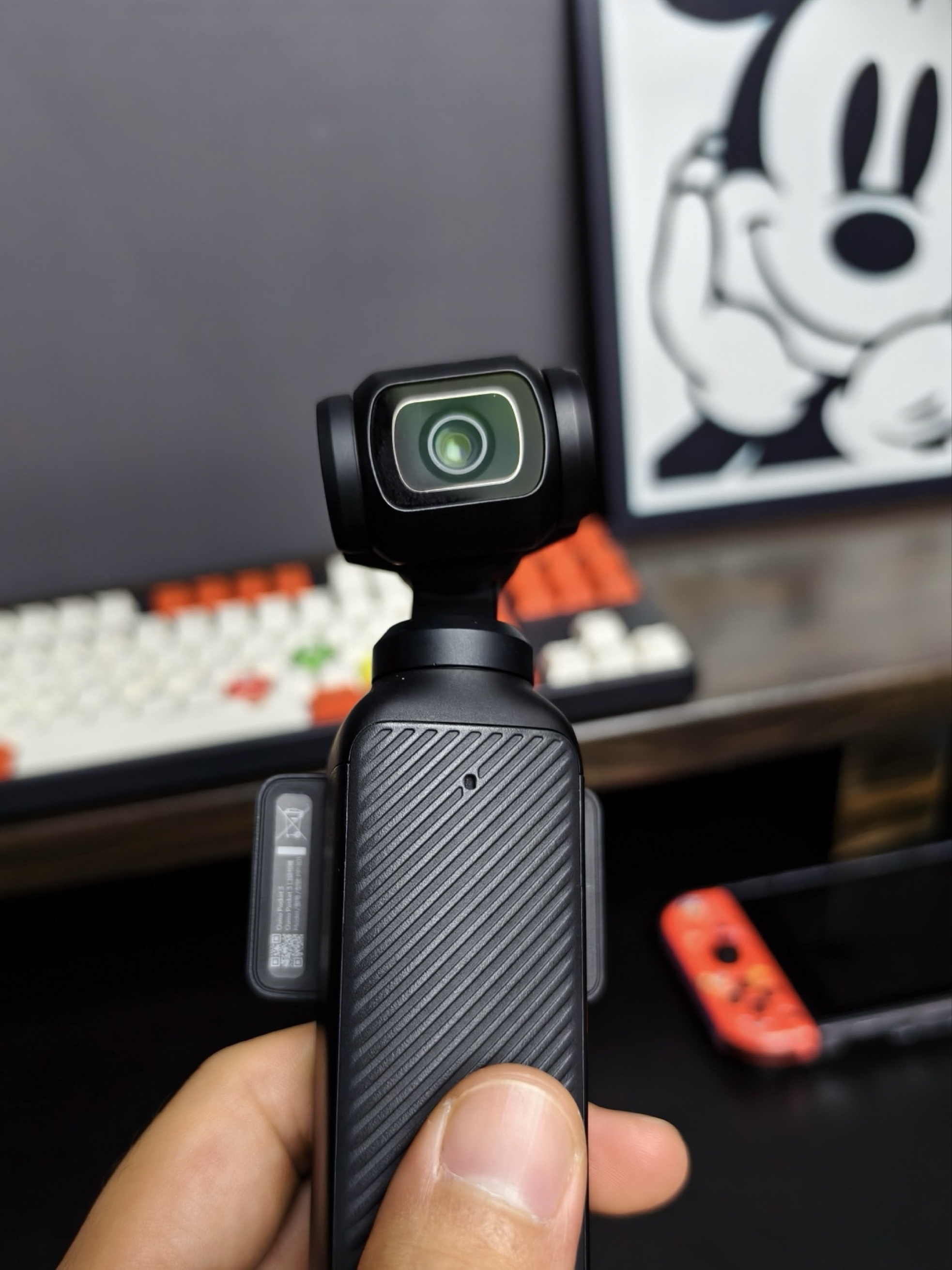 整机是深邃的哑光黑,握在手里比一管口红粗不了多少,但分量扎实。那块2英寸的OLED屏幕是精髓。关机时,它与机身融为一体;开机瞬间,它会像翻盖手机一样清脆地横向旋转点亮,这个动作本身就有种仪式感。1英寸的CMOS传感器模组安静地嵌在顶部,像个沉默的眼睛。和那些需要复杂组装的手持稳定器相比,它最大的不同就是“完整性”。从收纳包里拿出来就是待命状态,没有云台调平,没有手机夹装,减少了一切让你犹豫的步骤。这种即拿即用的利落感,和我选择穿搭单品时追求“无需费力思考的搭配”是一个道理。