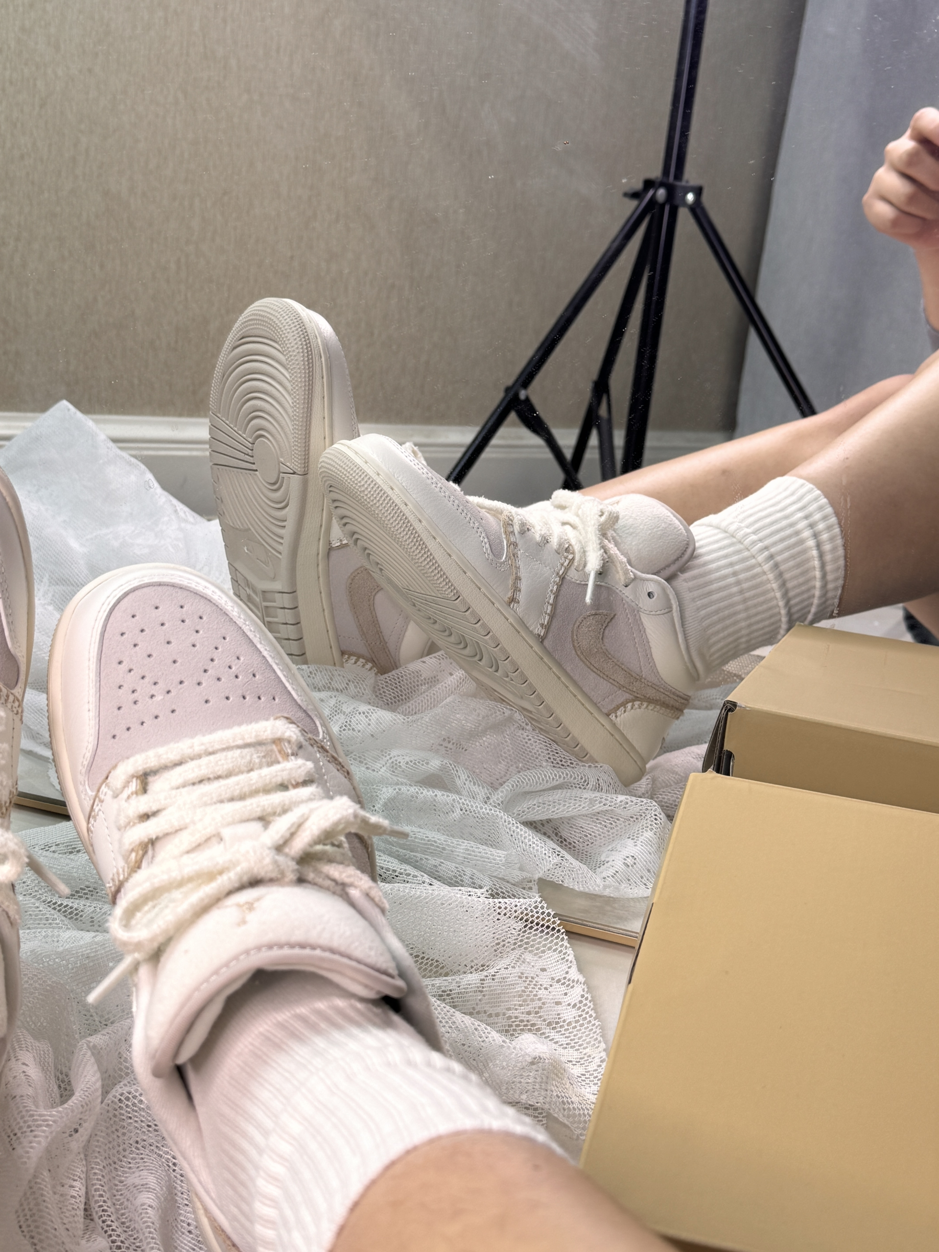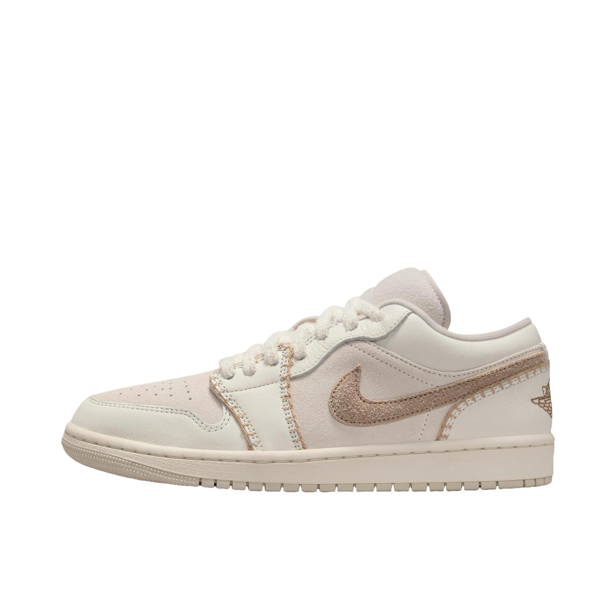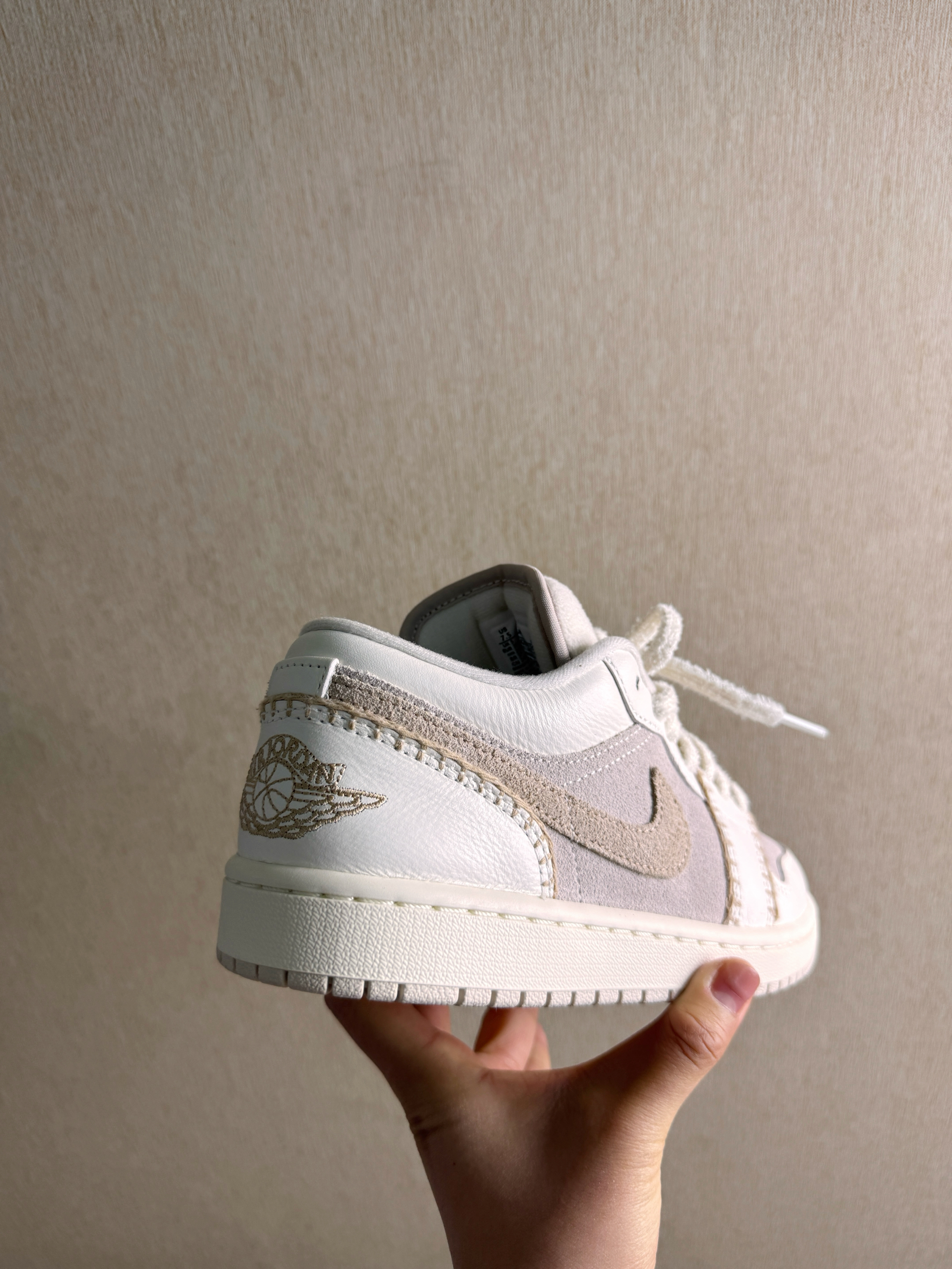 其实最初我的是这一双AJ一的一个奶乎乎的,带点咖色掉的一个配色 有种燕麦拿铁的那种感觉 不张扬但是却很显你的气质 毛茸茸的鞋带摸起来软乎乎的 鞋身的缝线像是手工缝制的感觉 很有复古和细腻感 搭配同色调的针织衫或者牛仔裤都很韩系