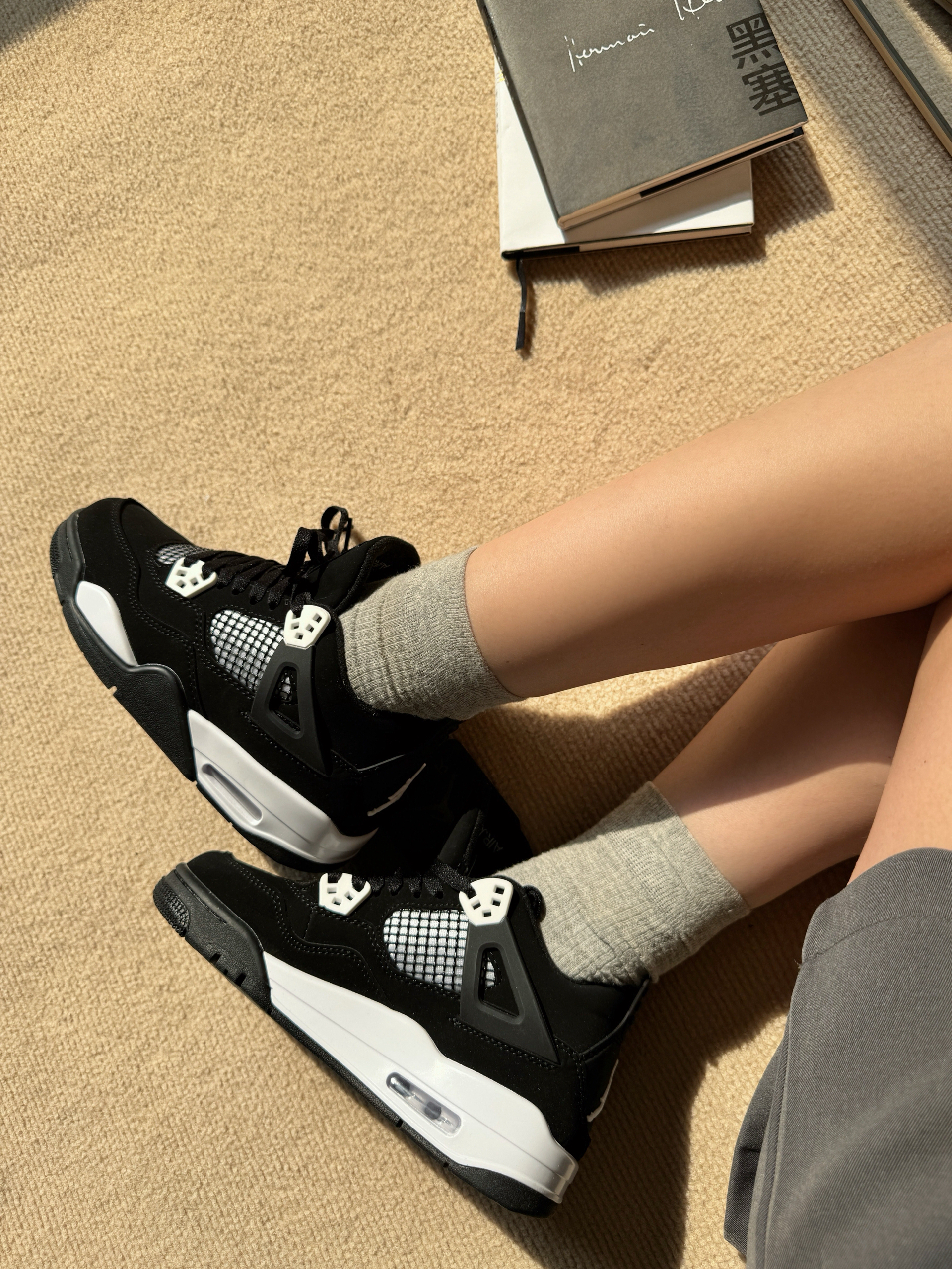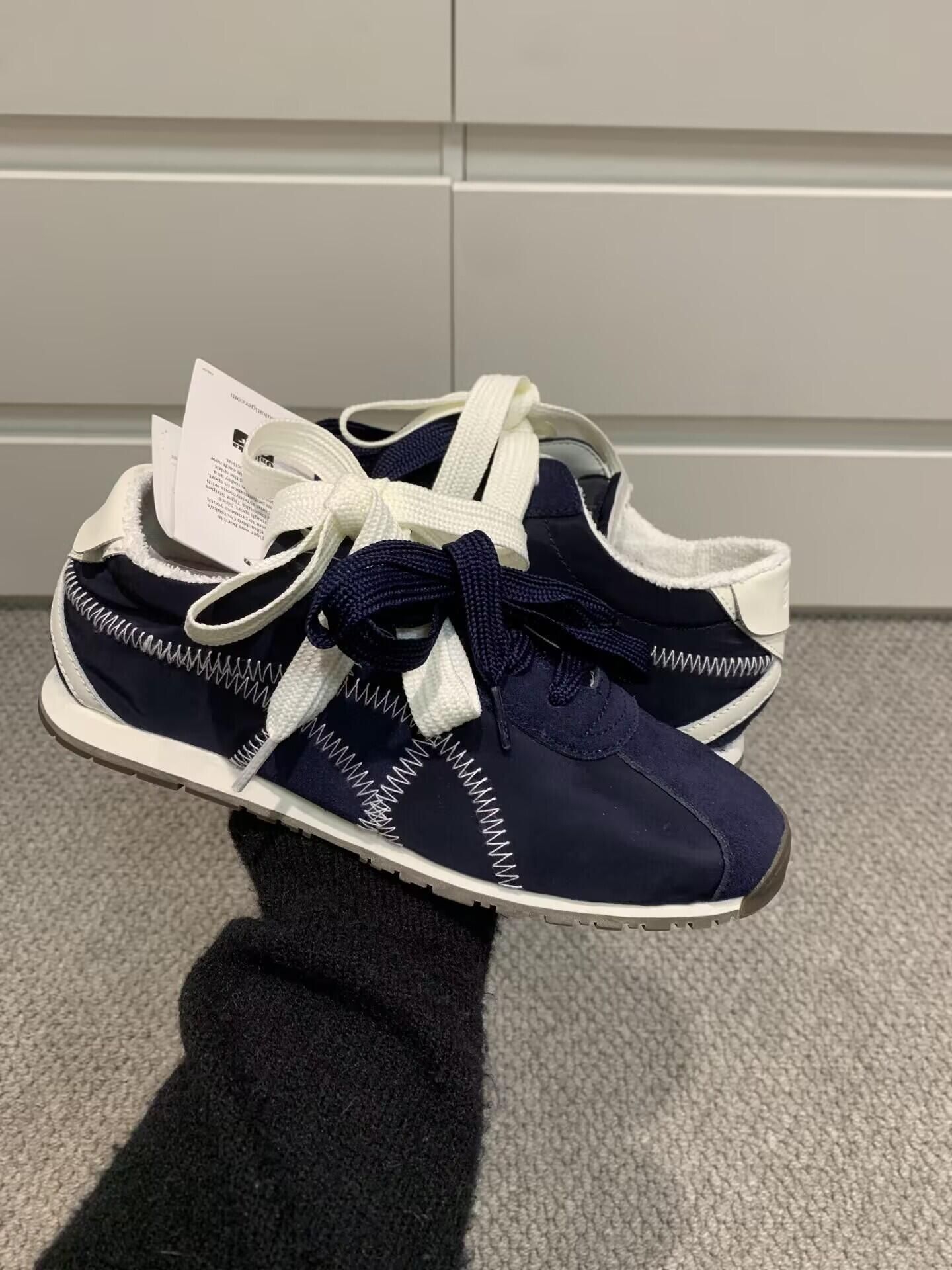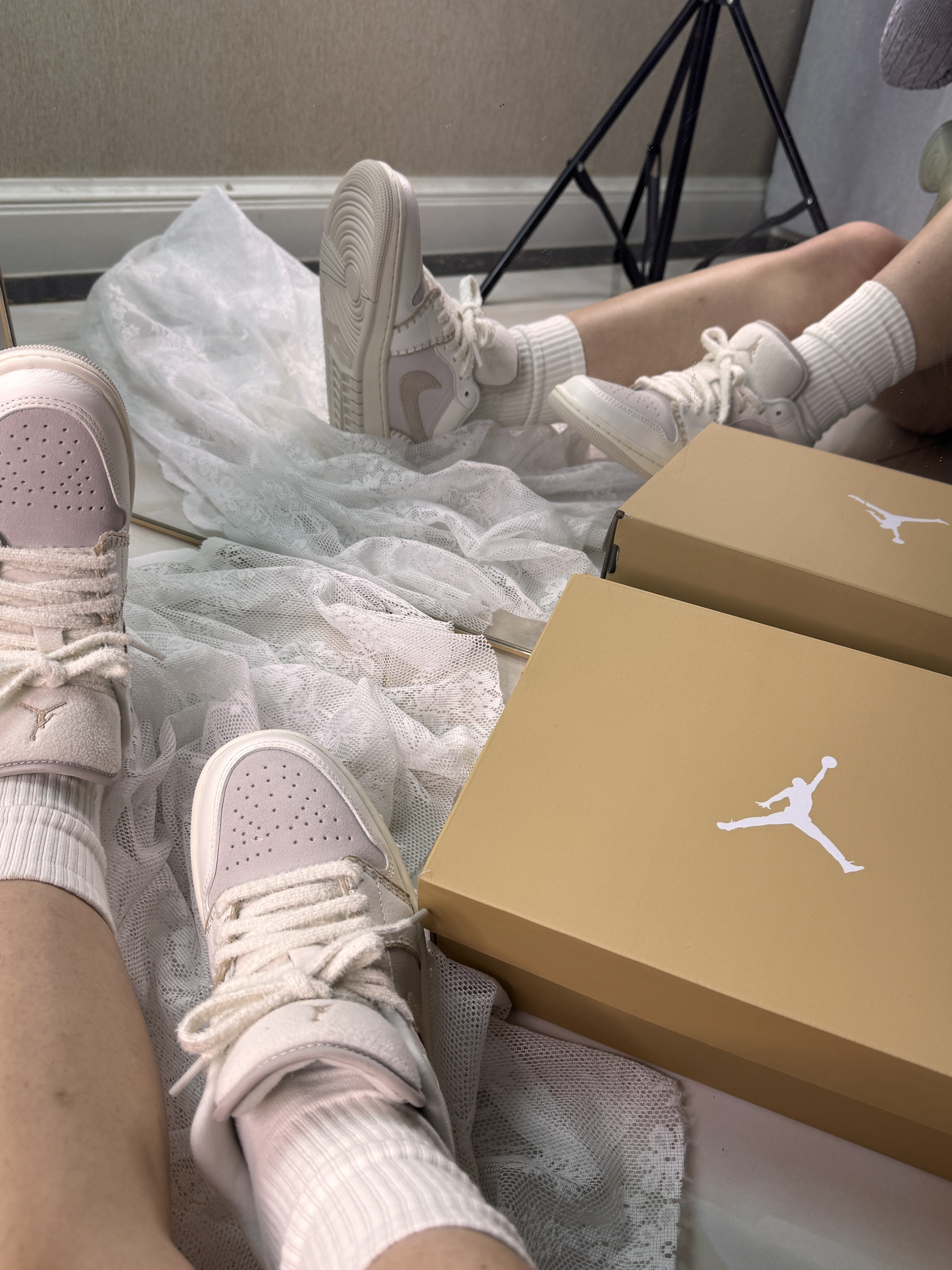 其实最初我的是这一双AJ一的一个奶乎乎的,带点咖色掉的一个配色 有种燕麦拿铁的那种感觉 不张扬但是却很显你的气质 毛茸茸的鞋带摸起来软乎乎的 鞋身的缝线像是手工缝制的感觉 很有复古和细腻感 搭配同色调的针织衫或者牛仔裤都很韩系