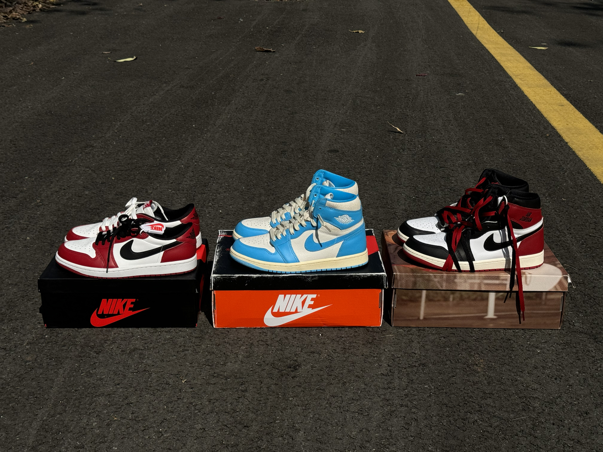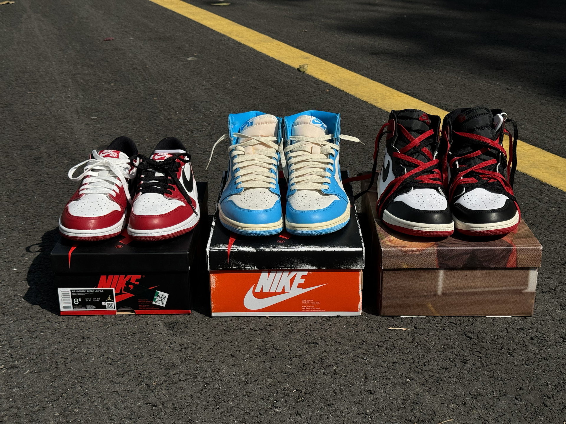 这三双经典的配色,黑脚趾、芝加哥还有北卡蓝应该是这两年性价比很高的aj1了 可能有的朋友不喜欢消失的飞翼/脚皮龟裂材质/低帮,但是我还蛮喜欢这种创新~我也试了试不用鞋带的搭配,还蛮有个性的! #就是个板鞋脑袋