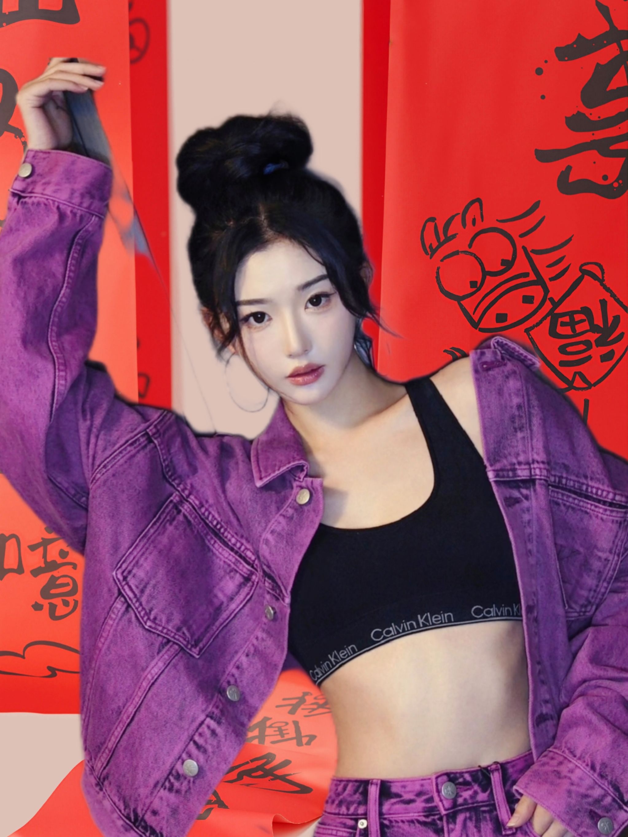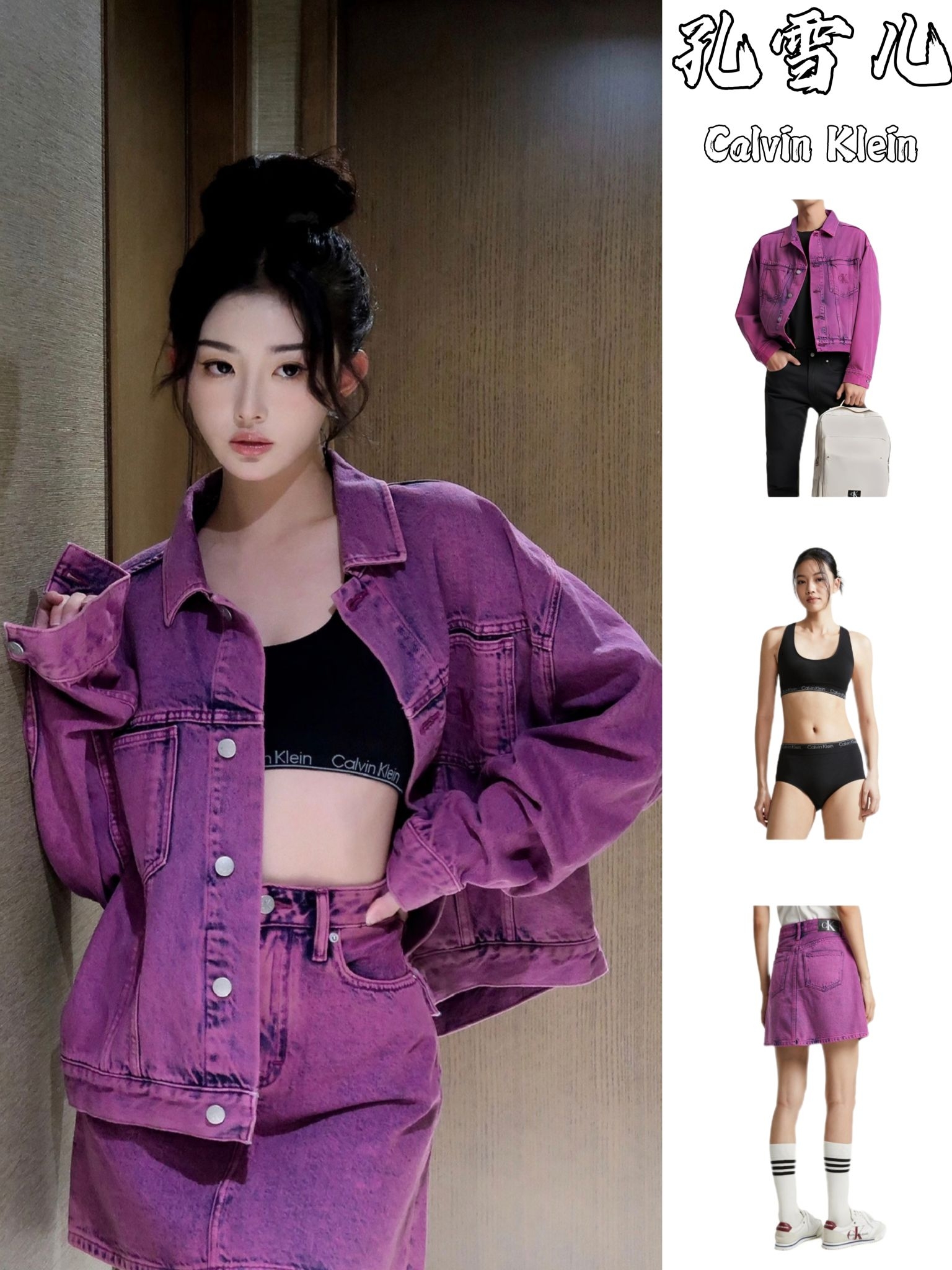 家人们谁懂啊!孔雪儿这一身Calvin Klein紫牛仔套装,直接把我拿捏了! 高丸子头+做旧紫牛仔,甜妹秒变拽姐,又甜又野的反差感直接拉满。内搭CK运动bra,露腰设计又辣又随性,完全不刻意,日常出街也能抄作业。 这一套真的太会了: - 颜色:紫调牛仔自带复古滤镜,显白又吸睛,黄皮姐妹也能冲 - 版型:宽松牛仔外套+高腰短裙,遮肉显瘦,小个子也能穿出大长腿 - 风格:甜酷平衡得刚刚好...