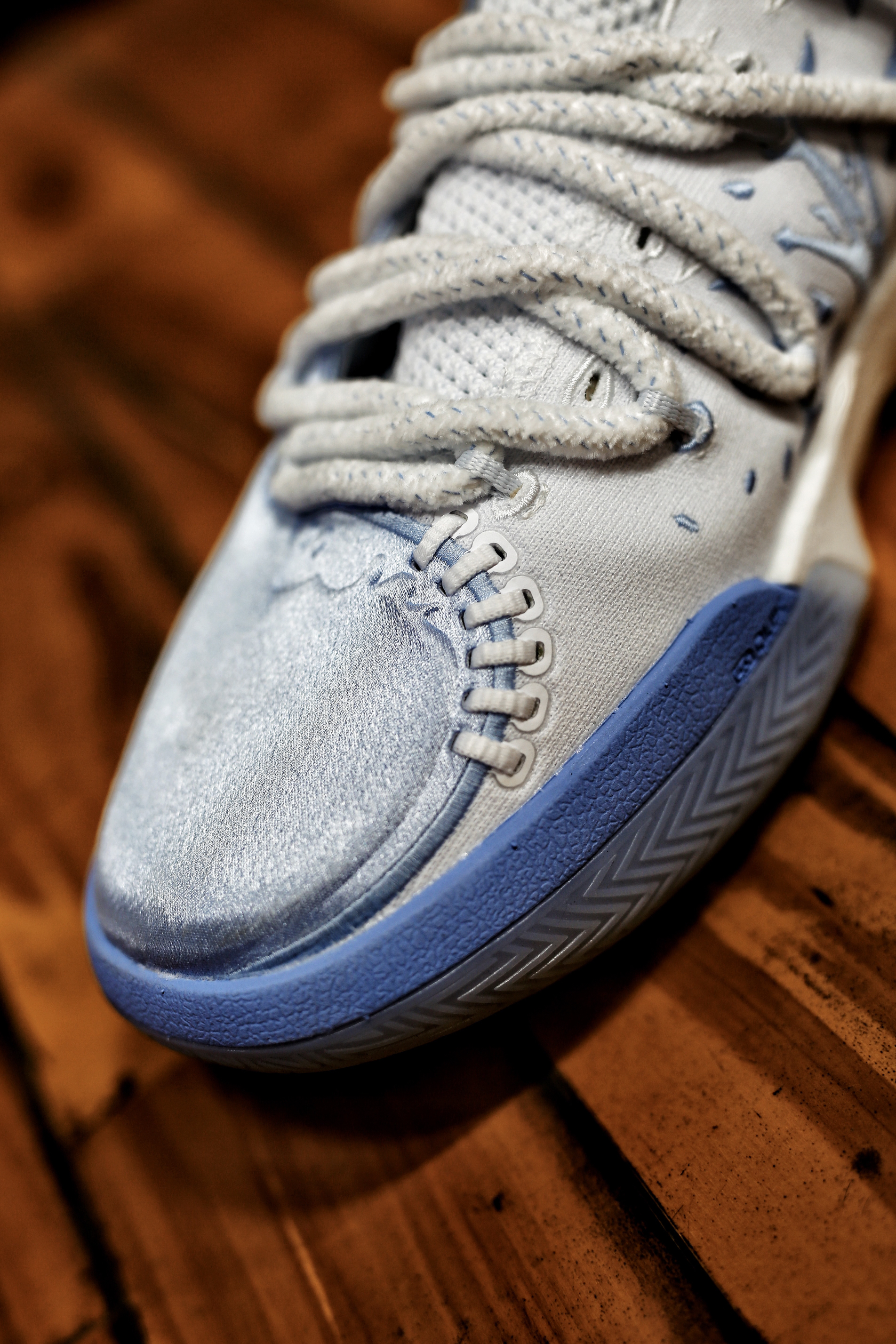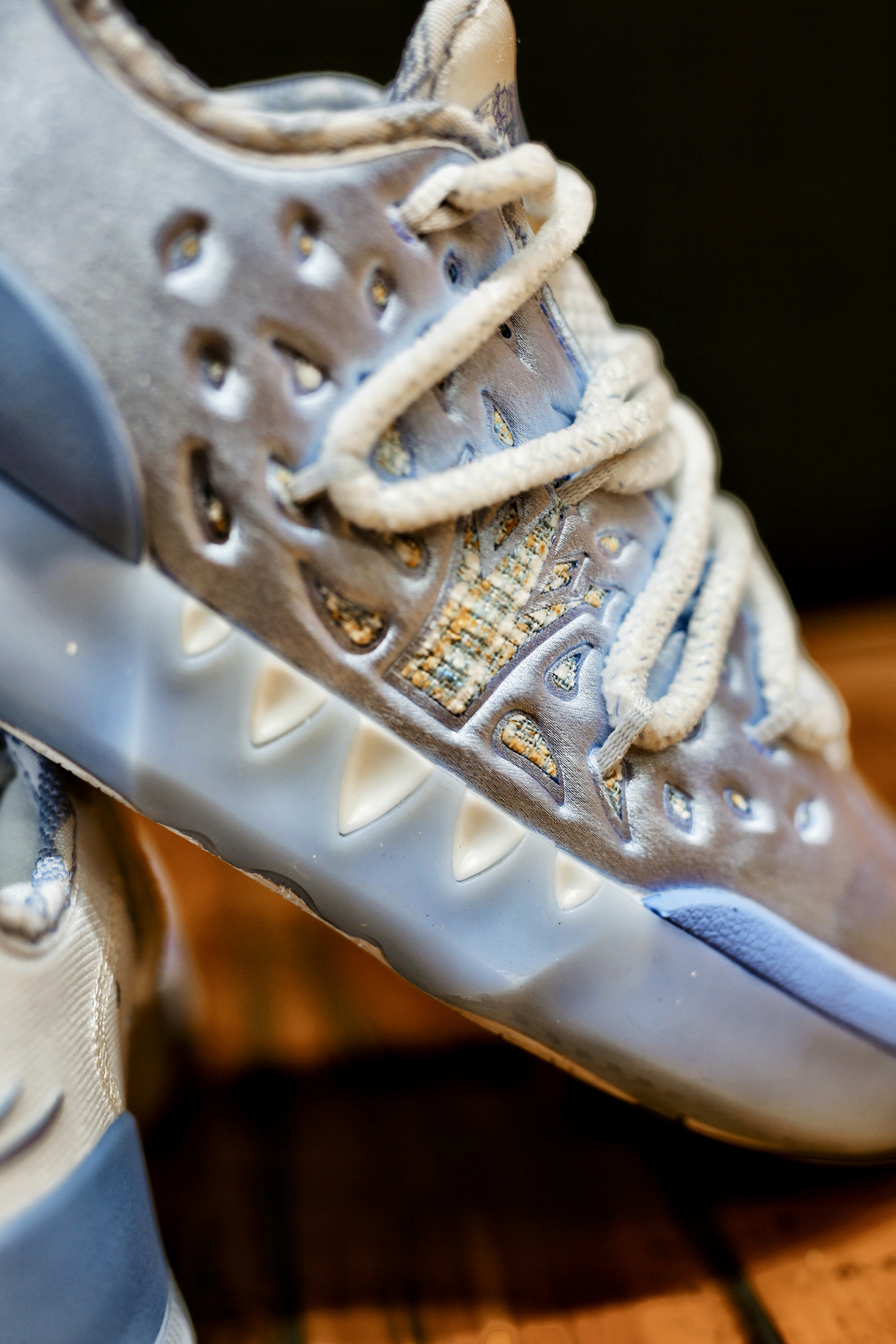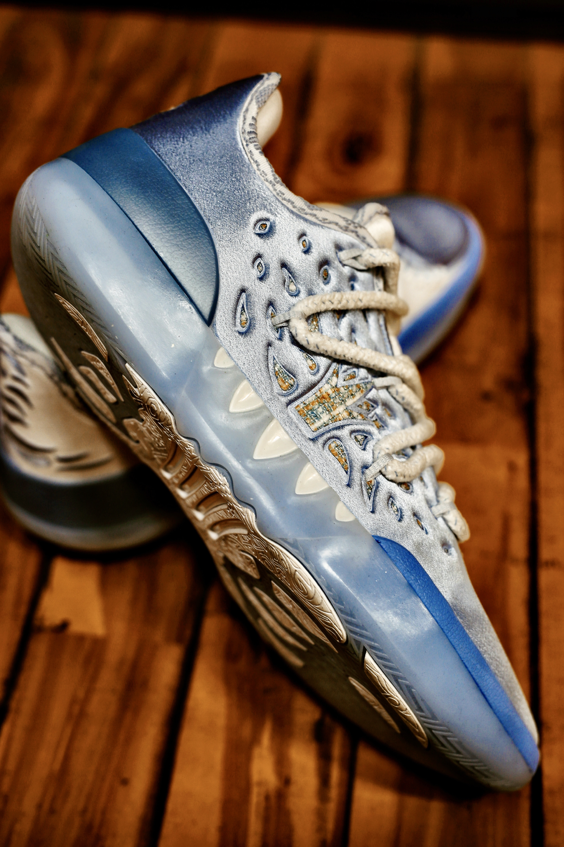 这双361°JOKER2丹佛配色 银色和蓝色搭配 透过照片也能感受到那高级的质感 上脚舒适,没有压迫感,但有足够锁定噶感 QU!T全掌碳临界中底缓震+尼龙抗扭片 有颜值有配置,掘金球迷值得关注哦!