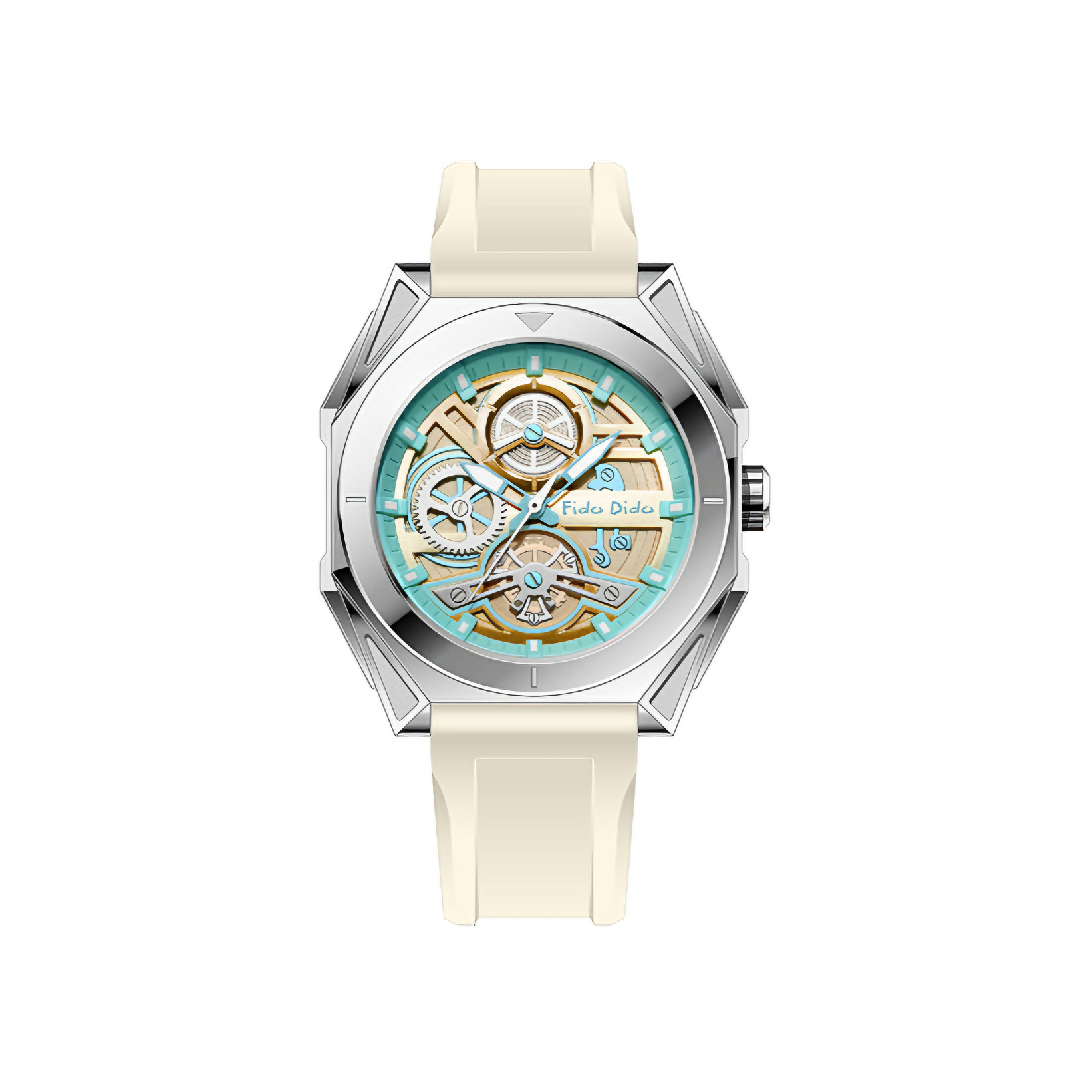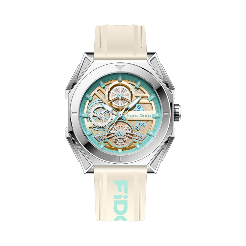 当机械美学邂逅复古工装,腕间的时间便有了新的表达。 fido dido 镂空机械风石英表,以银壳为骨,卡其带为衣,几何表壳勾勒出利落线条,镂空表盘下的精密结构若隐若现,复刻着机械时代的浪漫。 精钢表壳经精密抛光,冷冽光泽与卡其色表带的温润形成鲜明对比,每一处细节都在诉说着对质感的执着。石英机芯稳定走时,让精准与格调并行。 无性别设计打破风格边界,无论是工装夹克的硬朗,还是极简白T的松弛,它都能成为...
