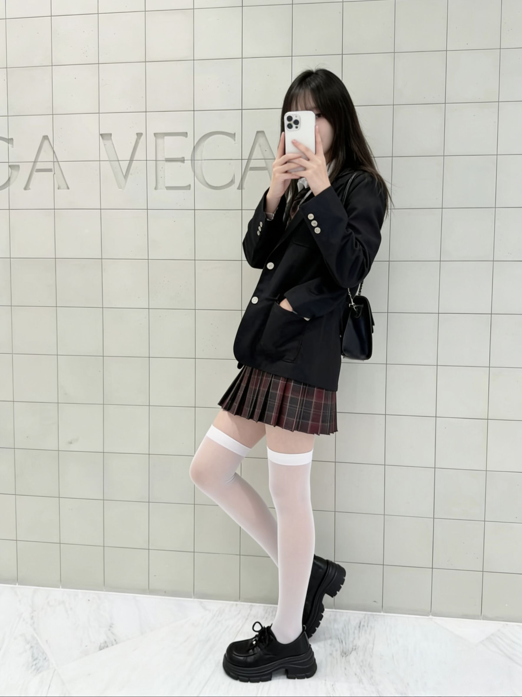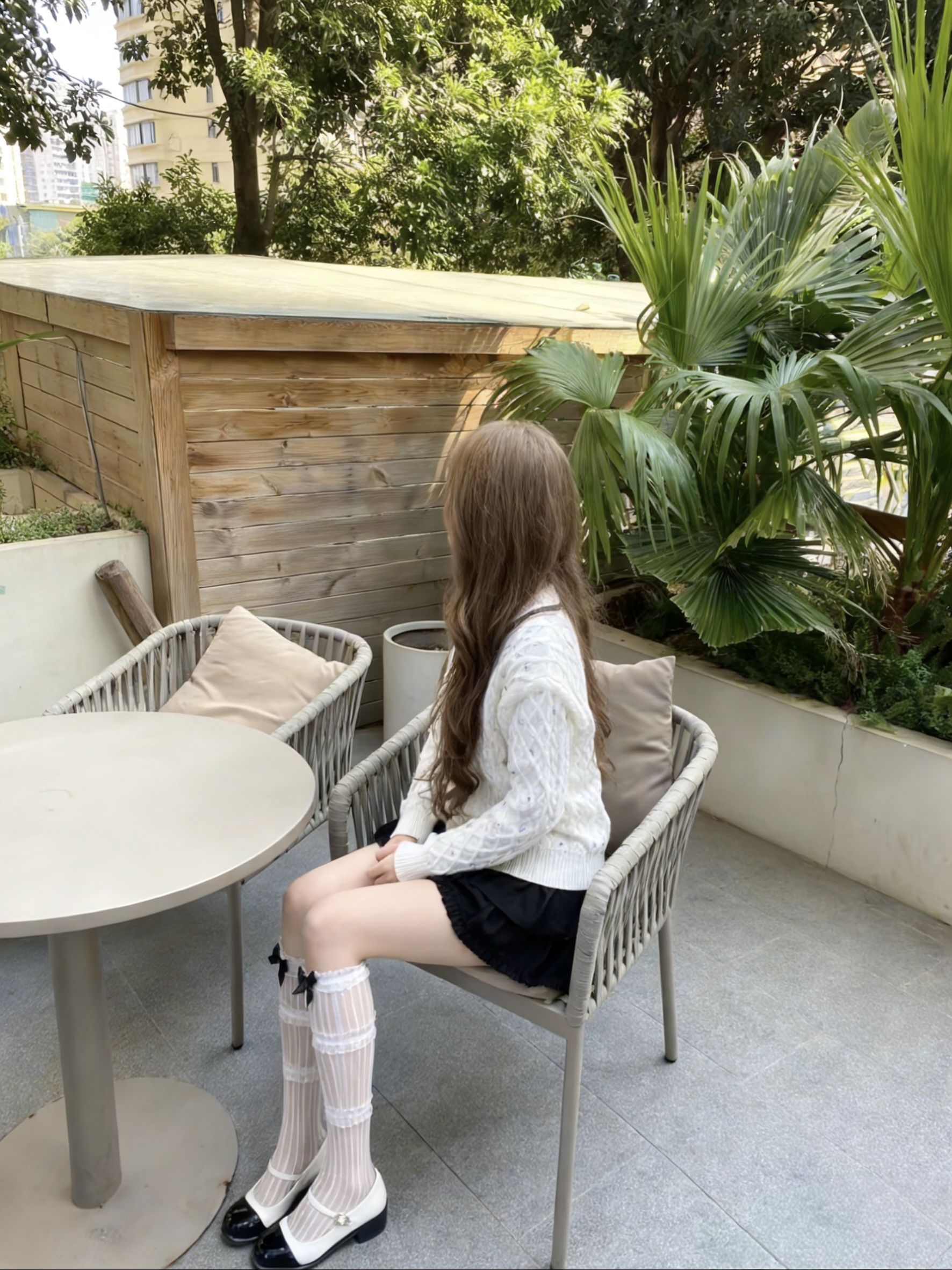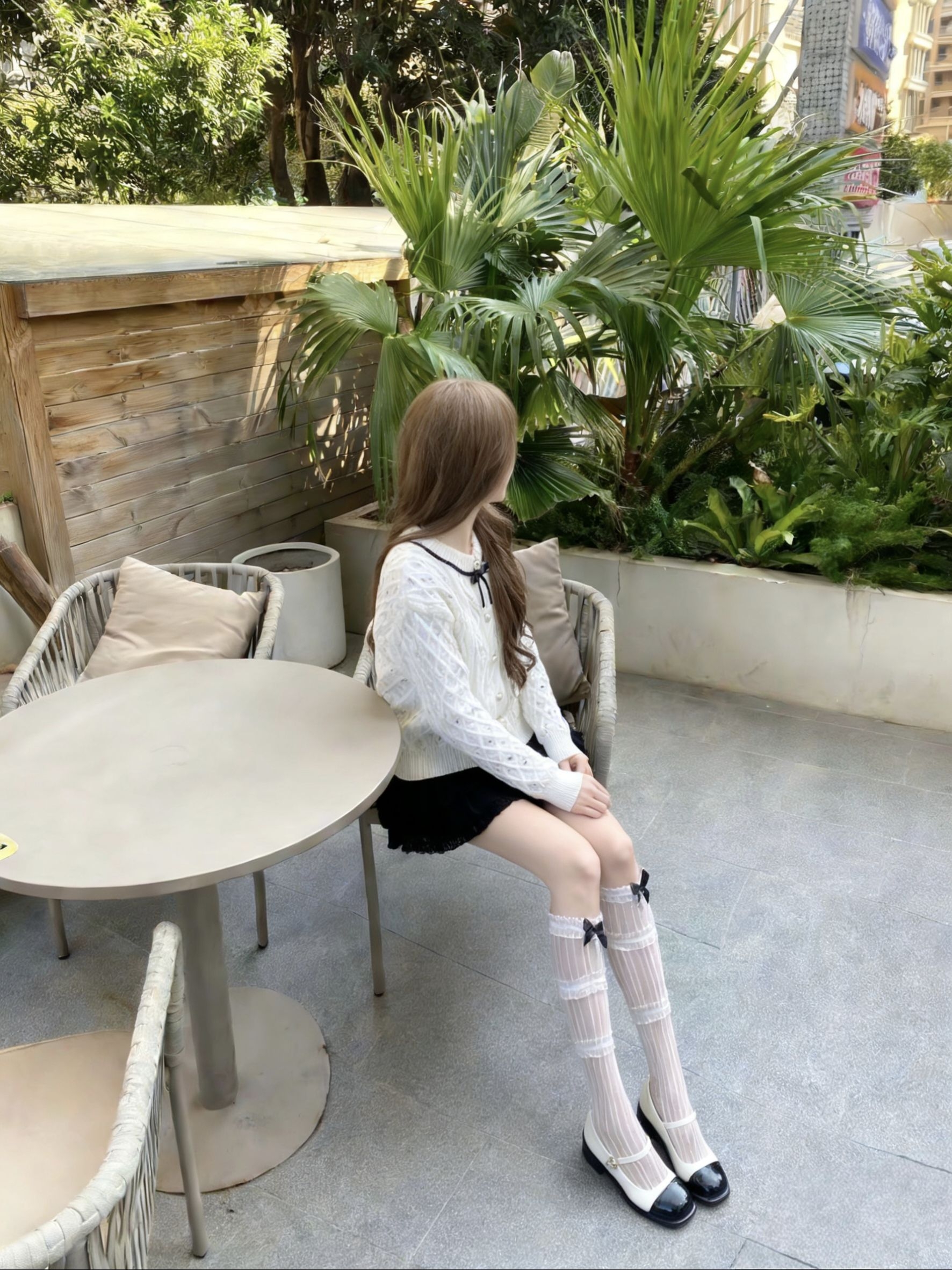 不爱露脸星人狂喜!用手机挡脸+侧拍/背影,氛围感直接拉满。 今天这套甜妹风穿搭,重点全在细节上👇 - 上衣:奶白色针织开衫,自带温柔滤镜,领口的黑蝴蝶结又甜又乖。 - 下装:黑色蓬蓬短裙,和上衣形成经典黑白配,甜妹感拉满。 - 袜子:这双带蝴蝶结的白丝真的是点睛之笔!半透的竖条纹设计,加上可爱的蝴蝶结,少女心爆棚,还能修饰腿型。 - 鞋子:经典玛丽珍鞋,黑白配色和整套穿搭完美呼应,温柔又复古。 不...