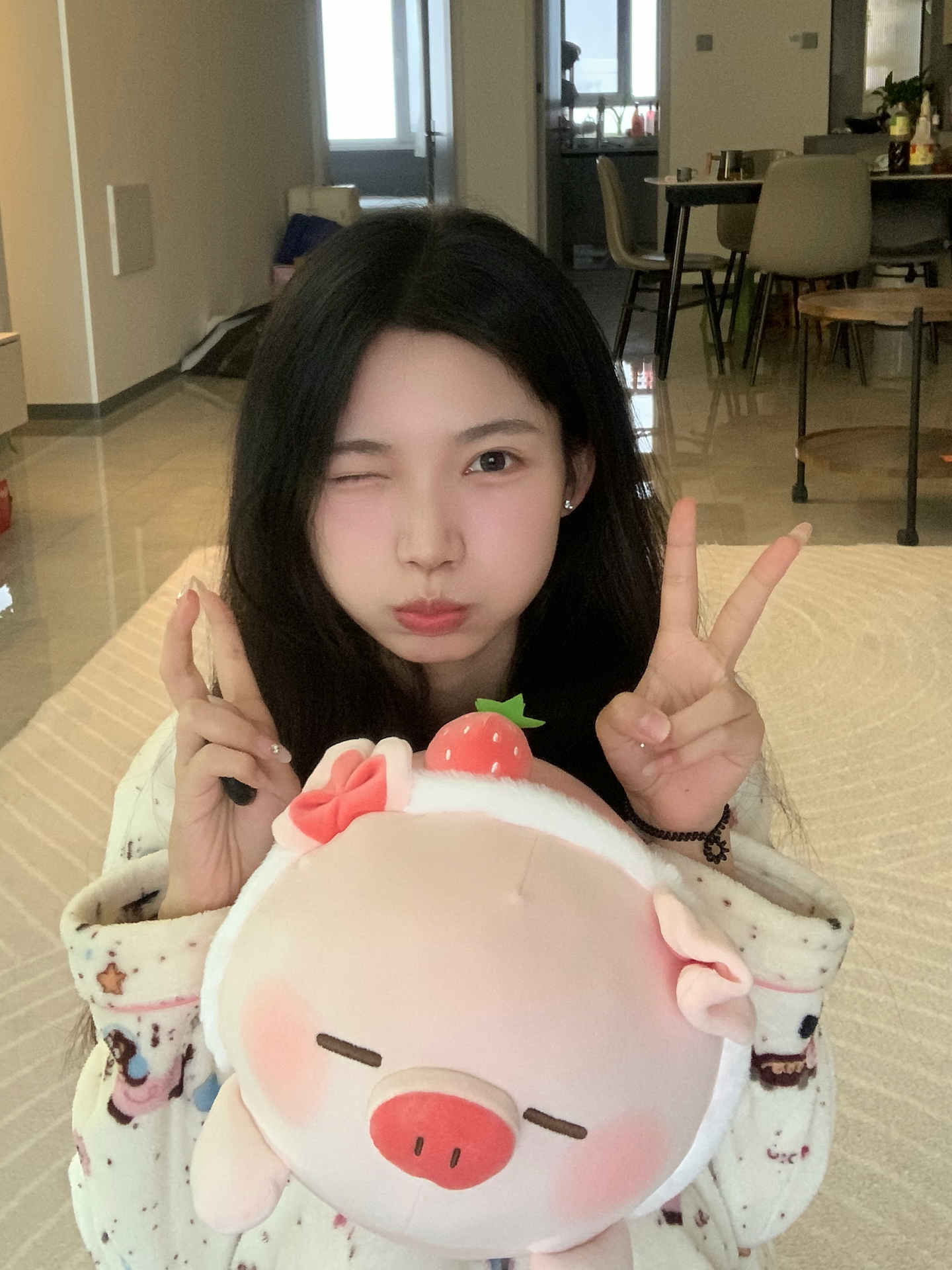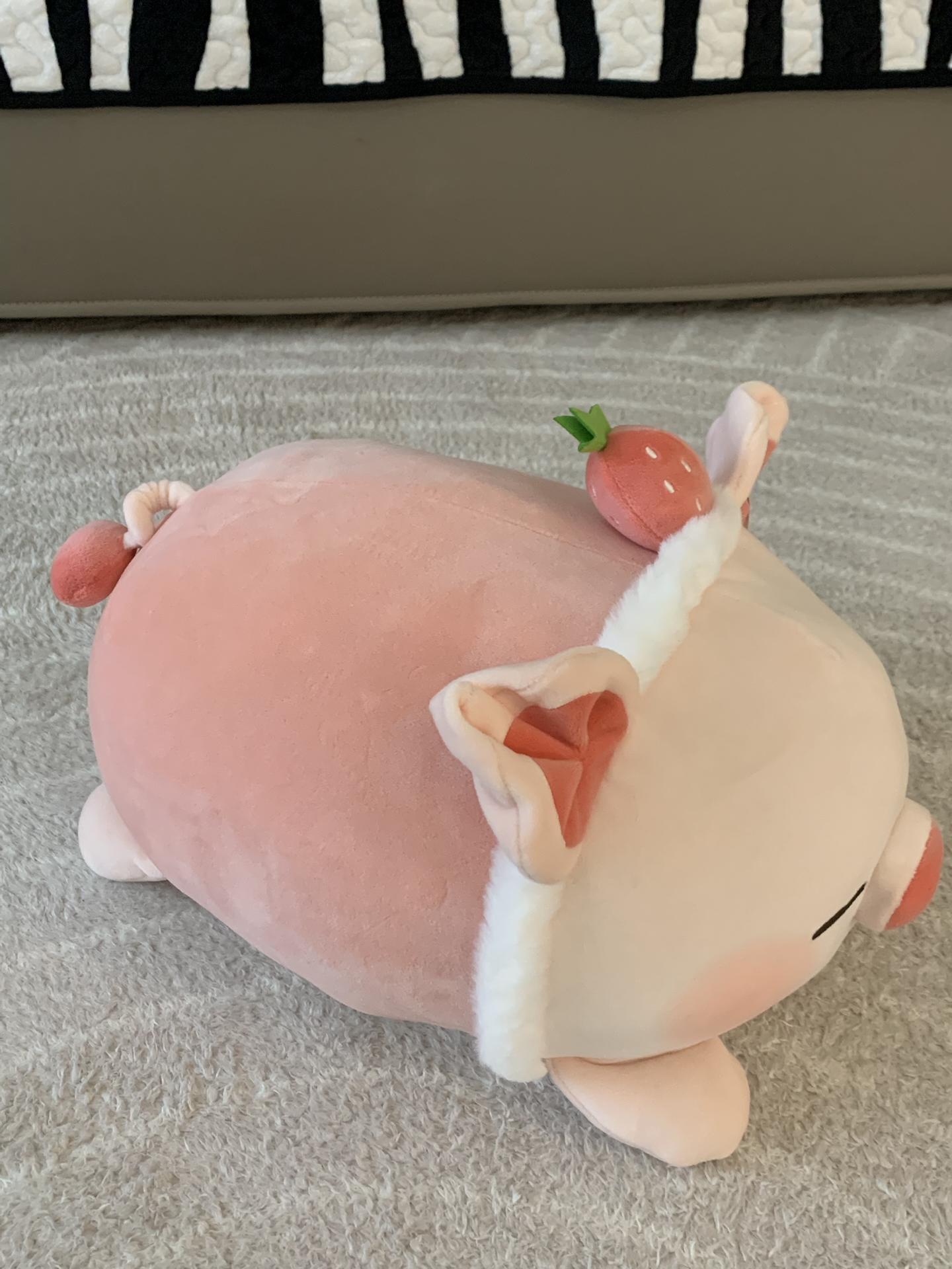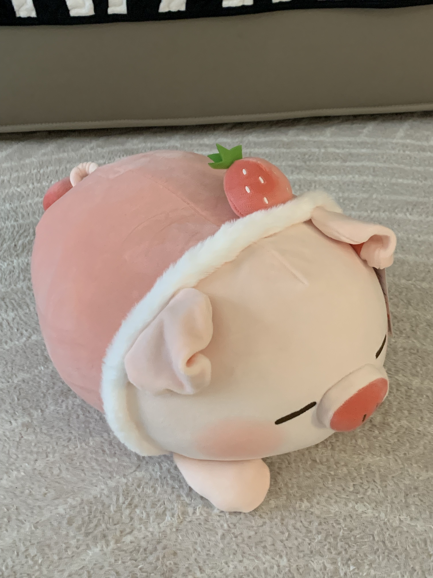 我的宅家新宠就是这只趴趴猪玩偶! 粉嘟嘟的肚子,头顶一颗小草莓,软乎乎的手感超好rua 抱着追剧或者当靠枕都特别治愈 它不仅是可爱的摆设,更是我窝在沙发上时的温暖陪伴 毛茸茸的质感让人心情瞬间变好~ 图源网络侵删