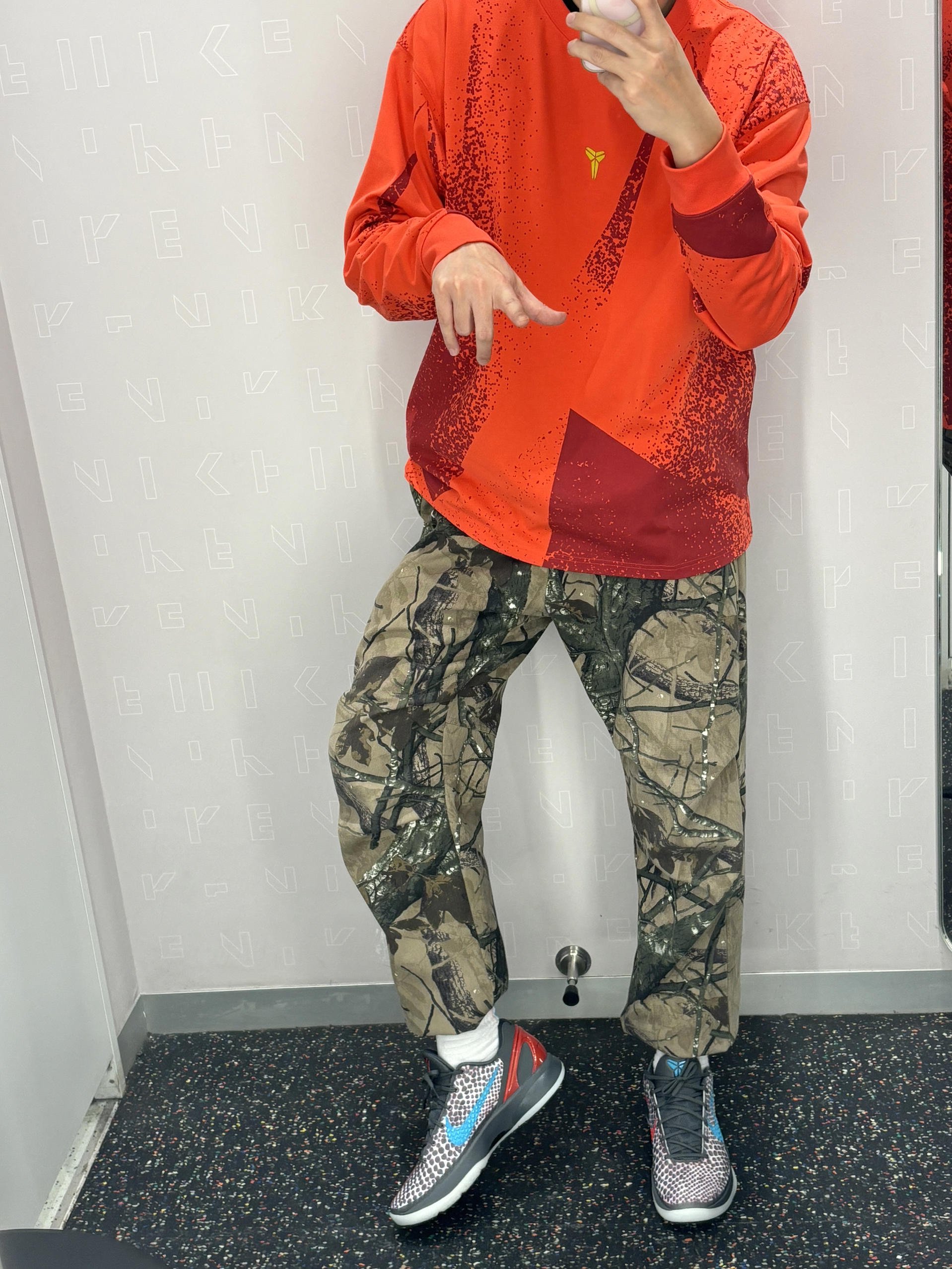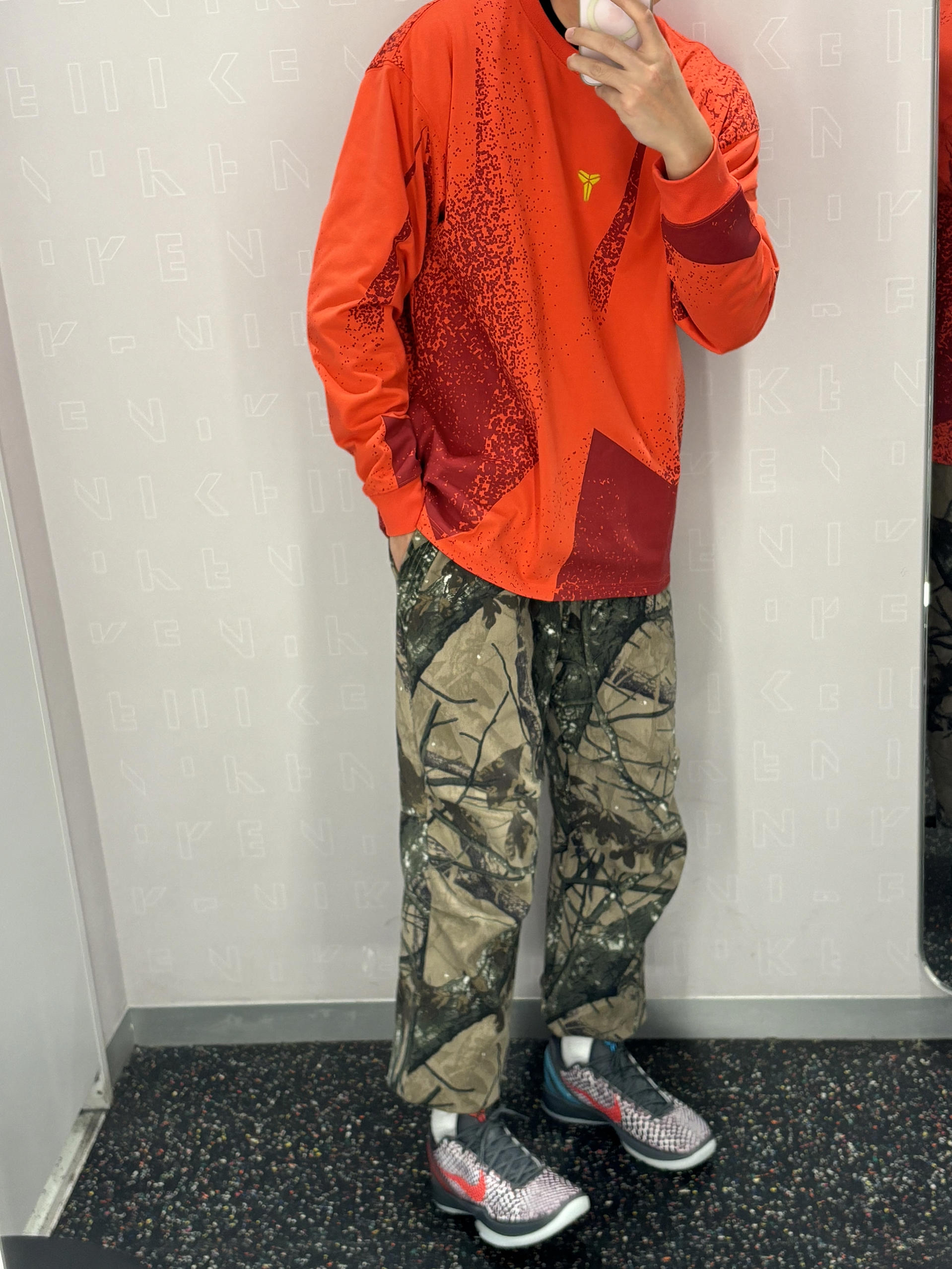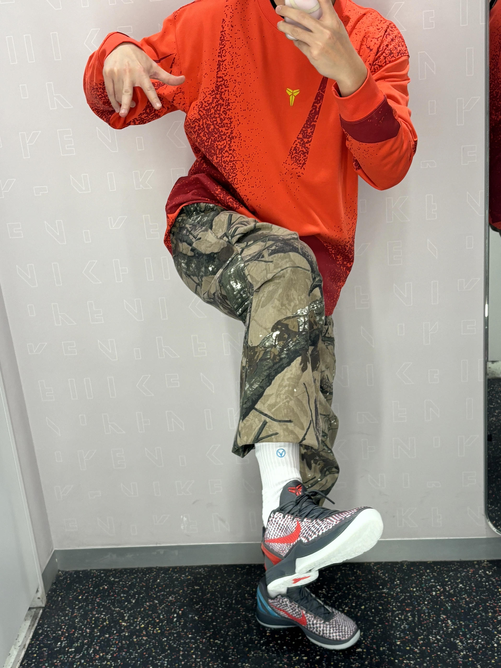 不费力严选神裤 我马年回家就这么穿的 NBA这个迷彩风搭配到体育生身上也很适合 大红色的曼巴卫衣 阴阳处也很得当很高级的处理 红色与绿色的撞色设计 运动户外潮流的感觉 一双科比6裸眼3D红蓝鸳鸯就很帅 这一套就高级还潮流 👔科比曼巴长袖 👖uzis迷彩直筒裤 👟科比6裸眼3D