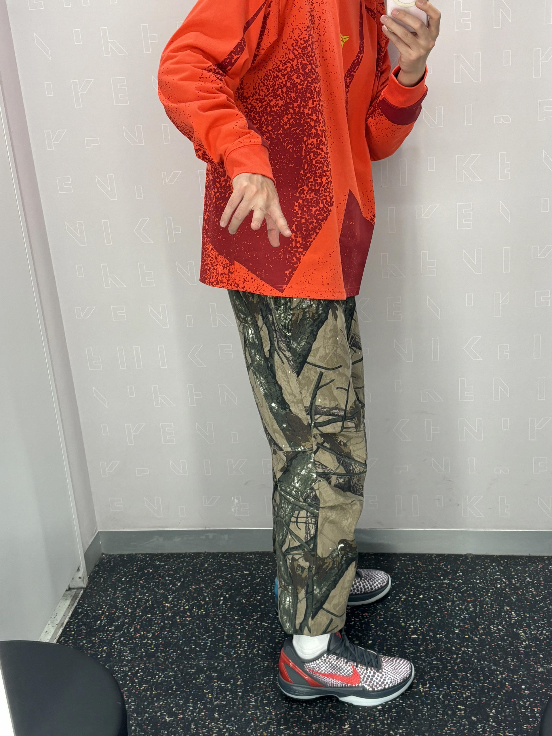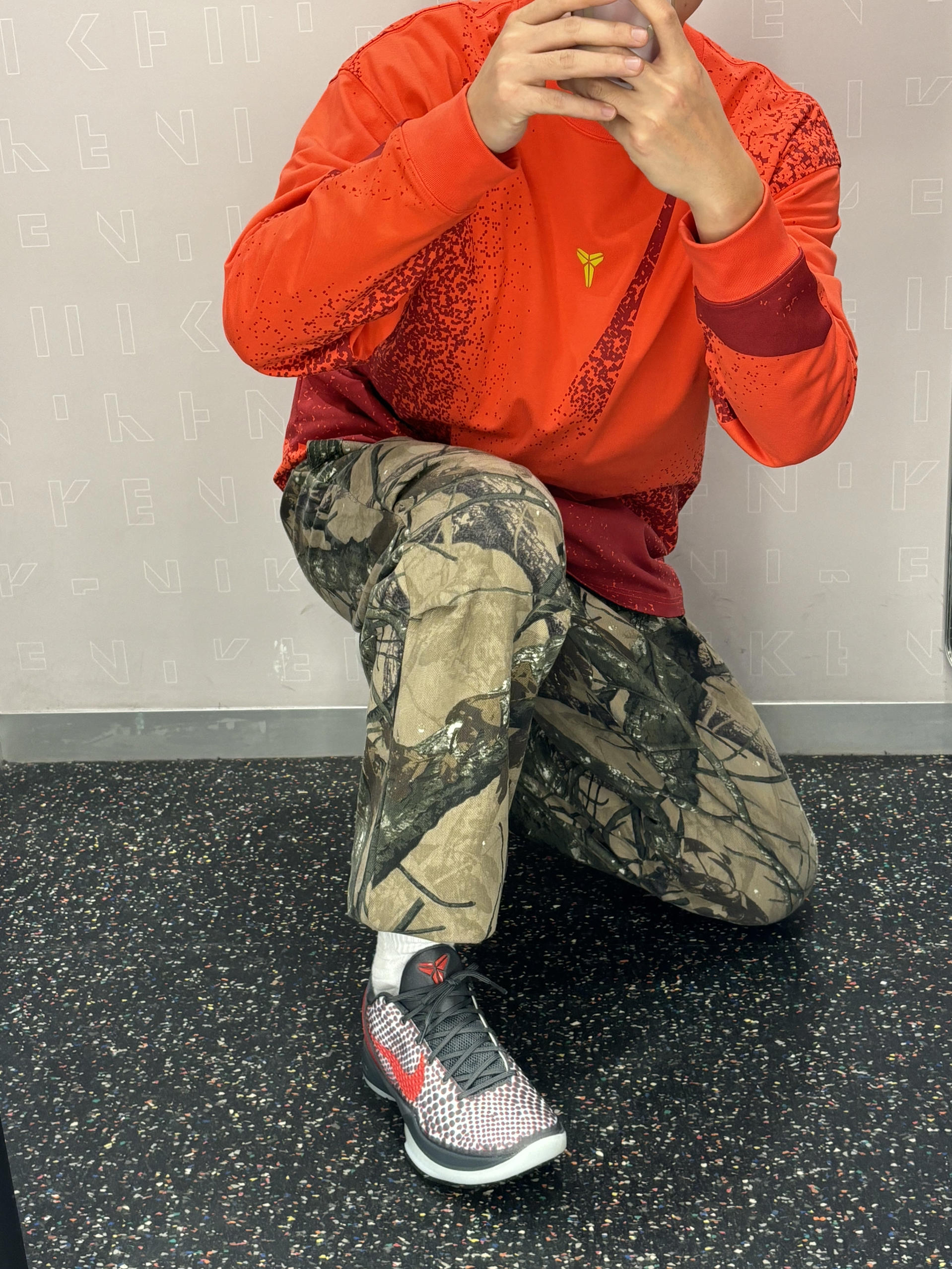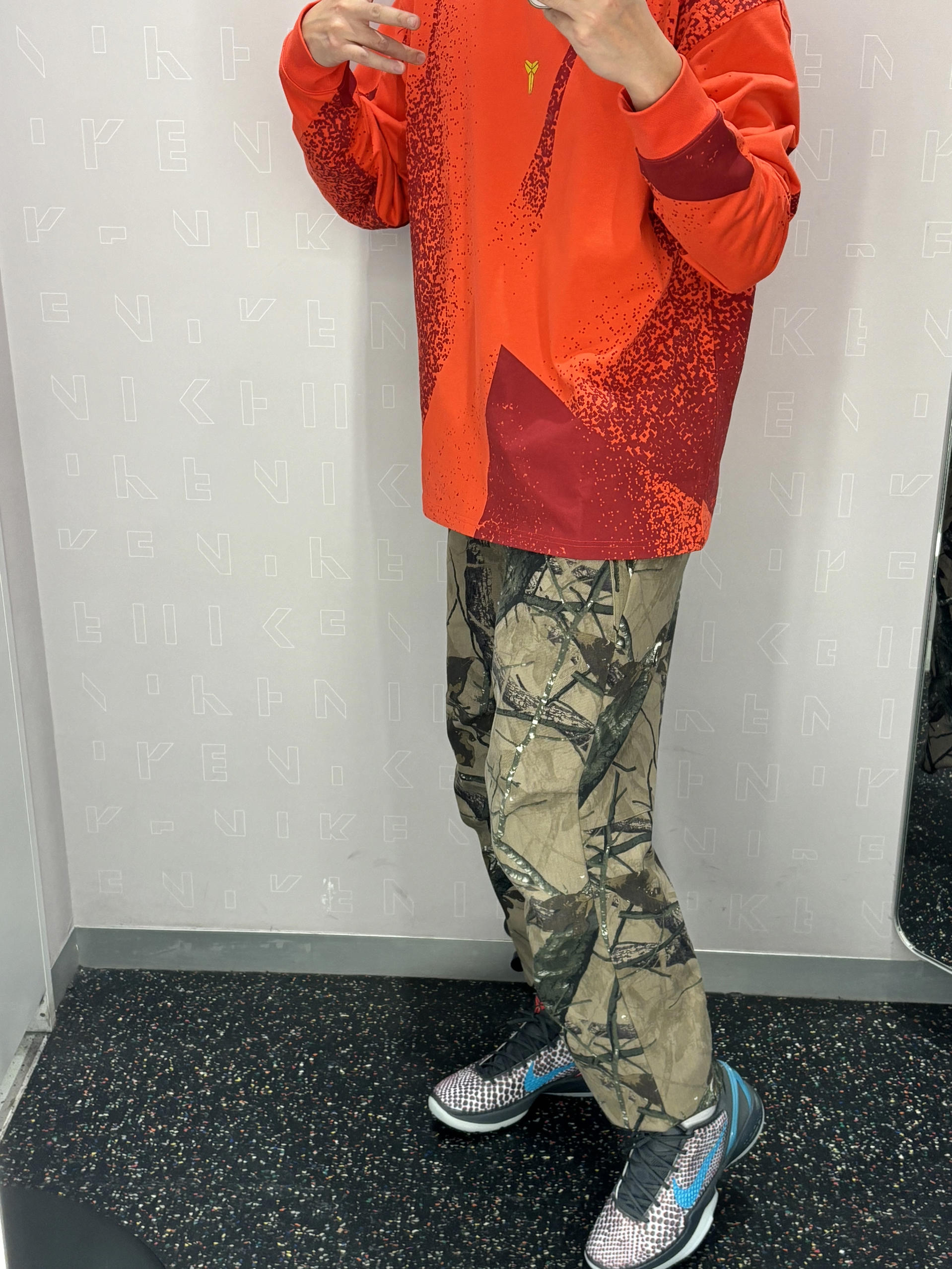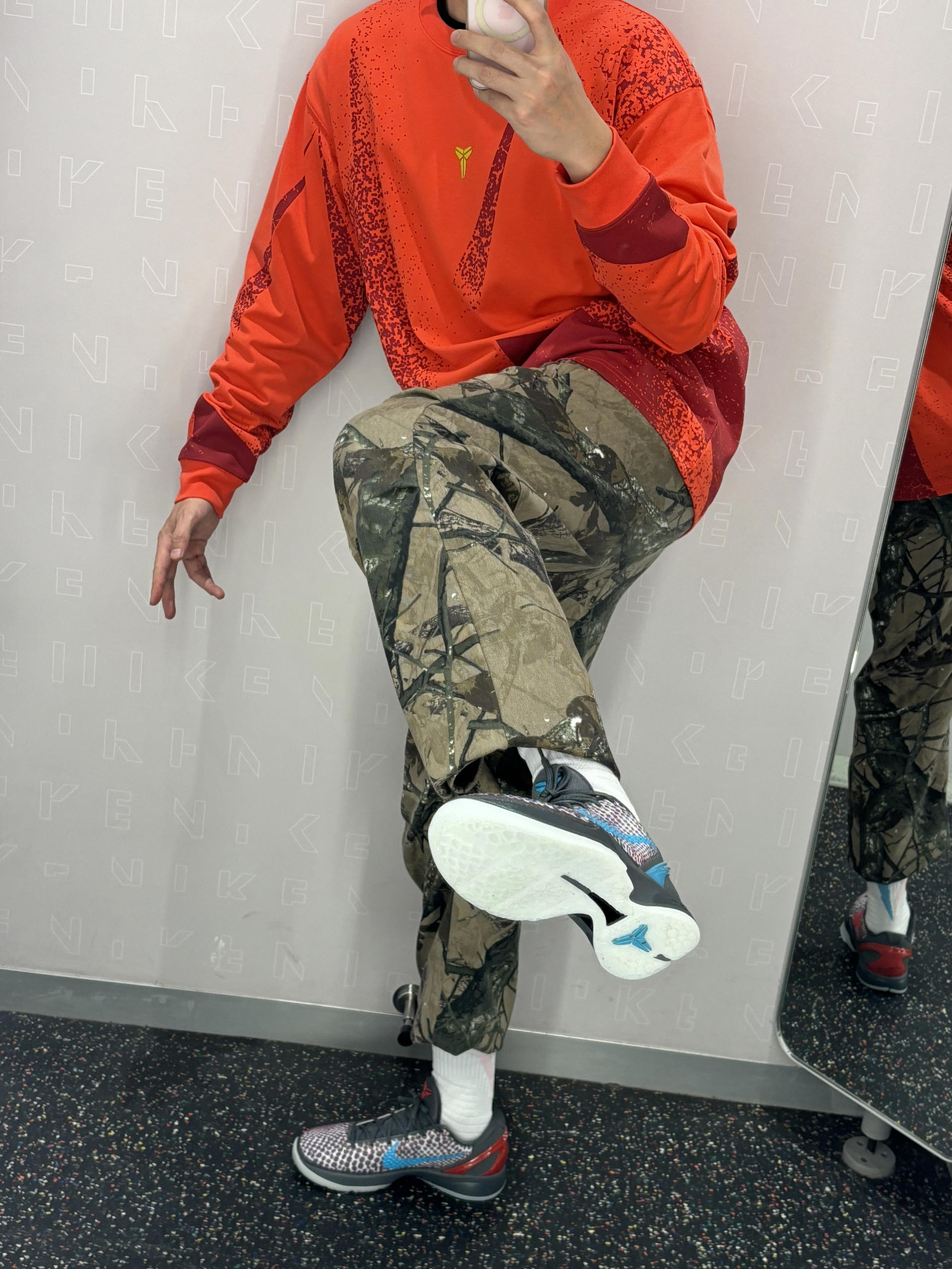 不费力严选神裤 我马年回家就这么穿的 NBA这个迷彩风搭配到体育生身上也很适合 大红色的曼巴卫衣 阴阳处也很得当很高级的处理 红色与绿色的撞色设计 运动户外潮流的感觉 一双科比6裸眼3D红蓝鸳鸯就很帅 这一套就高级还潮流 👔科比曼巴长袖 👖uzis迷彩直筒裤 👟科比6裸眼3D