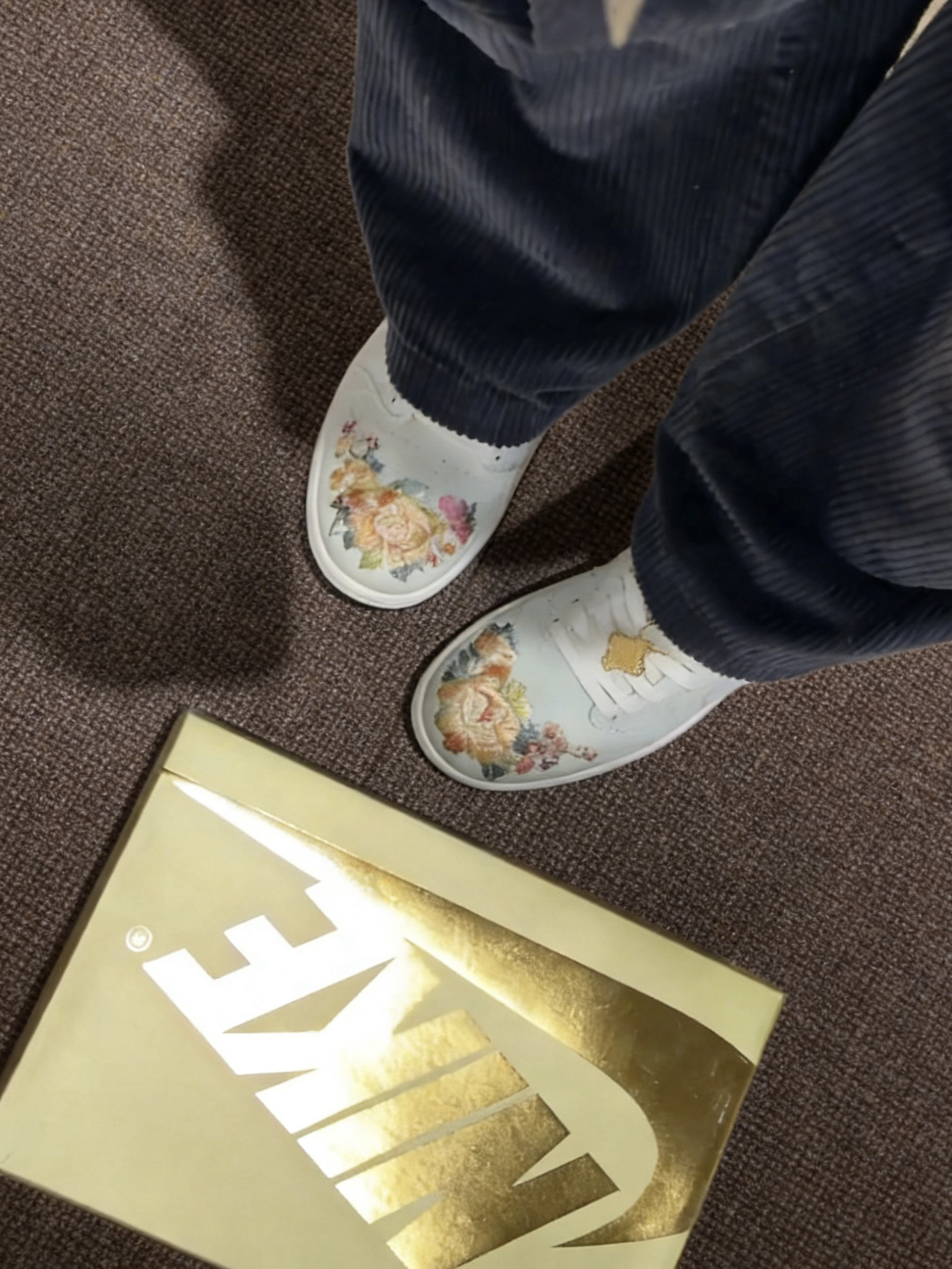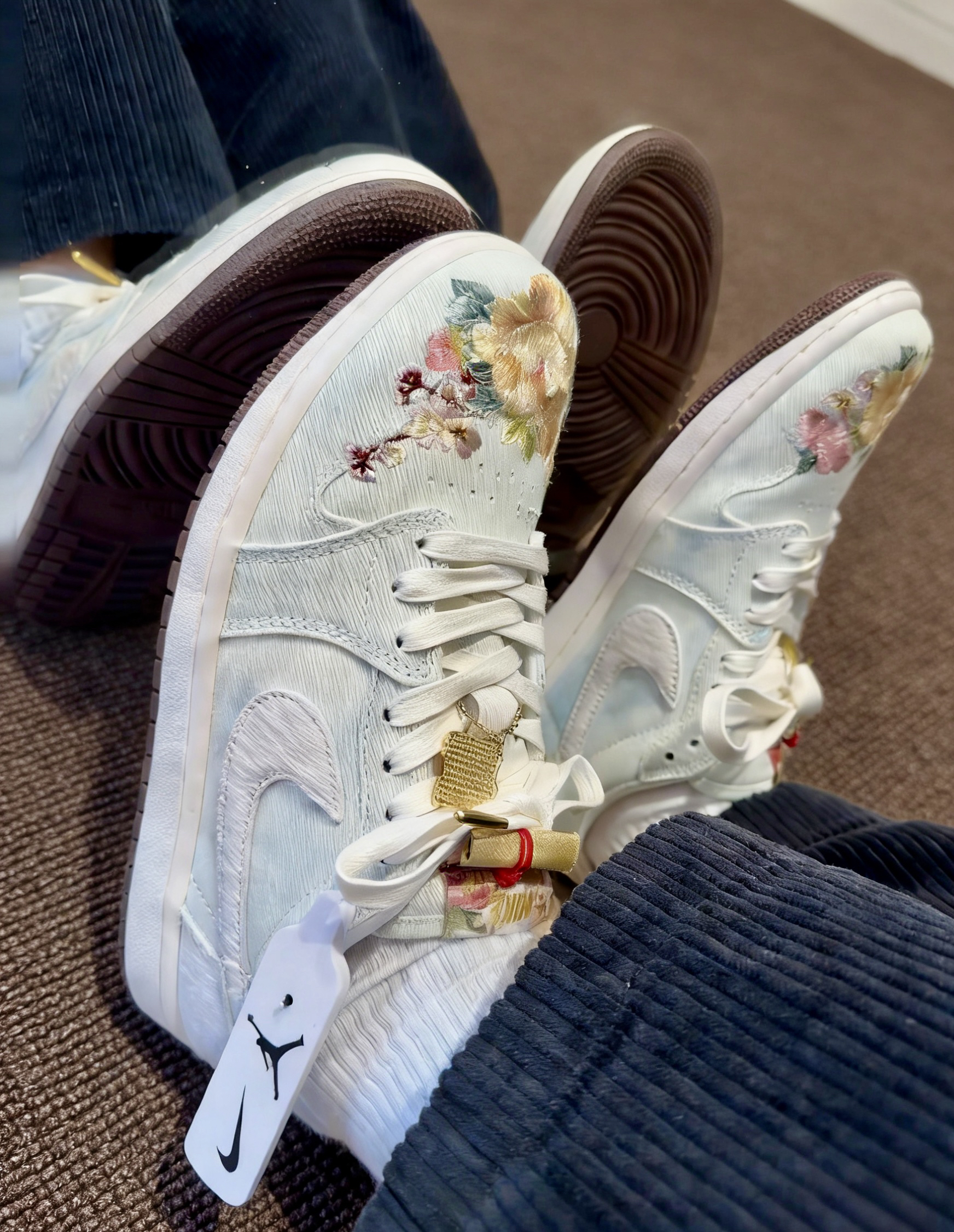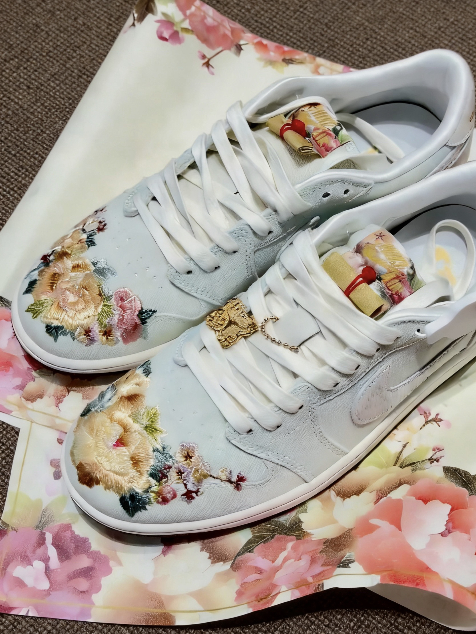 作为马年限定,它把非遗苏绣和“春风得意马蹄疾”的登科寓意玩到了极致: ✅ 鞋面工艺:浅做旧牛仔布基底,鞋头和侧身绣着细腻的牡丹与梅花,金线勾勒的花瓣层次分明,摸上去是苏绣特有的绒感,国风氛围感直接拉满! ✅ 细节彩蛋:鞋舌上的卷轴装饰+红绳小坠,对应“登科后”的书卷气;后跟还有精致的马纹刺绣,暗合马年主题,细节控狂喜! ✅ 版型脚感:经典AJ1 Low OG鞋型,浅做旧中底+深棕色外底,复古感拉满...
