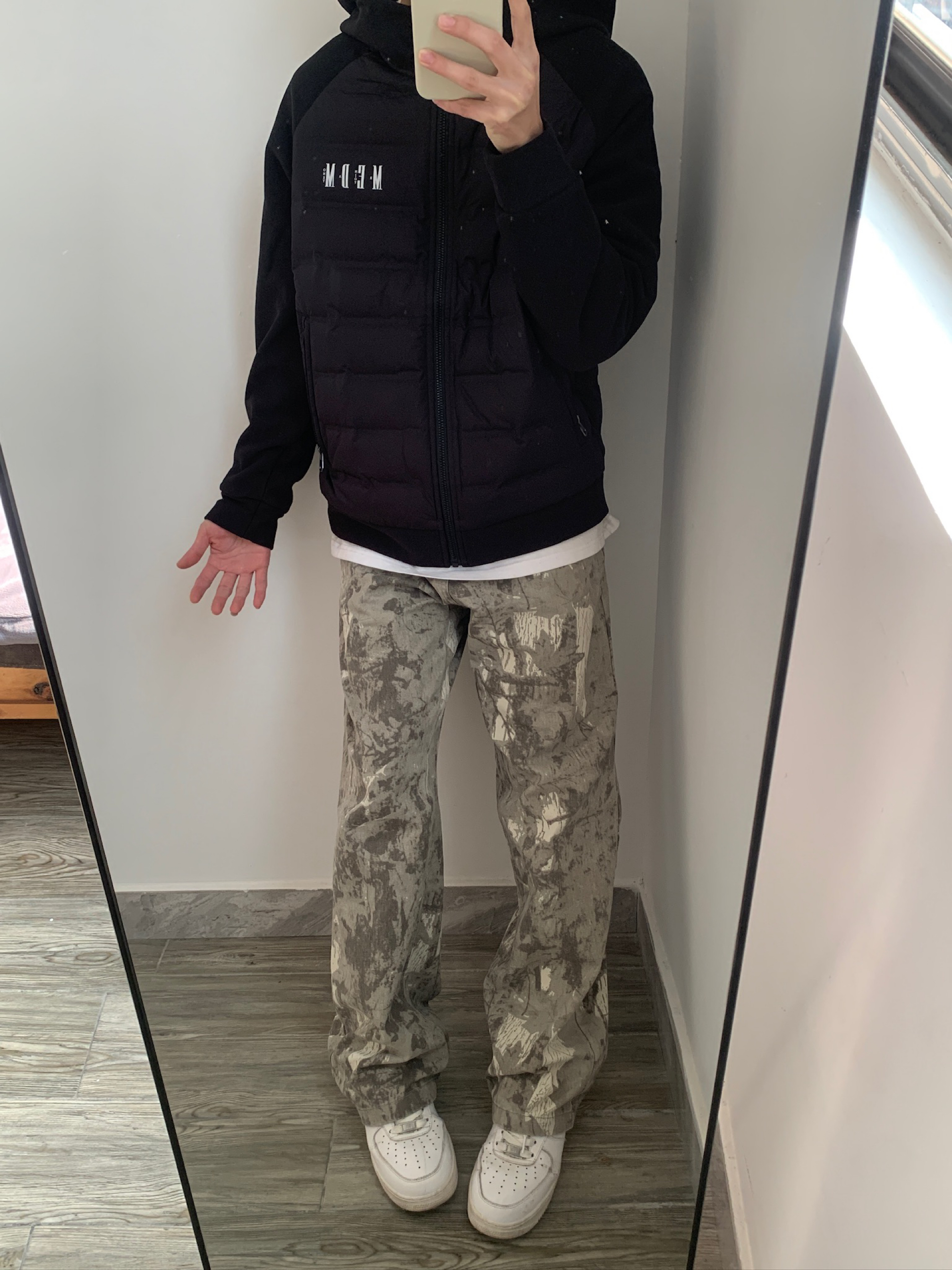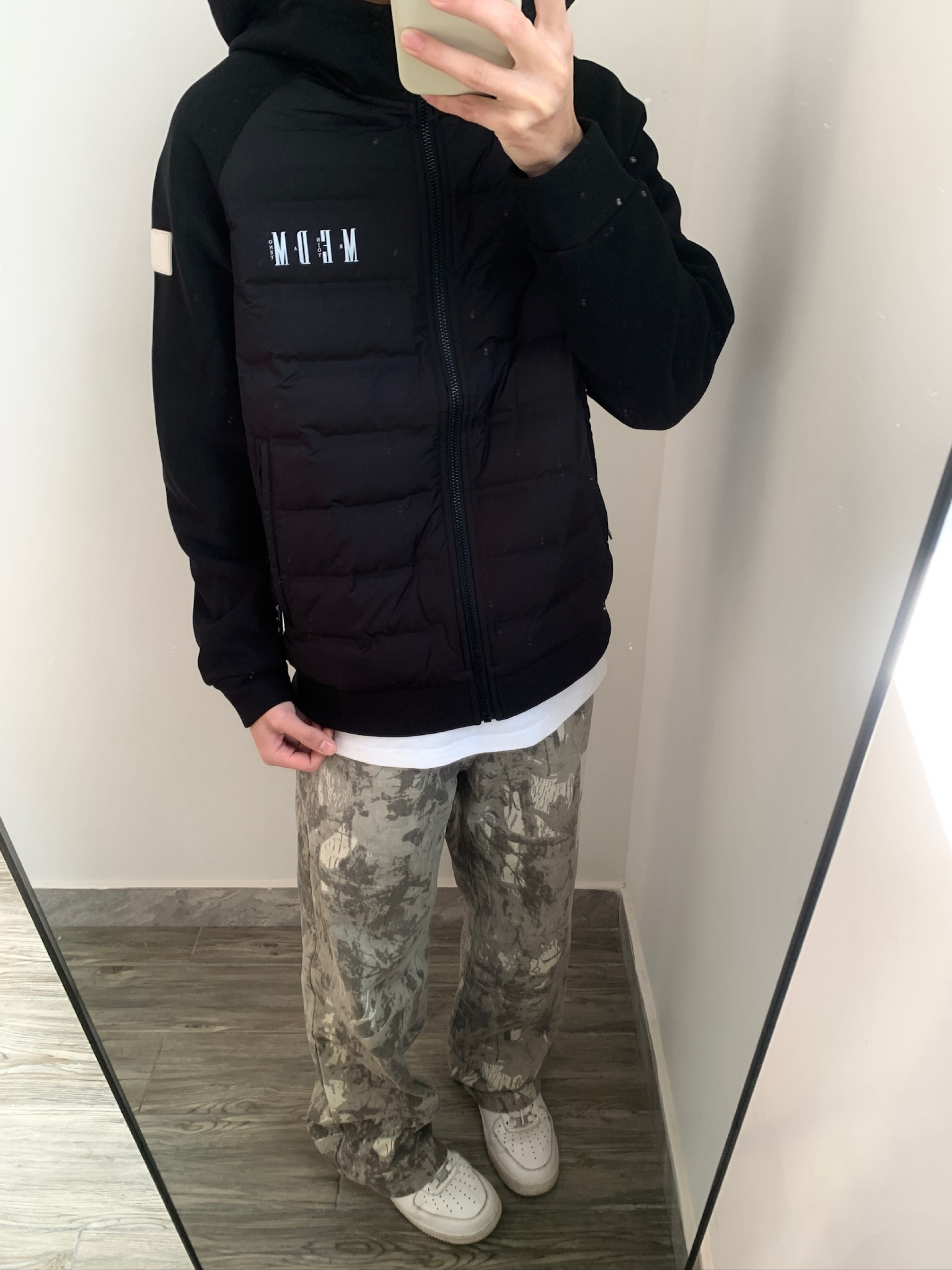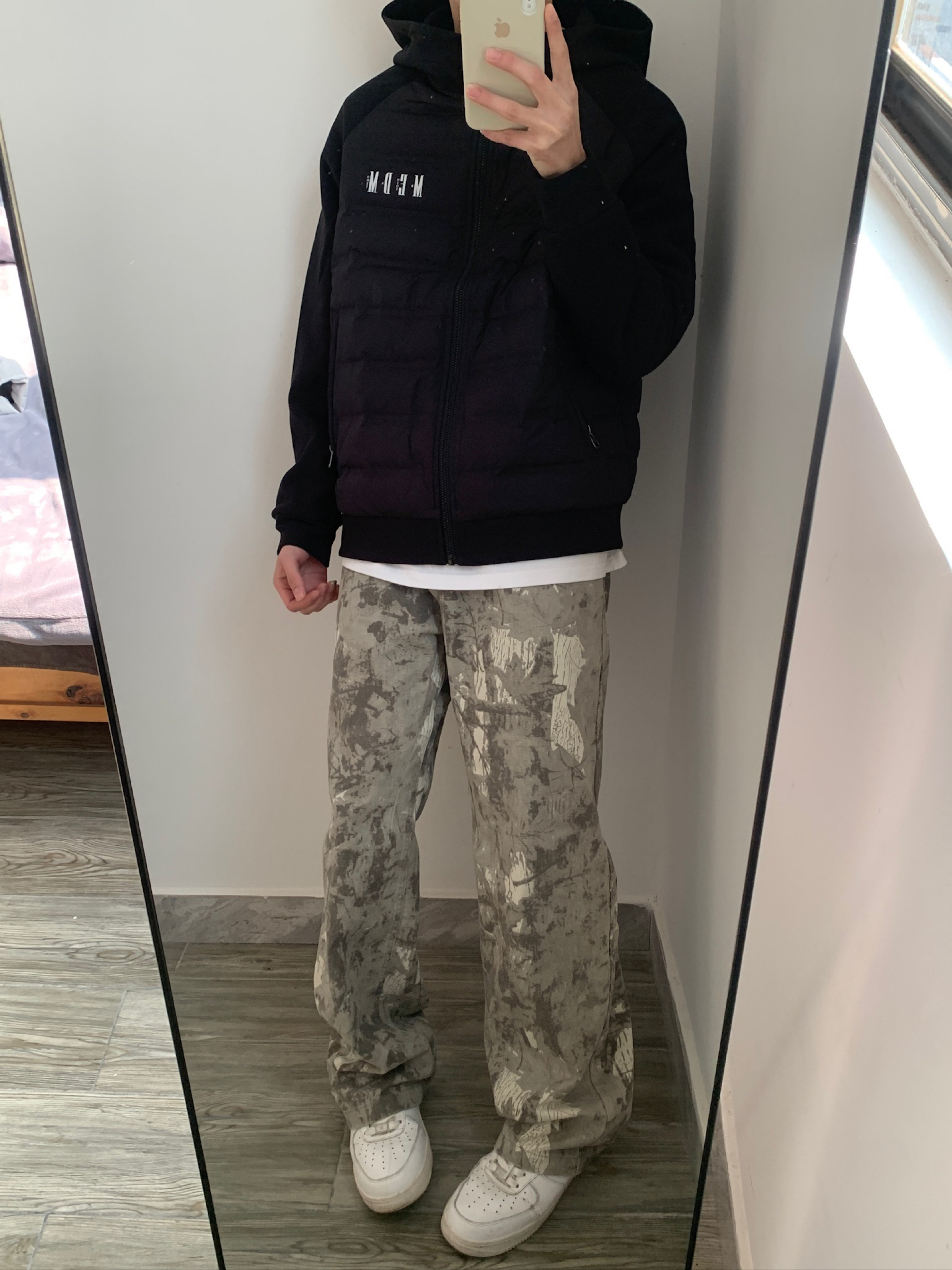 黑灰配色低调不张扬,迷彩元素注入个性,叠穿白T让造型更干净,秋冬街头感穿搭一键get。