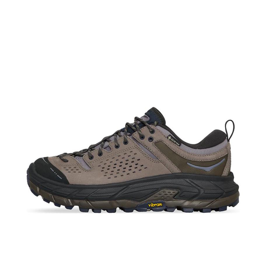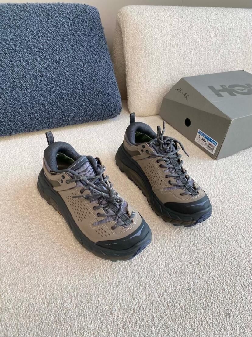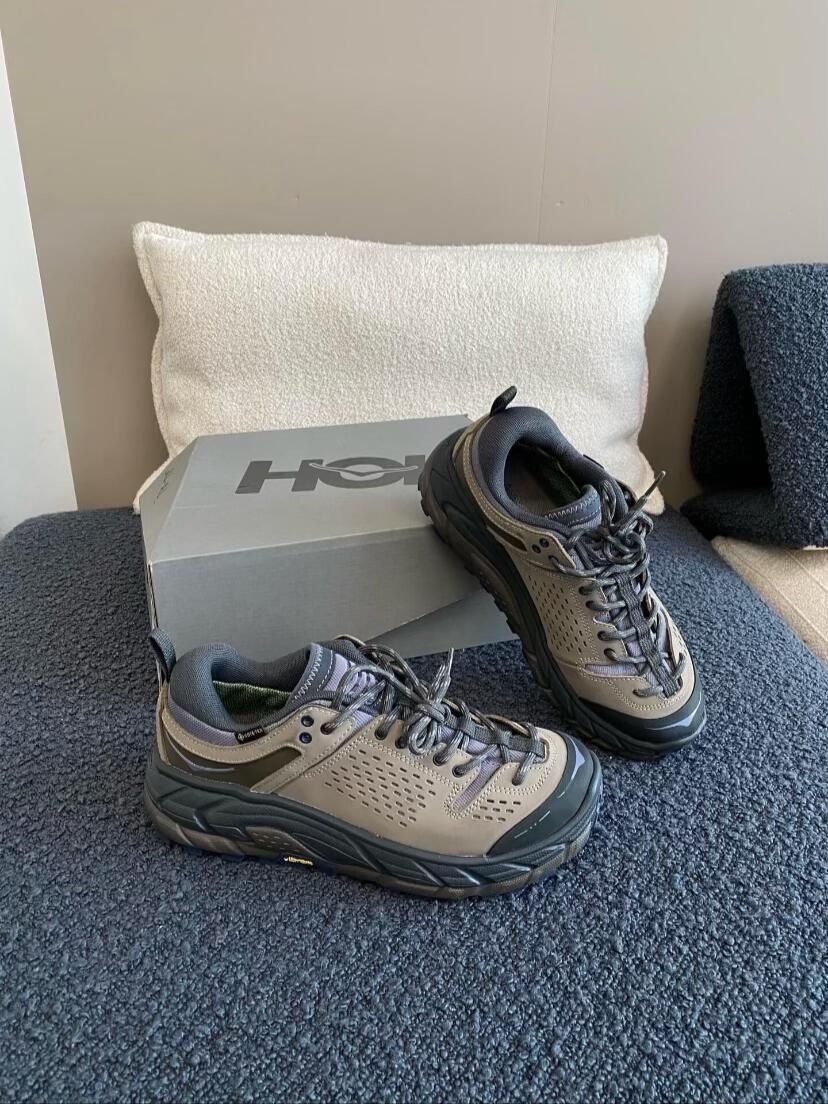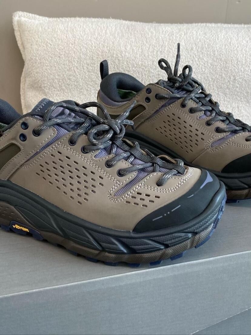 J.L-A.L和hoka one one tor low联名整体采用灰棕色设计,非常低调,鞋身有一些联名的小细节彰显联名的身份,随鞋赠送四幅鞋带可以搭配出自己的个性,Vibram防滑大底,Gore-Tex防水鞋身