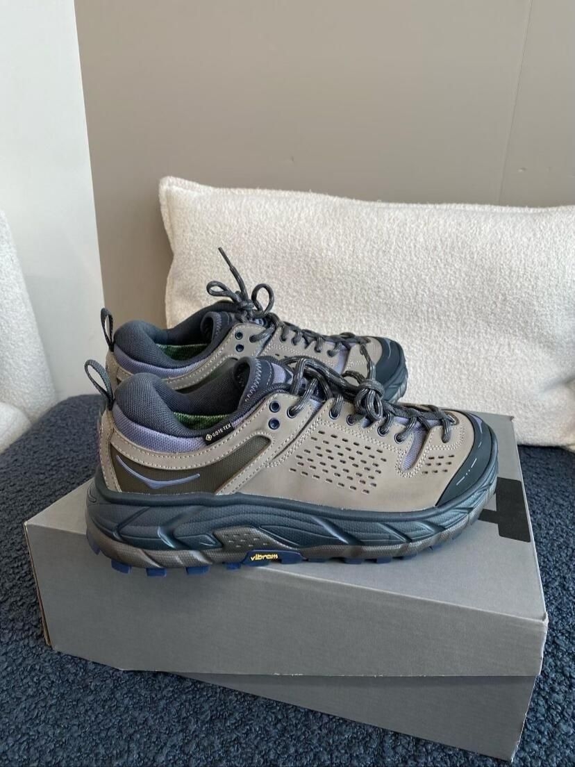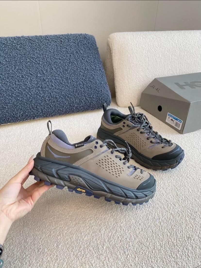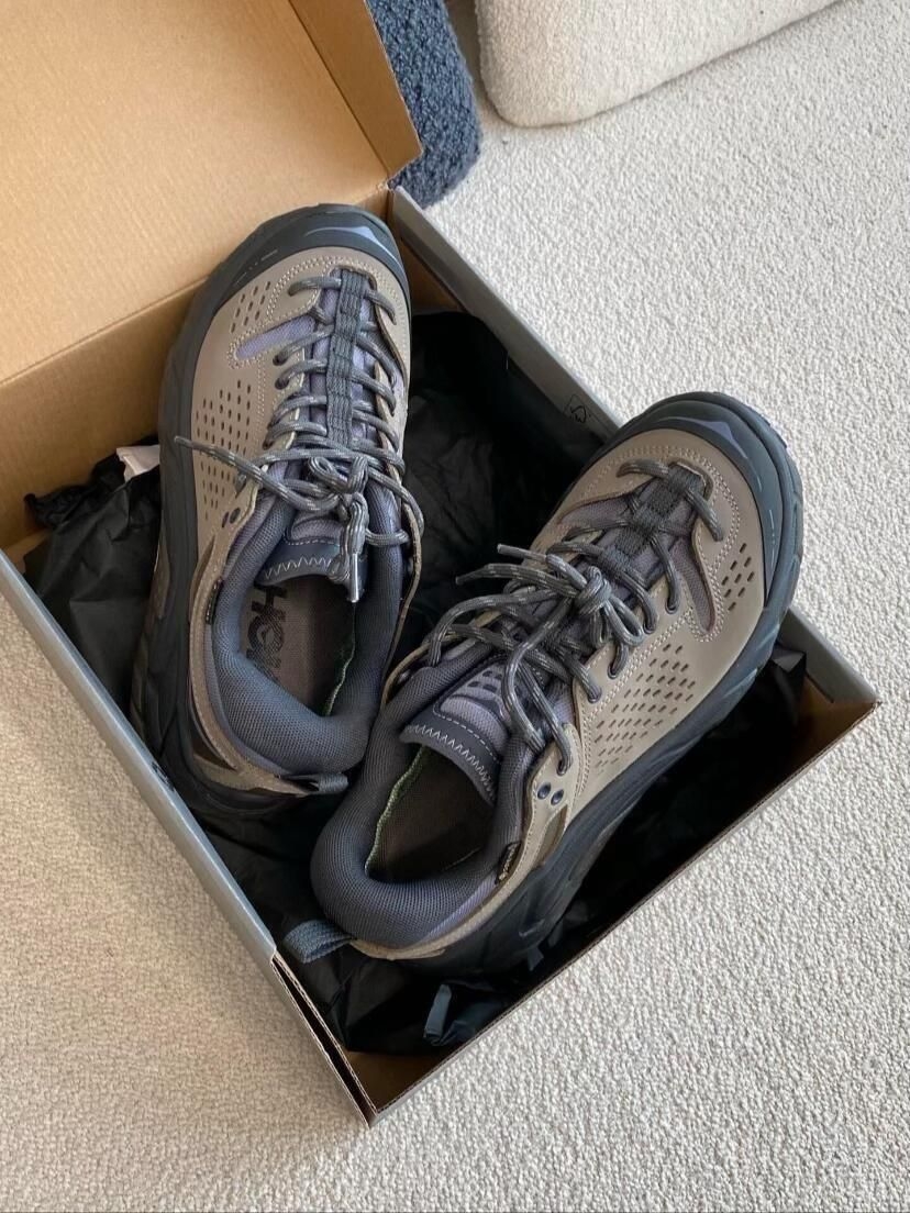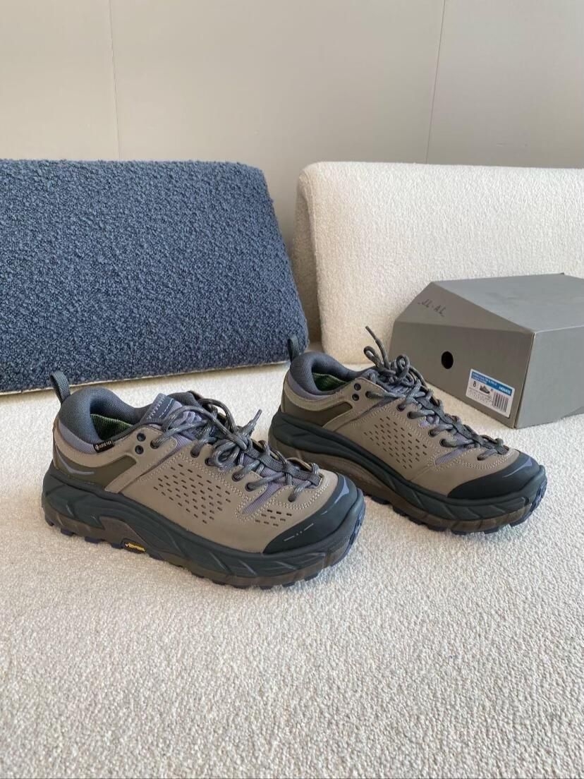 J.L-A.L和hoka one one tor low联名整体采用灰棕色设计,非常低调,鞋身有一些联名的小细节彰显联名的身份,随鞋赠送四幅鞋带可以搭配出自己的个性,Vibram防滑大底,Gore-Tex防水鞋身