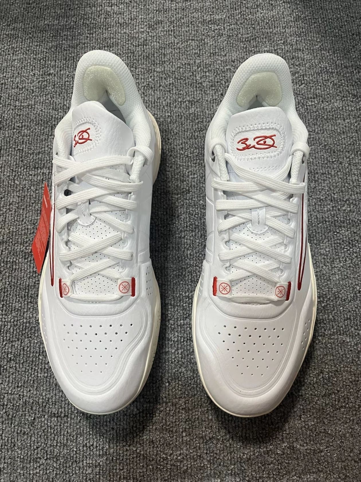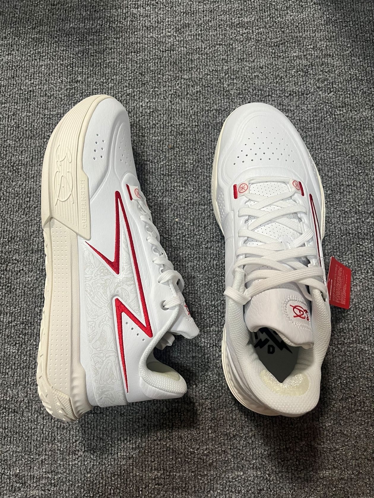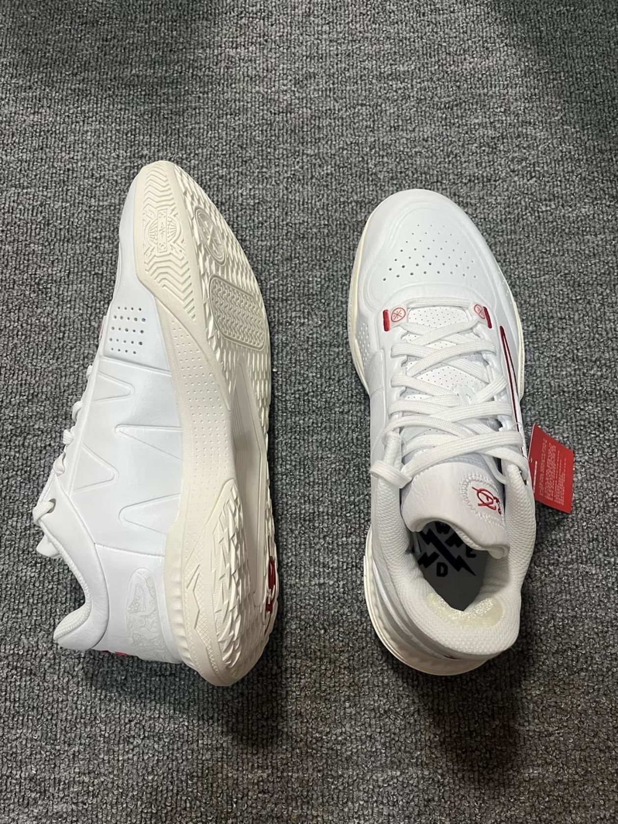 闪电之子是韦德系列新的一个支线 到目前为止也是出到了第三代 拉塞尔在一段时间也是疯狂上脚 这应该是当时拉塞尔的一个版本 整个鞋子是白红搭配 闪电细节满满 有着韦德正代的非常的图案 后跟的老WADE标志也是回忆 鞋身上的韦德元素也是比较多