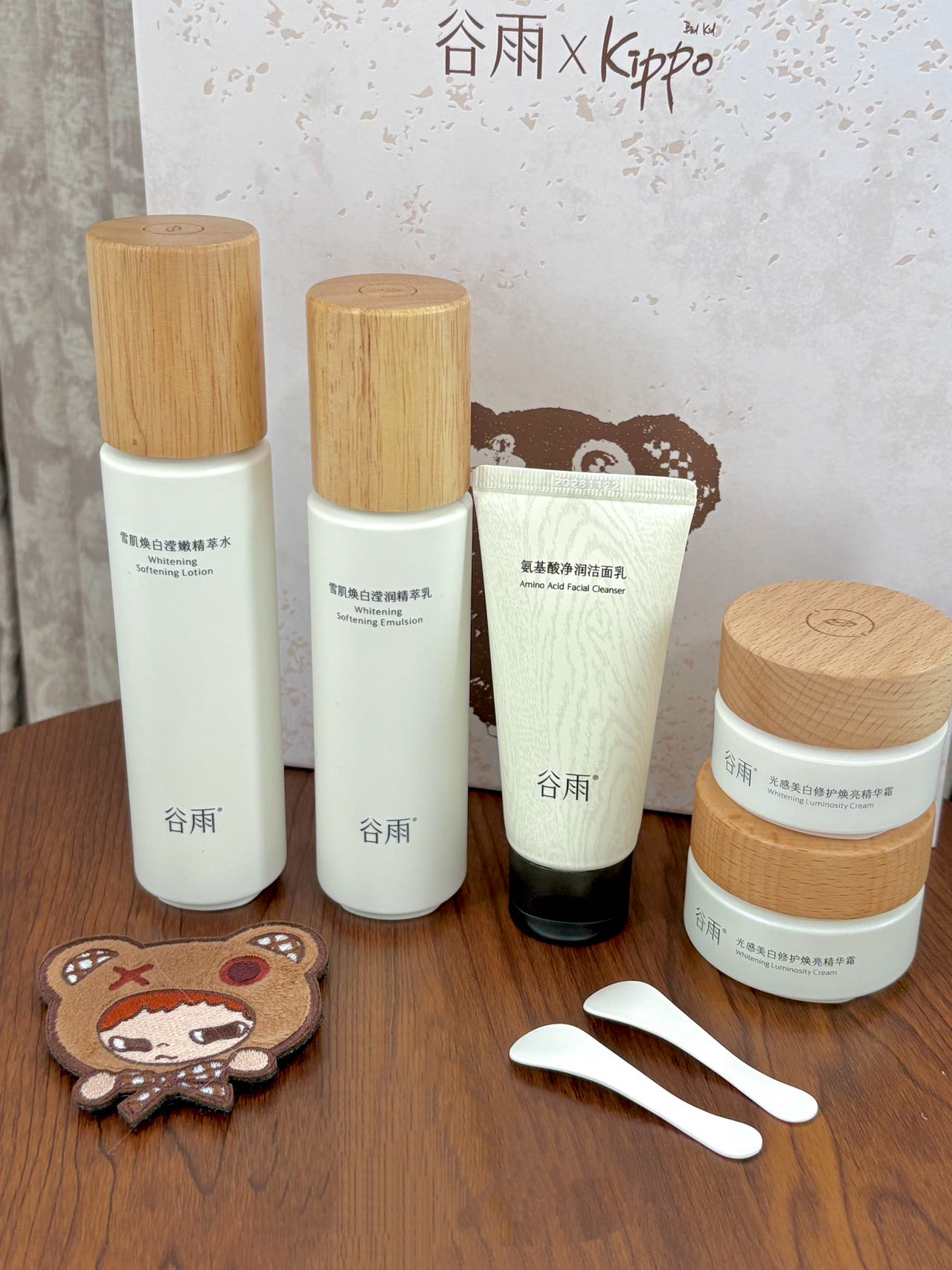谁懂我最爱的IP和我最爱的护肤品出联名啦 Kippo周边好萌好萌 刘海贴洗脸的时候贴上不会掉头发 打开有水乳 面霜 洁面 小样和周边✨ 质地我试了下都敲清爽用着肤感挺不错的 可以在特别暗沉的地方厚涂 坚持使用 小脸都透亮啦不少 我觉得蛮适合冬天哒 我这个混油皮冬天用着刚刚好 谷雨和Kippo联名礼盒设计感满满 作为盲盒爱好者真的好喜欢这次联名! 新年刚好给闺闺安排上 她也会hin喜欢吧~🥰 #谷...