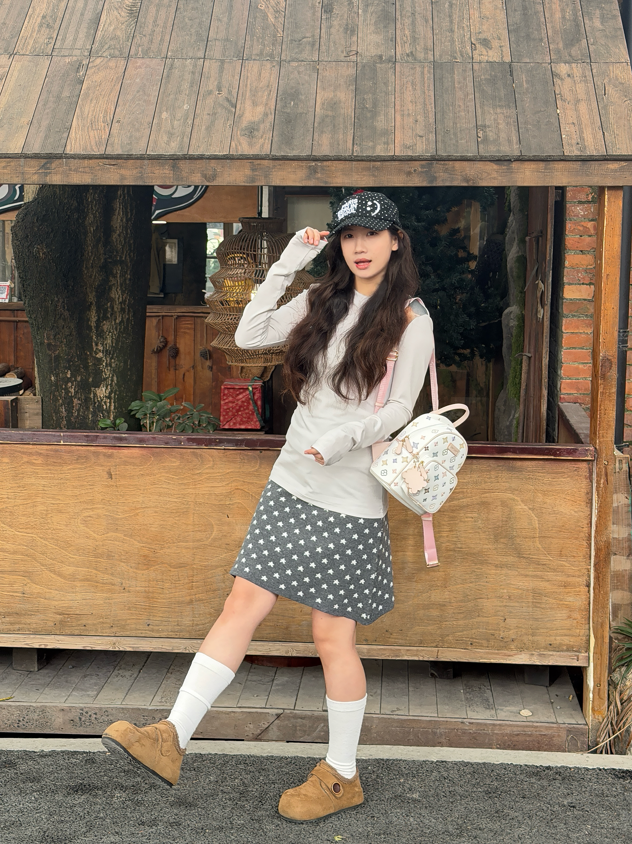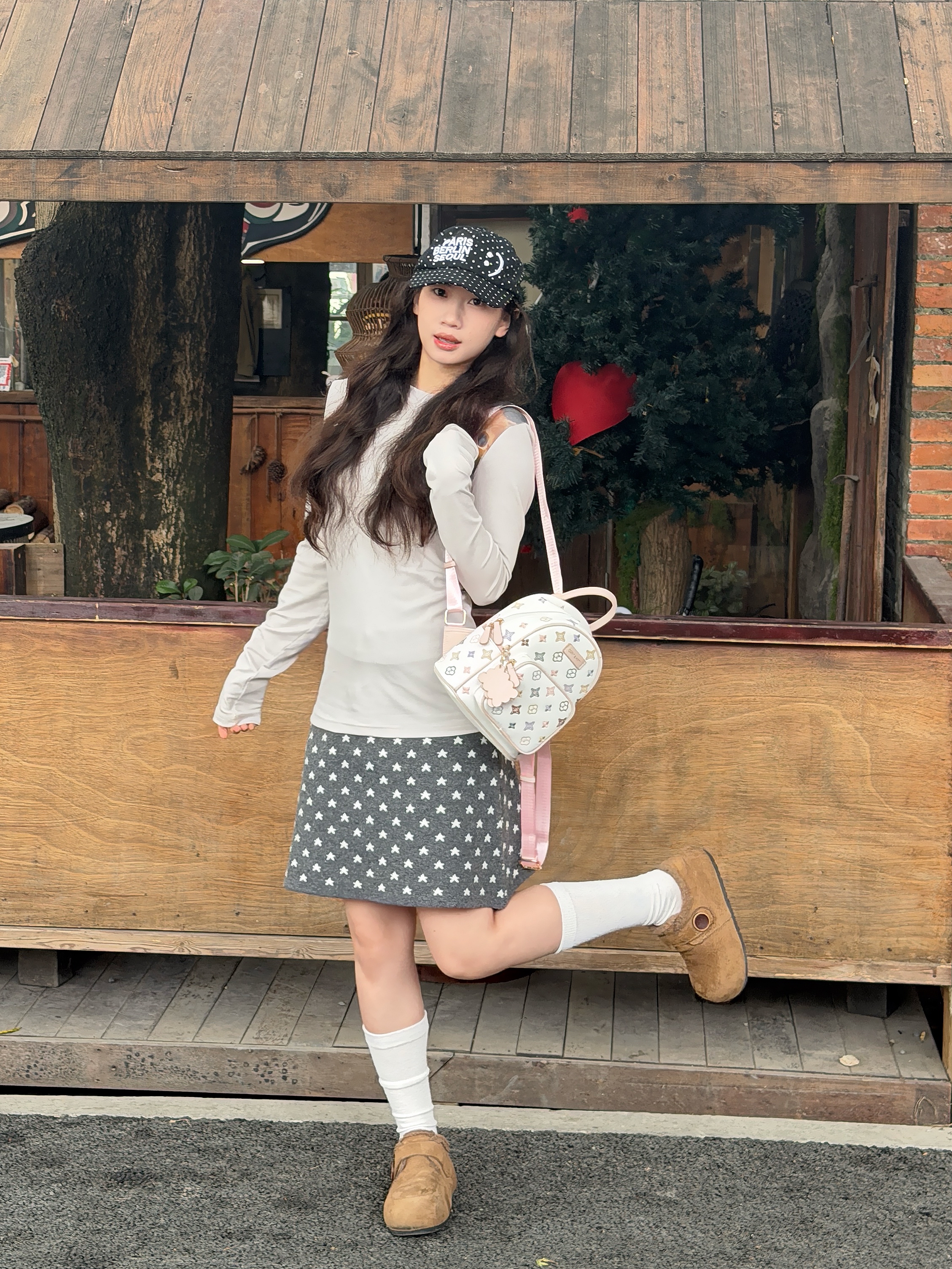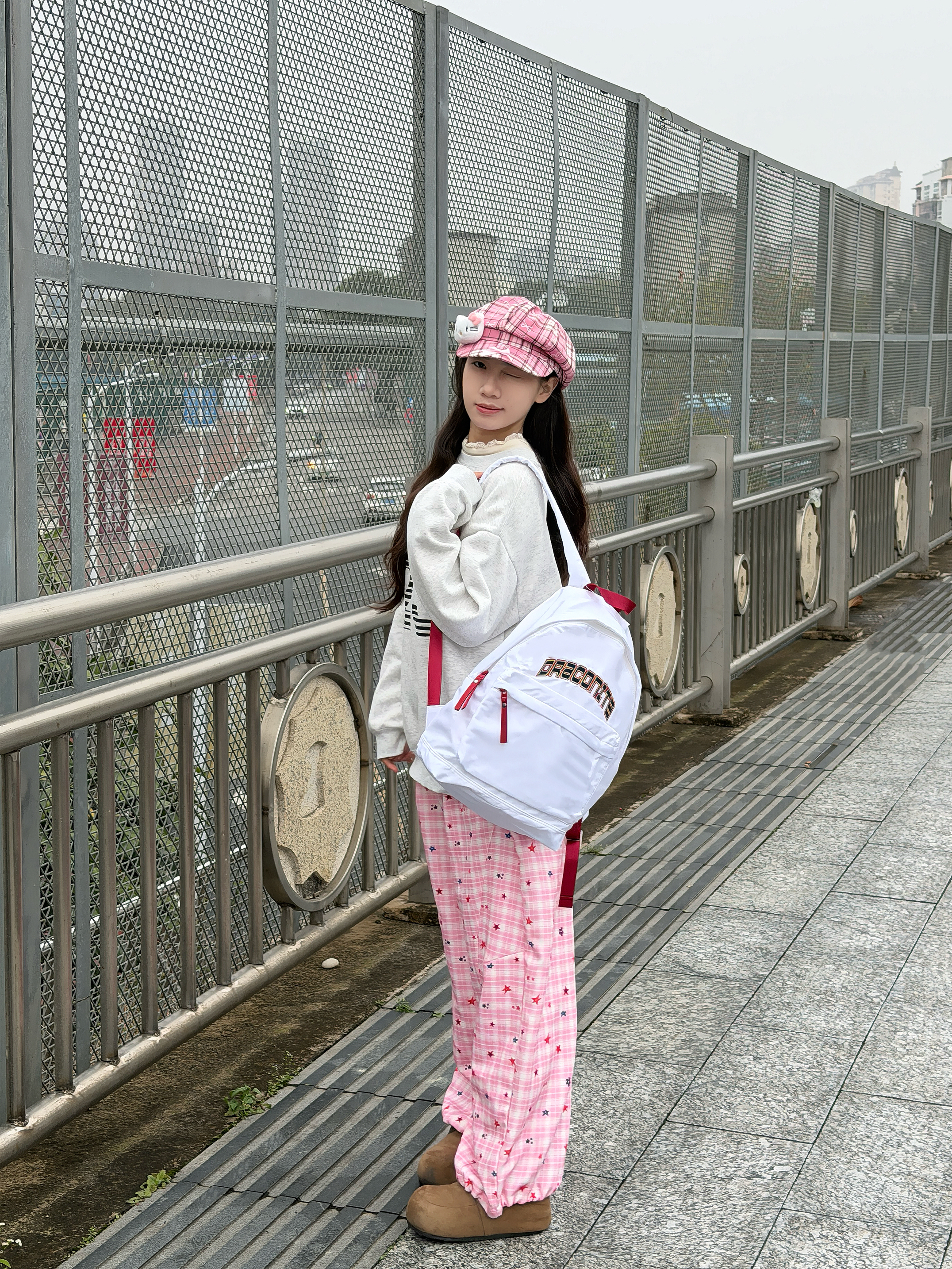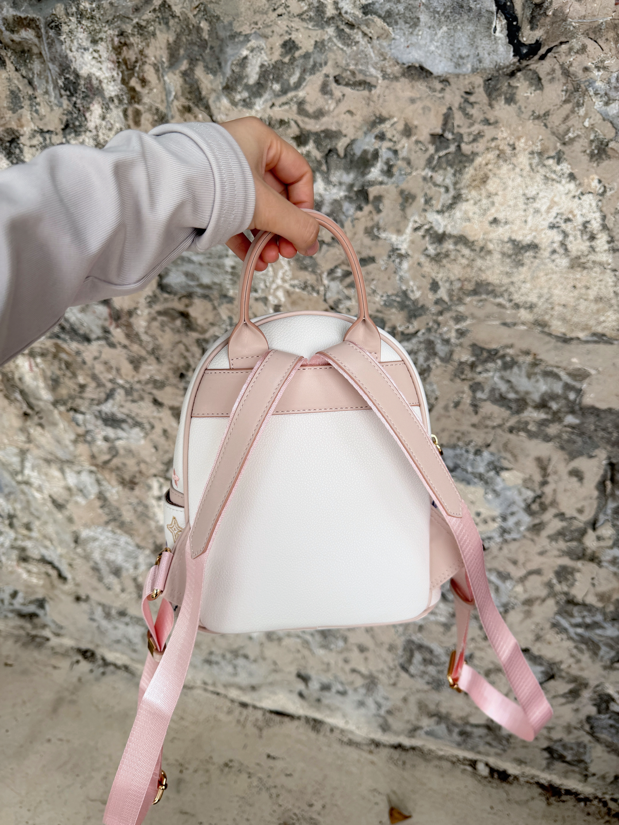 是我喜欢的粉白色调~上手很轻便,背上没有重力感 大小刚刚好,出门逛街玩耍装物品足够啦! 包包是皮质的比较好清洁好适合秋冬呀~