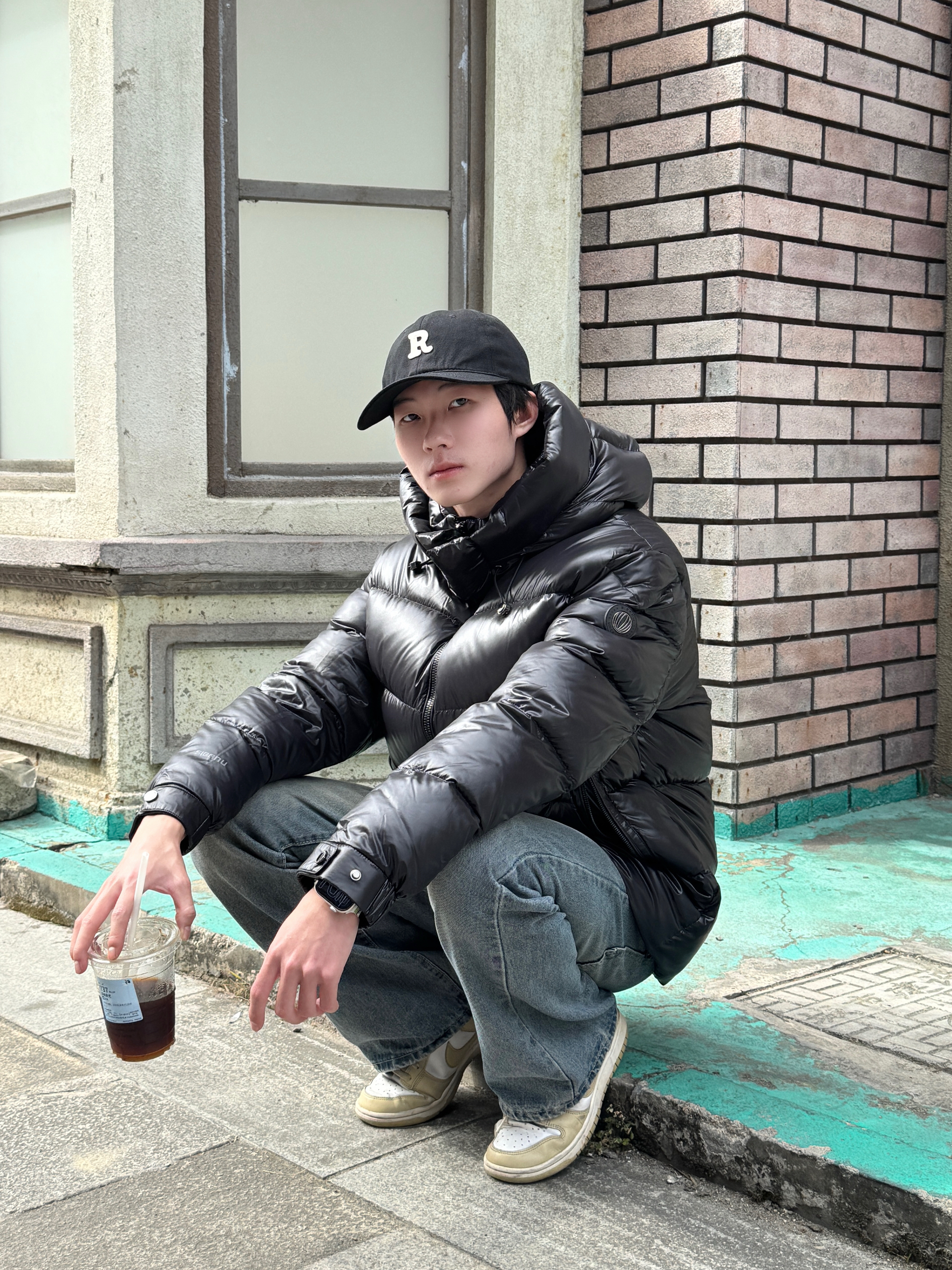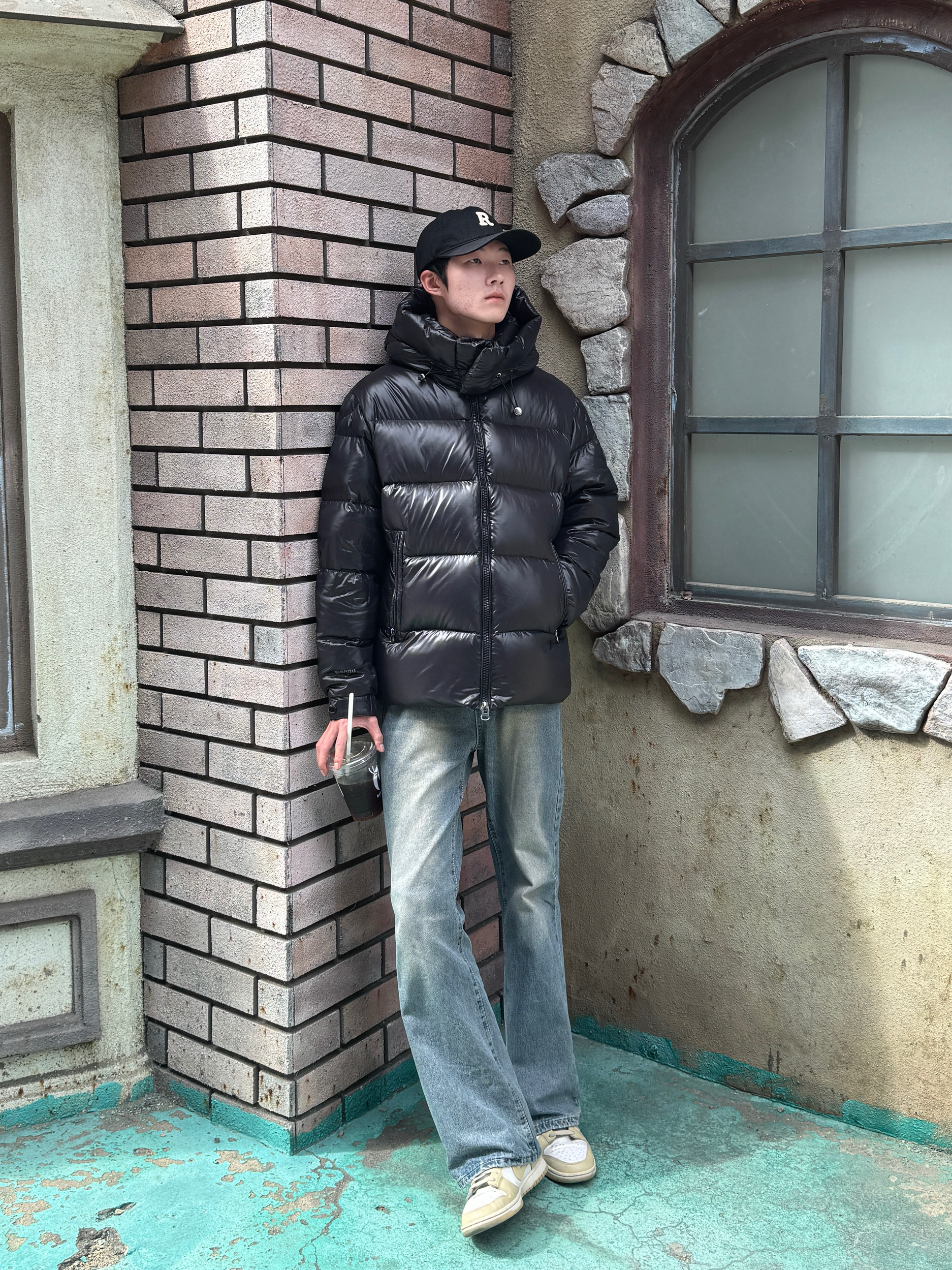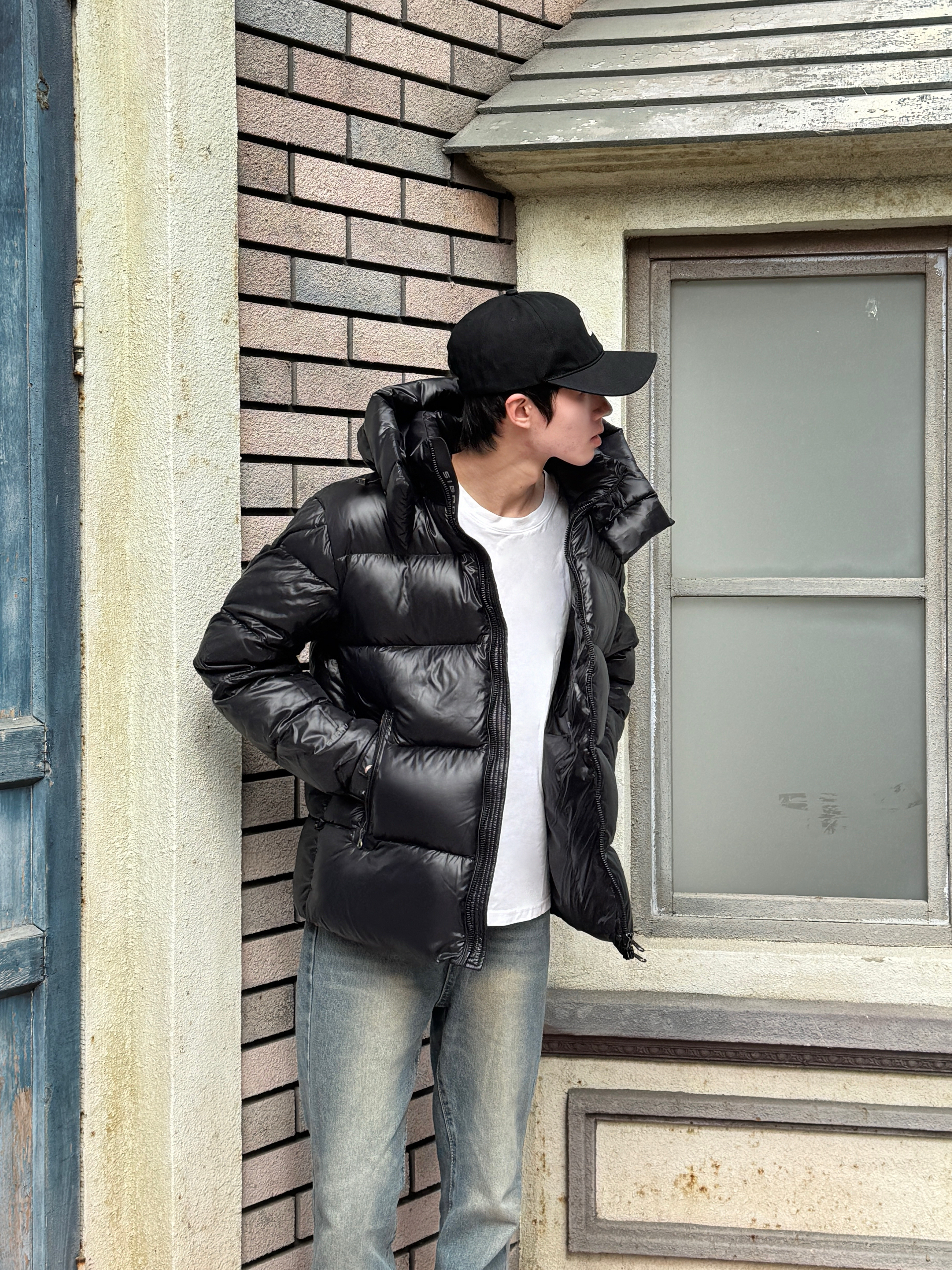 这身出门直接被朋友问链接 黑色亮面羽绒服超有未来感 光线一照绝了✨ 内搭简单干净的白T 露出一点边边就很有层次 下身是经典水洗蓝牛仔裤 修身但不紧绷 整身黑蓝白配色超利落 亮面材质打破沉闷 冬天穿保暖又不无聊~🕶️