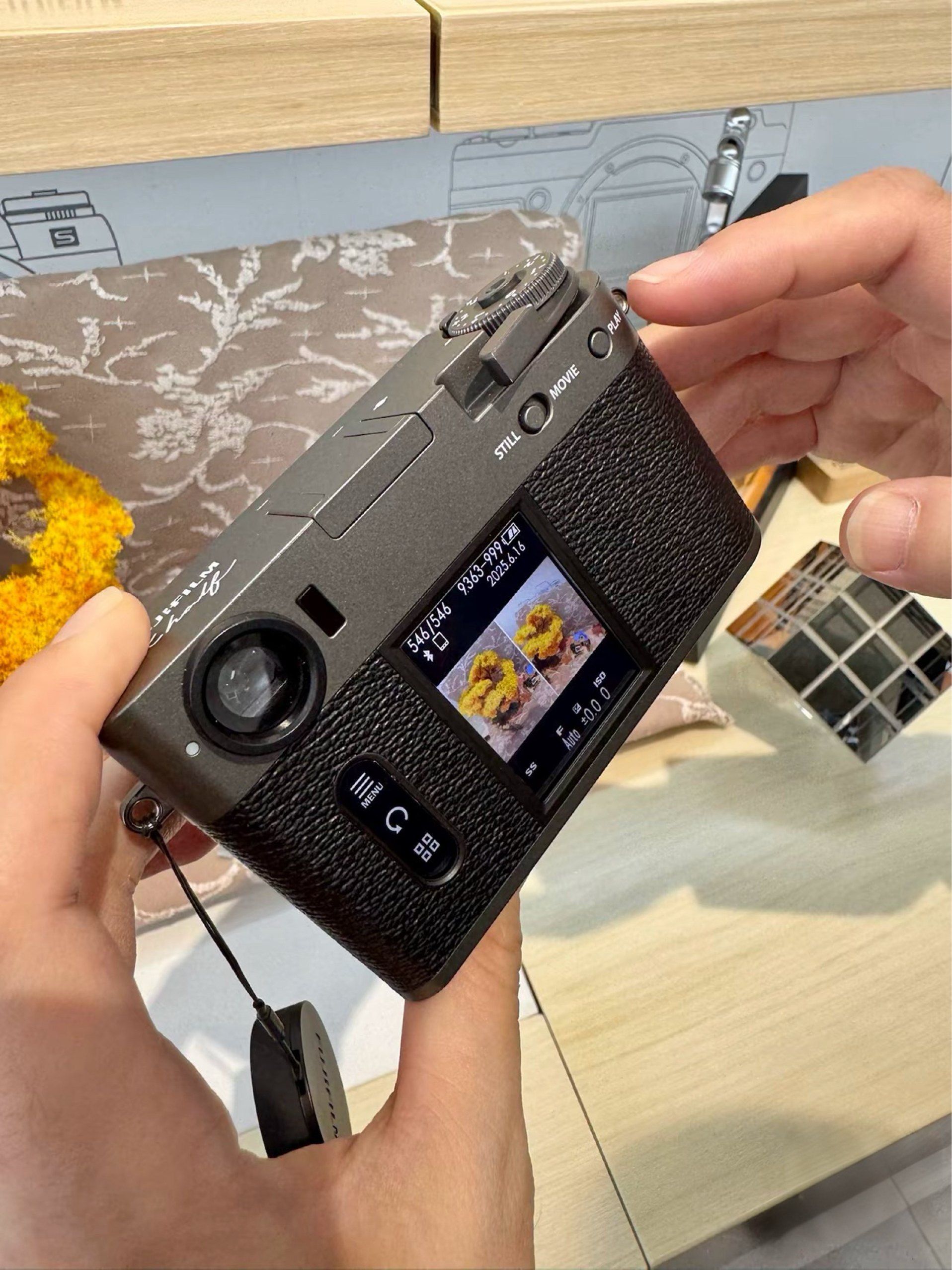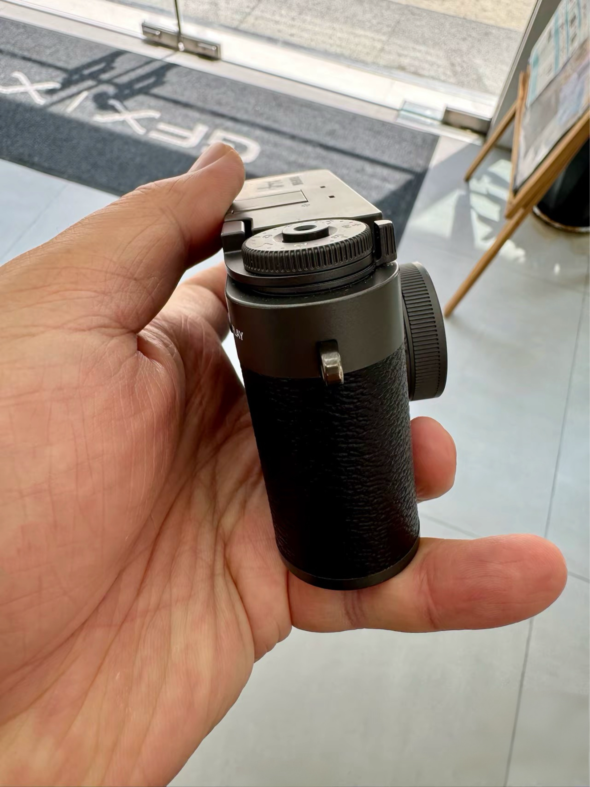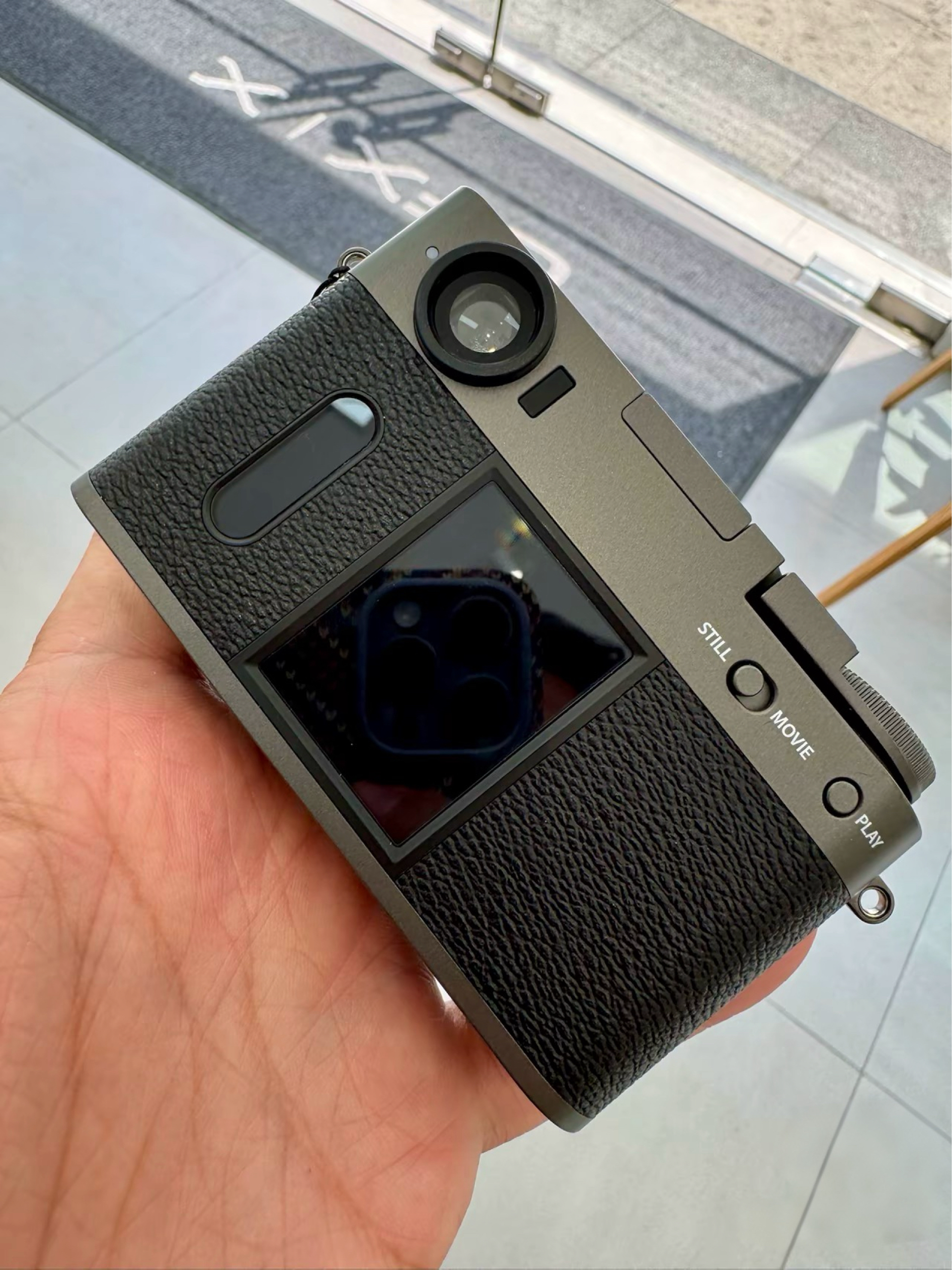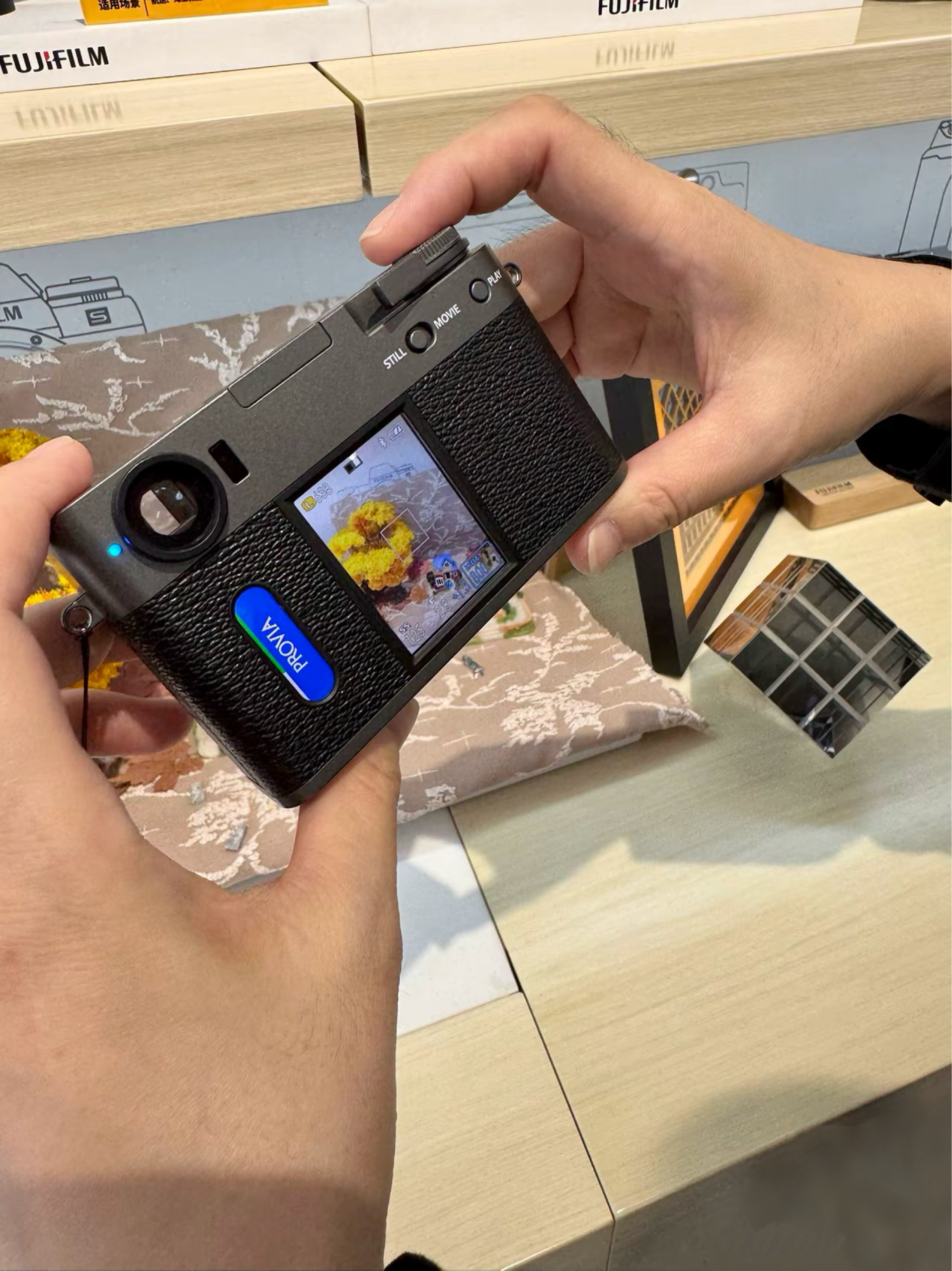 想剁手了!今儿在相机店把玩富士X half,金属质感的机身配上复古皮纹,看着就像台老式金属胶片机。实际重量很轻,摊在掌心也就巴掌2/3大小。1英寸底搁手机里算大底,放相机里真不算啥,但拧动过片拨杆的咔嗒声、13种胶片模拟滑屏切换的手感,玩起来比手机多了不少机械仪式感和新奇乐趣。 哎呀,真机上手真有现场剁手的冲动啊!