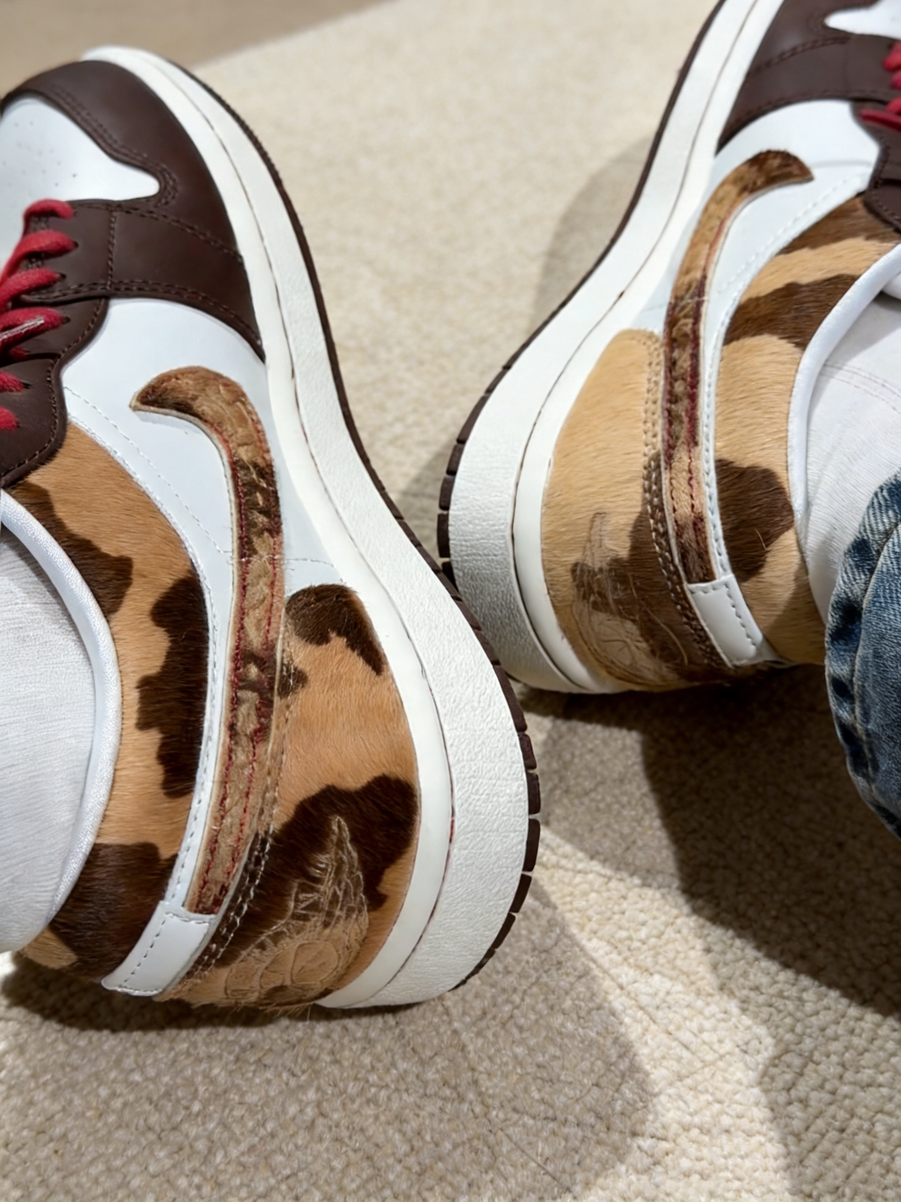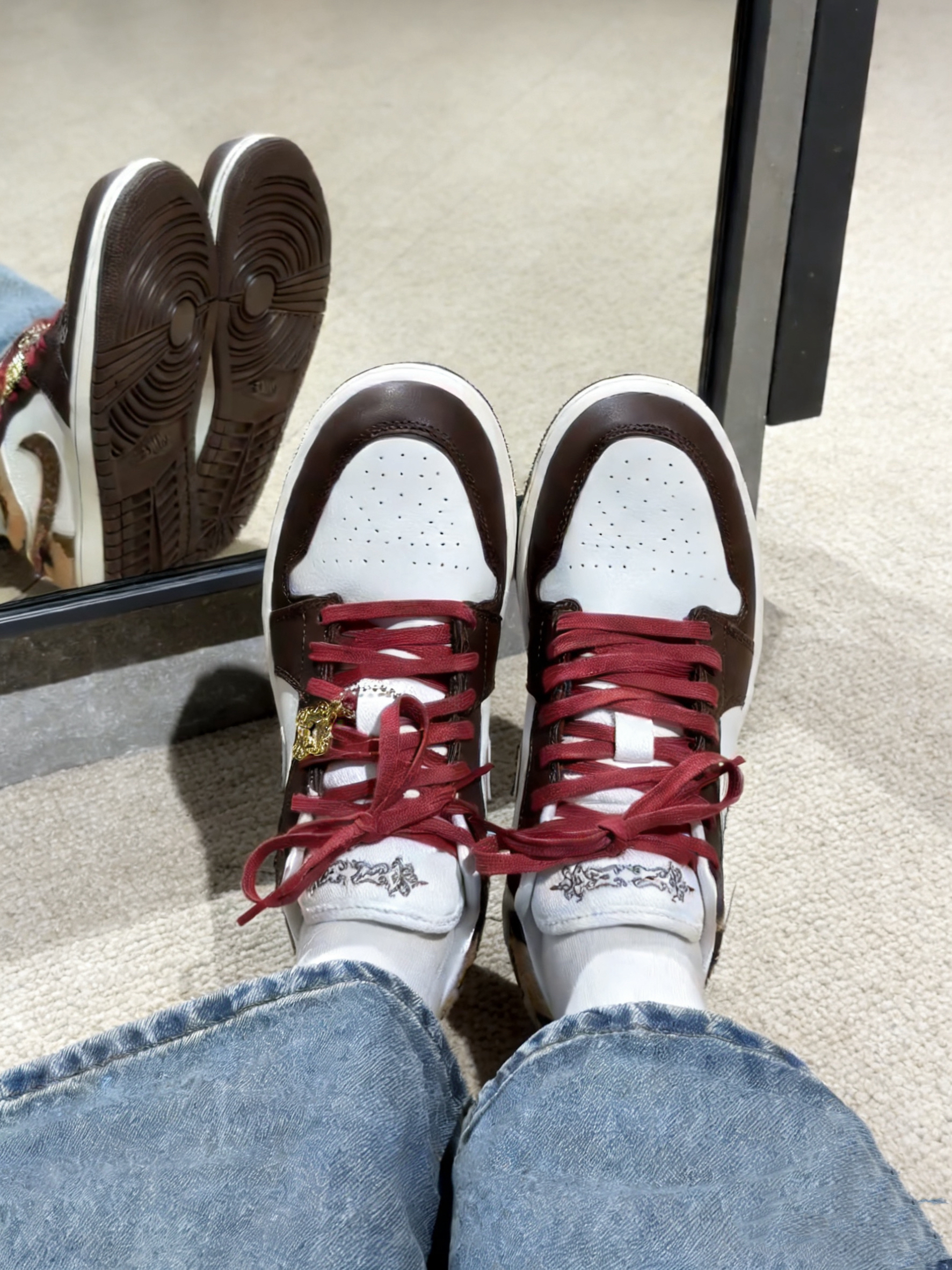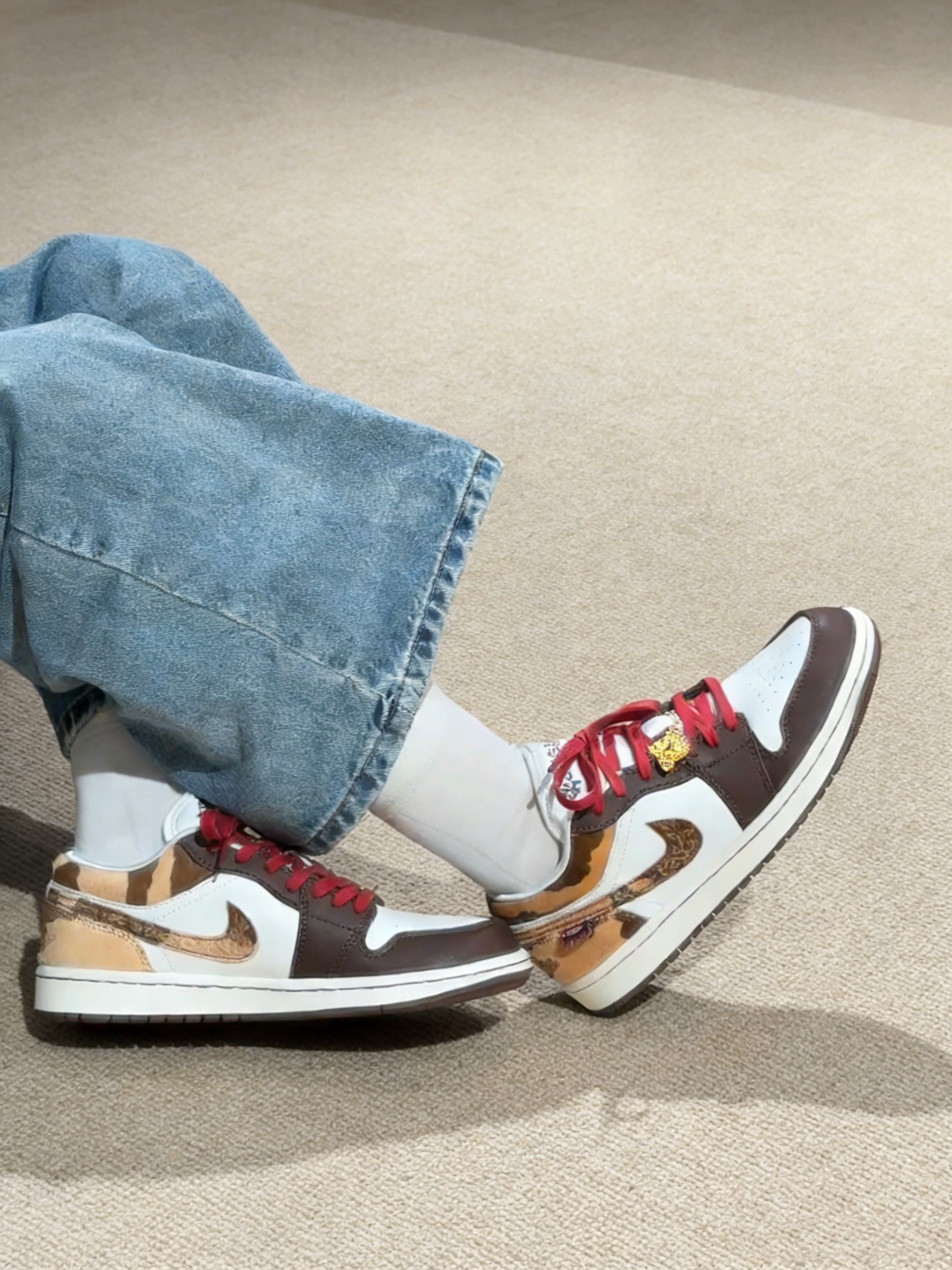 1️⃣配色灵感:深棕+奶白的复古撞色,像一块刚出炉的巧克力奶糕,温柔又高级,完全不挑皮 2️⃣材质亮点:鞋身采用马毛拼接,摸起来毛茸茸的质感拉满,新年穿它自带“富贵感” 3️⃣刺绣细节:金色祥云刺绣Swoosh,寓意“马上有喜”,后跟的红色Jordan标签更是点睛之笔,年味直接溢出屏幕 4️⃣鞋带巧思:正红色鞋带呼应新年主题,随便一系都很出片,还能换成白色鞋带解锁不同风格