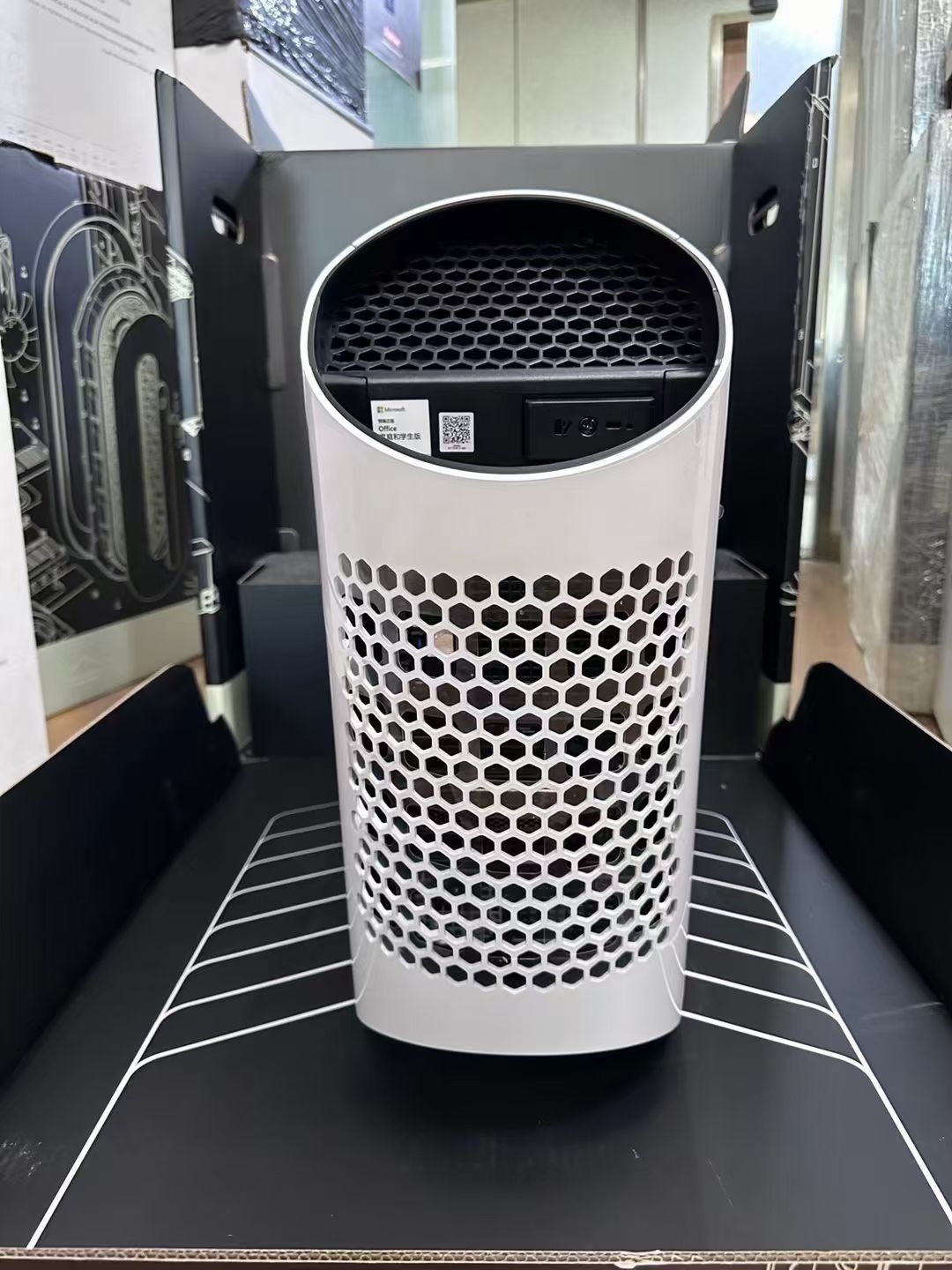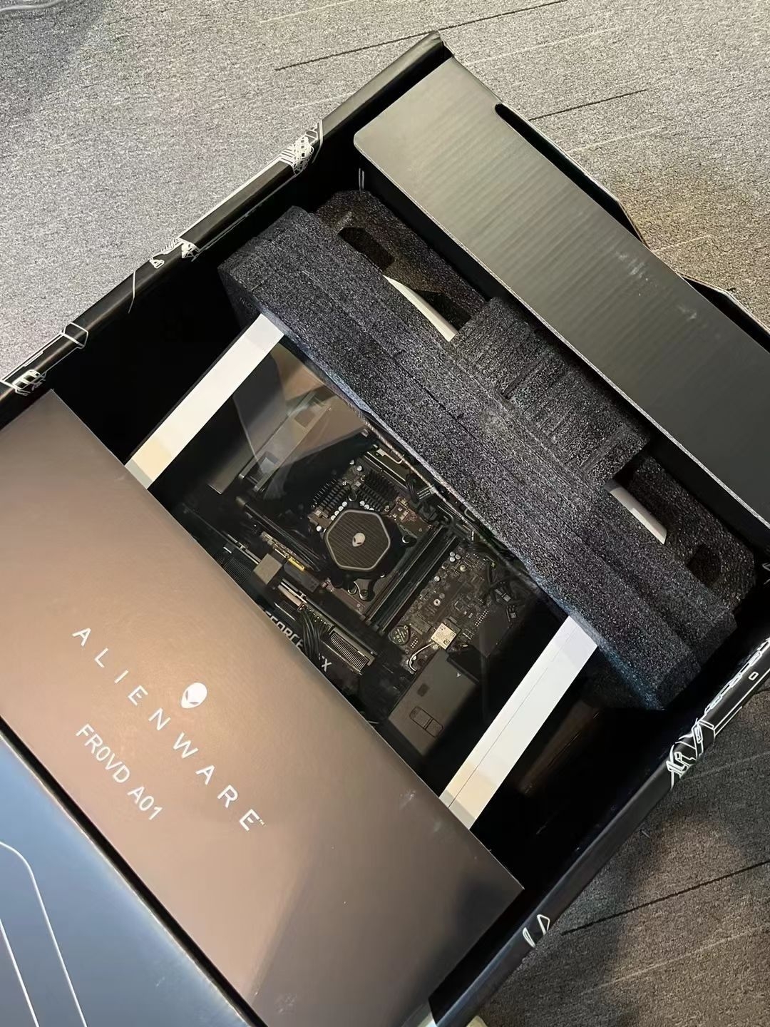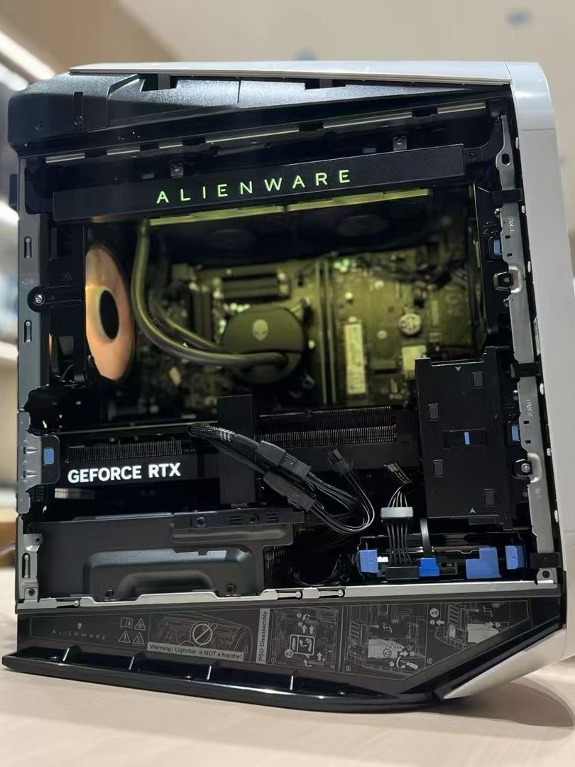我选的白色款。它的造型不像传统主机方方正正,而是带有未来感的流线轮廓,侧板的六边形镂空网格既是设计语言,也是散热通道。最迷人的是那块巨大的透明侧透面板。它不是让你窥视杂乱线材的窗口,而是一个精心布置的舞台:发着紫光的环形灯带、带有绿色标识的ALIENWARE logo、巨大的RTX3080TI显卡,以及那个非常醒目的粉色定制风扇,所有内部构件都像展品一样陈列其中。这种将内部硬件作为美学核心的设计,打破了“机箱只是容器”的常规。它摆在那里,即使不开机,也宣告着一种对性能和工艺毫不掩饰的追求。这和收藏限量版球鞋或设计感家具一样,是功能之上的审美表达。