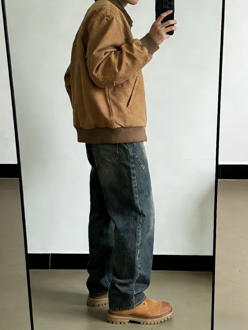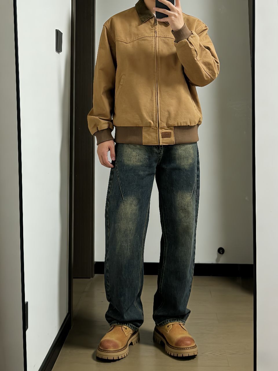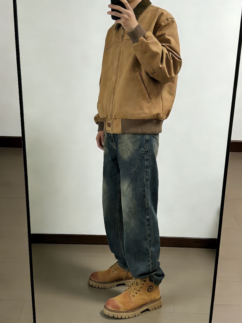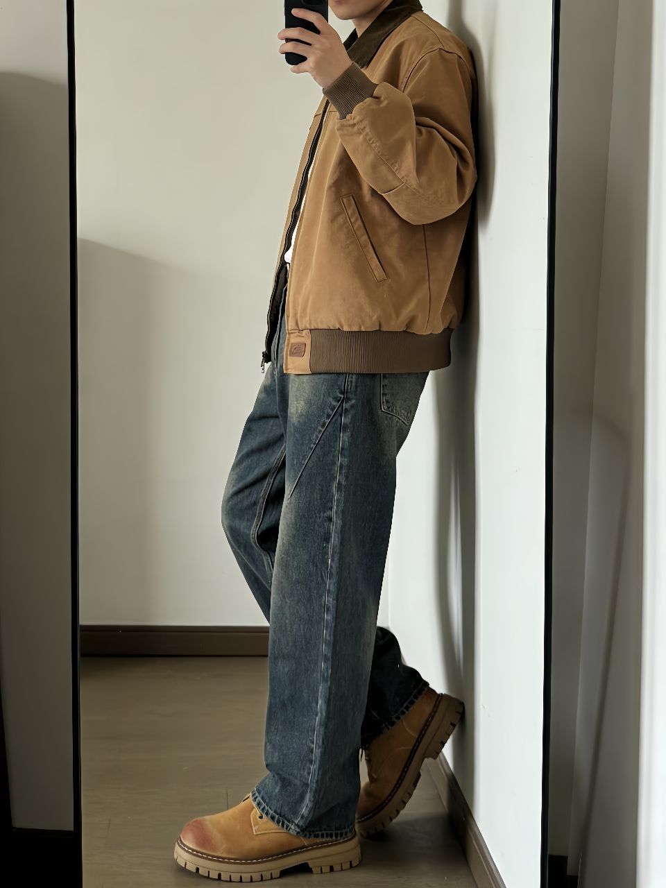 今天这身真的太适合日常出门了。马登这件帆布夹克版型挺括但不板正,短款设计显腿长,里面搭卫衣或者T恤都行。江南先生这条牛仔裤我必须夸一下,水洗做旧感很自然,垂坠感特别好,穿着软软的一点不勒腿。再配上骆驼这双大黄靴,4cm厚底悄悄增高还不累脚,走路一天都不累。这三件搭一起就是那种不费力的帅,男生女生都能穿。