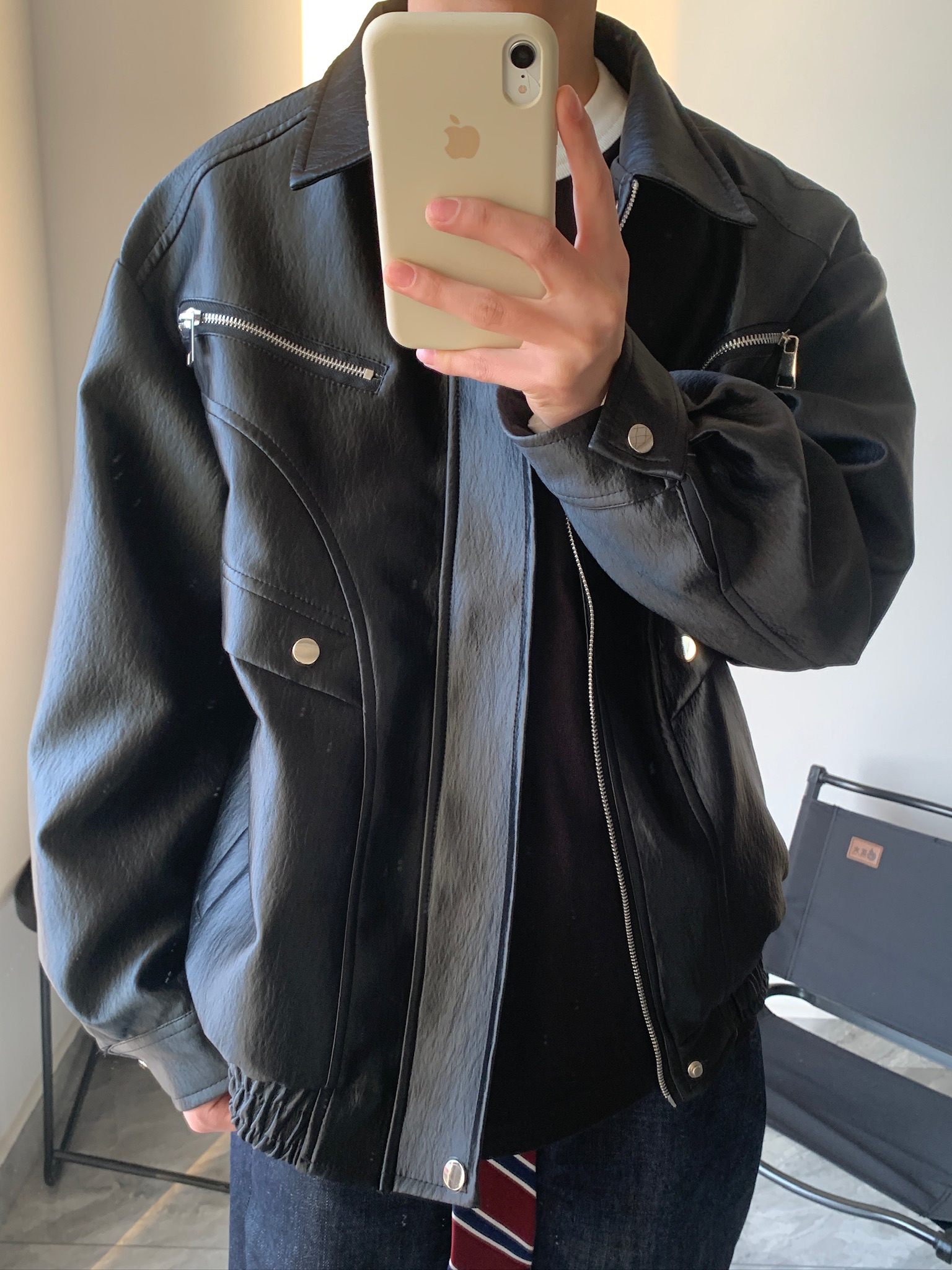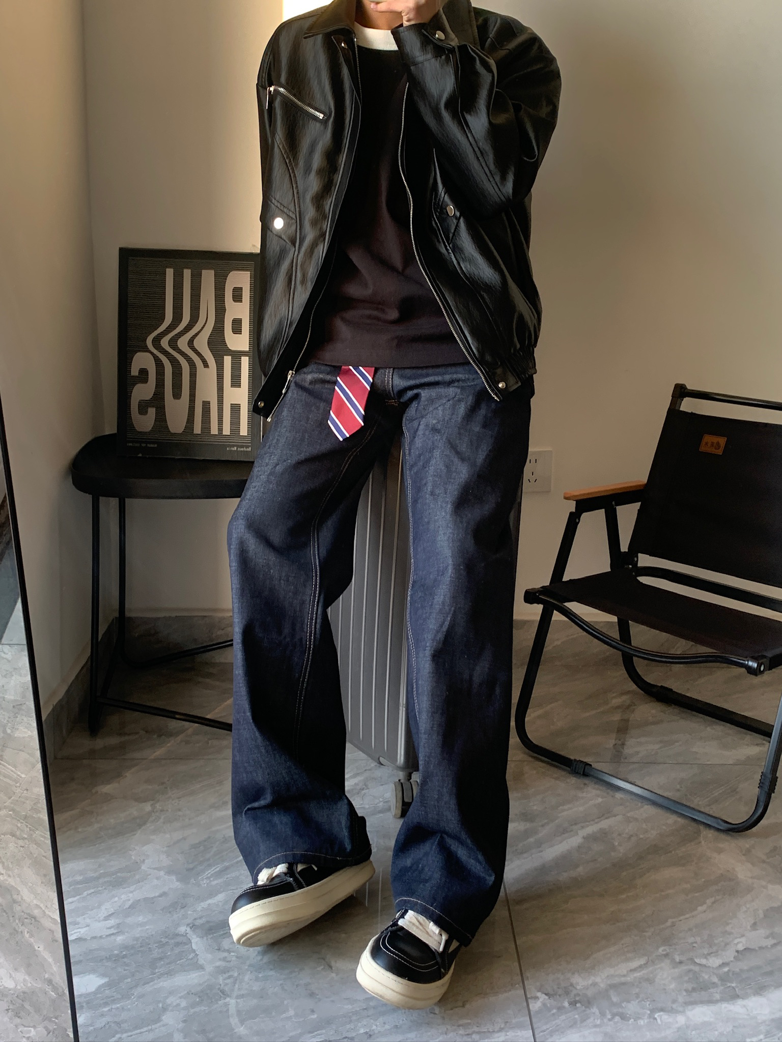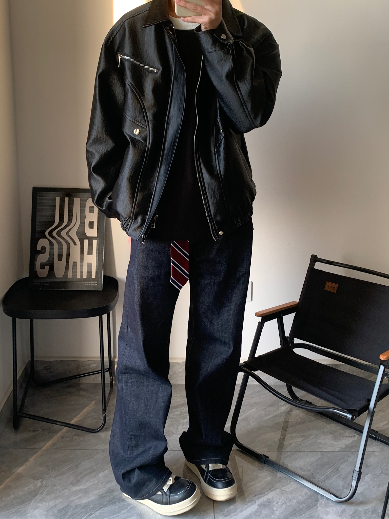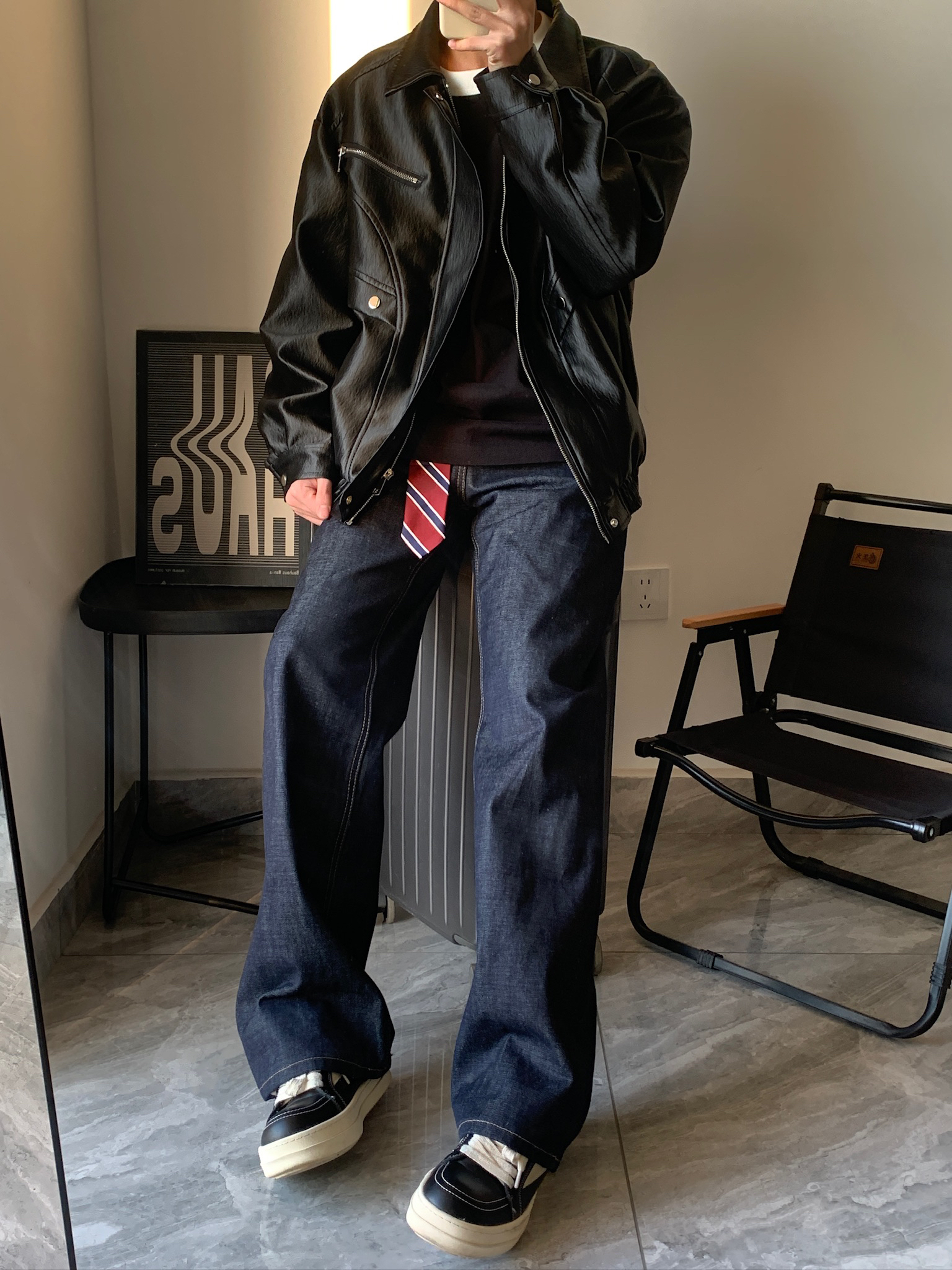 谁懂啊家人们!男生早春穿搭真的不用太复杂🤷♂️。一件皮夹克+一条牛仔裤,就能轻松拿捏氛围感。我这件皮夹克是做旧的,有点复古那味儿,里面穿个黑T恤,再系个小领带当装饰,一下就和别人不一样了。牛仔裤是原色的,越穿越有味道,越穿越好看,真的越穿越爱。