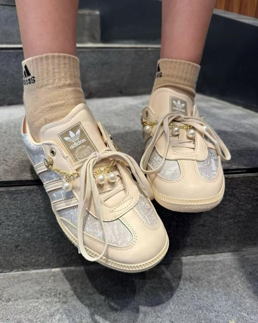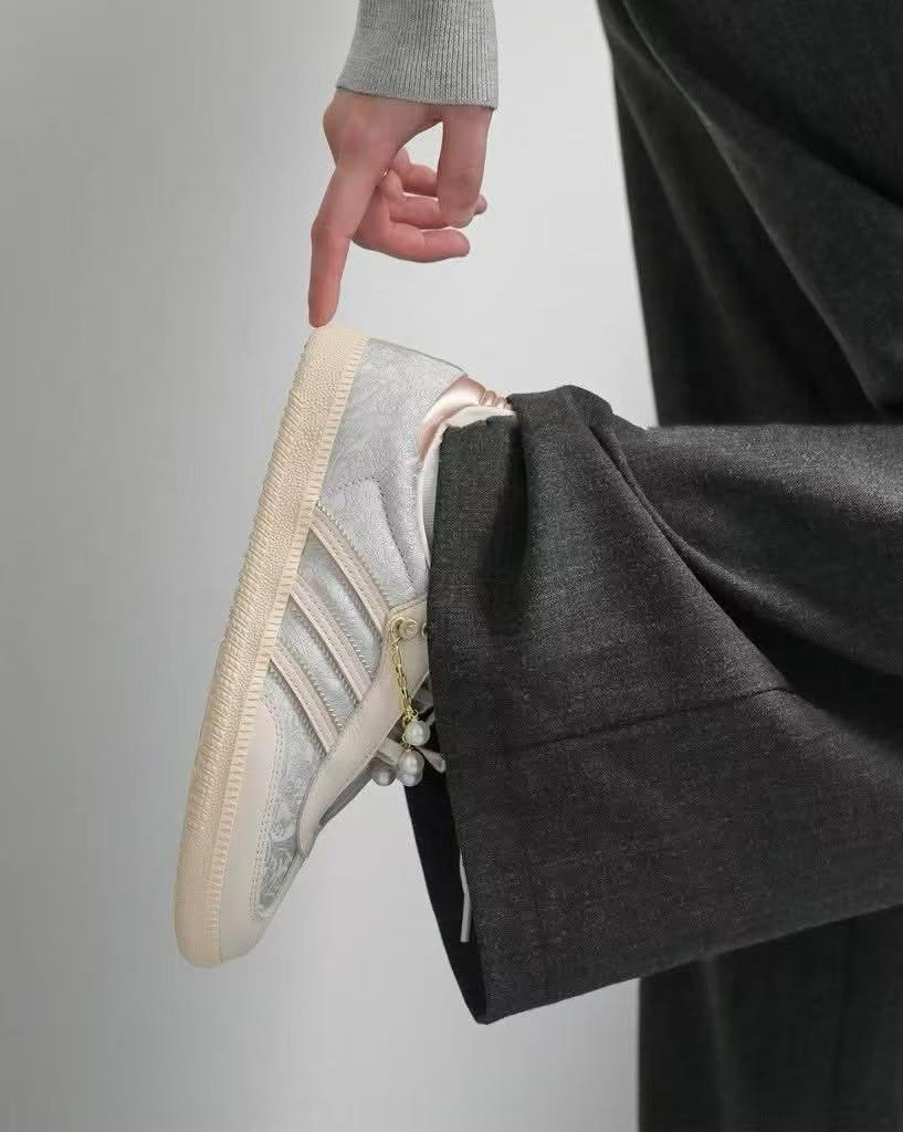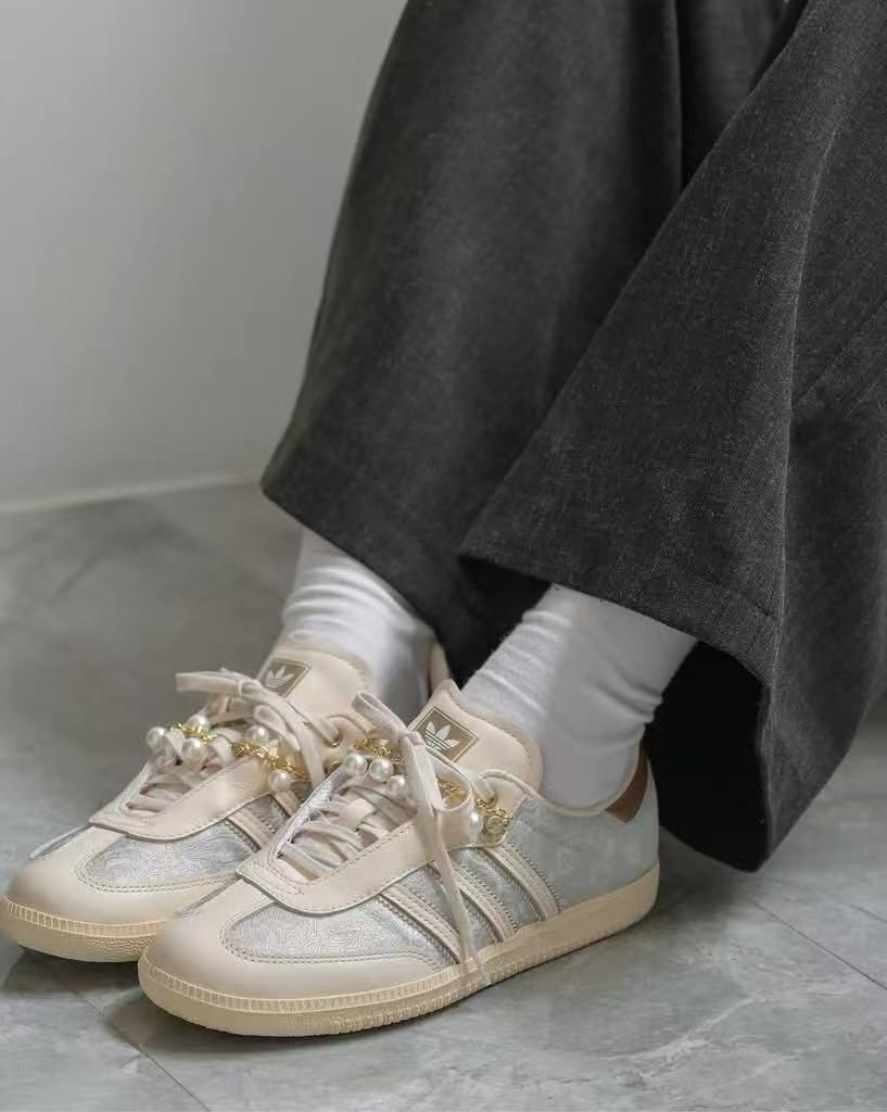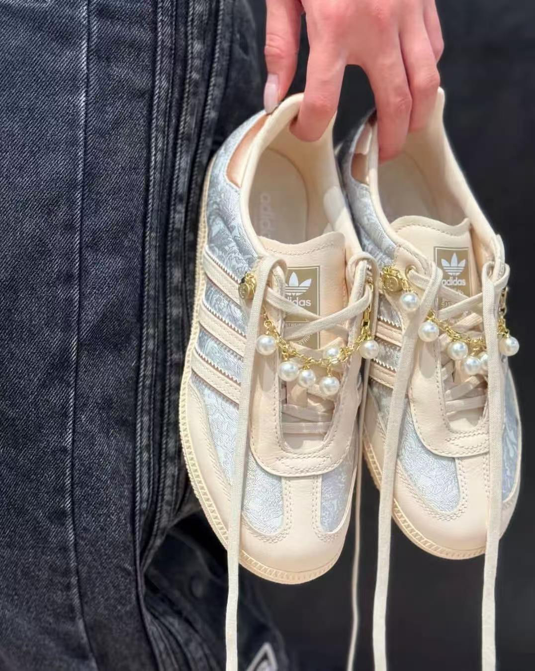 谁懂啊!这双珍珠Samba直接戳中我的心巴💫 浅灰绸缎暗纹鞋面,加上可拆卸的珍珠金链,每一步都像在跳芭蕾。 宋雨琦同款,甜妹DNA狠狠动了,搭配纱裙、牛仔裤都超仙!