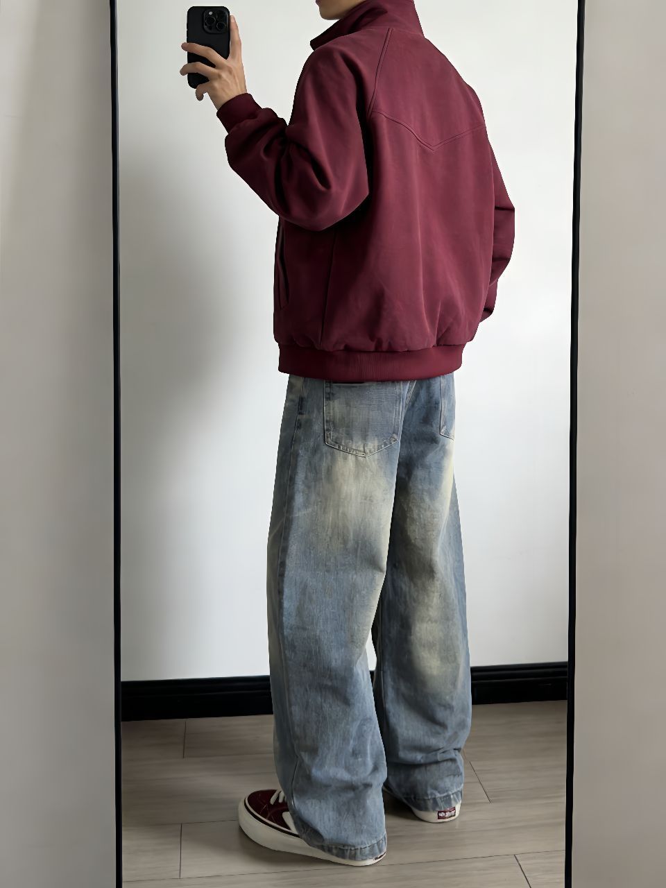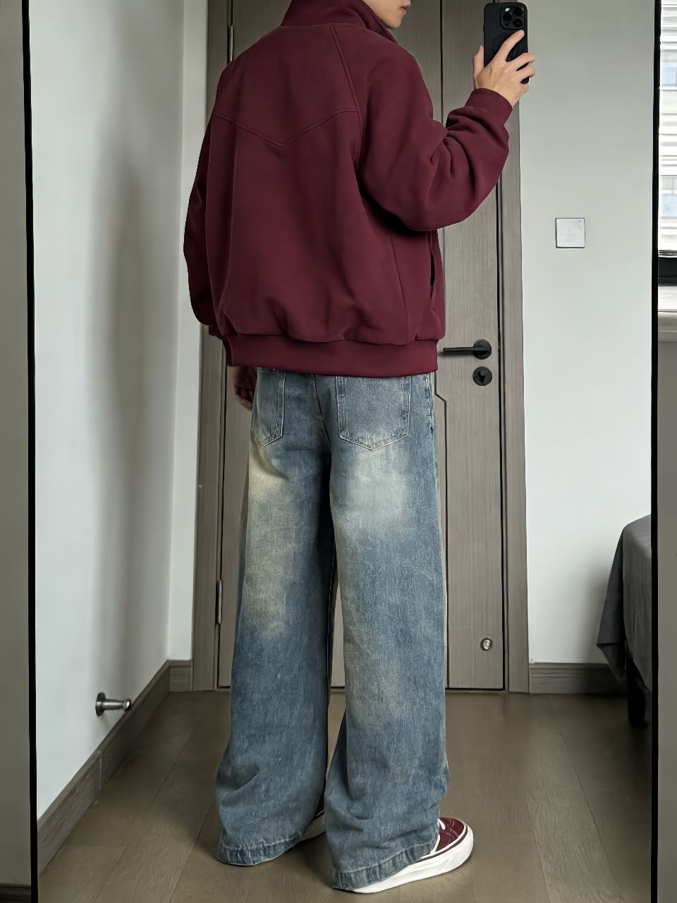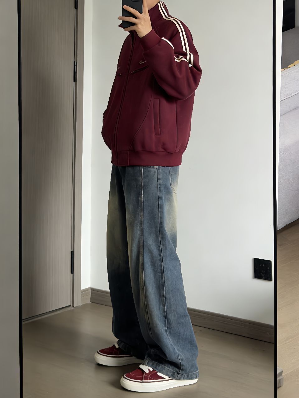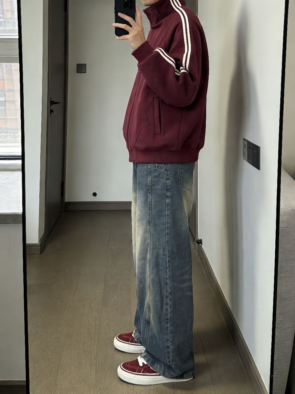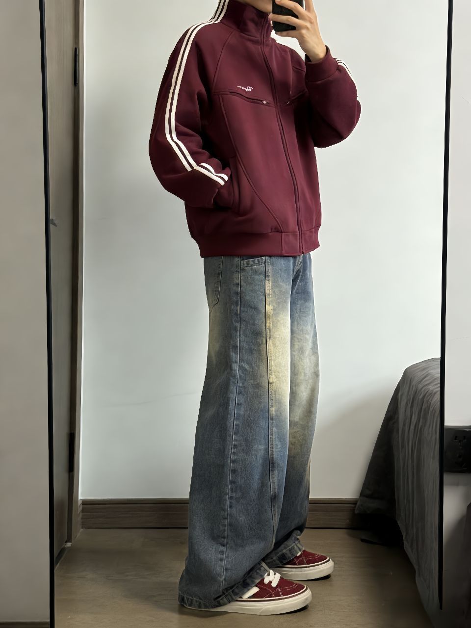 这件卫衣外套真挺厚的,最近十来度里面搭个打底完全够用,拉链一拉不灌风。袖子上的条纹和口袋设计有点美式校园内味儿,不像那种软塌塌的卫衣没型。 裤子是我最近淘到很满意的一条,弯刀裤型显腿长还不勒,水洗做旧的颜色很自然,裤脚的拼接毛边有点废土风内味儿,搭运动鞋板鞋都行。 鞋子选了酒红色呼应外套条纹,脚感软软的,走一天不累。一套下来保暖又不臃肿,适合不想费脑子穿搭的早上。