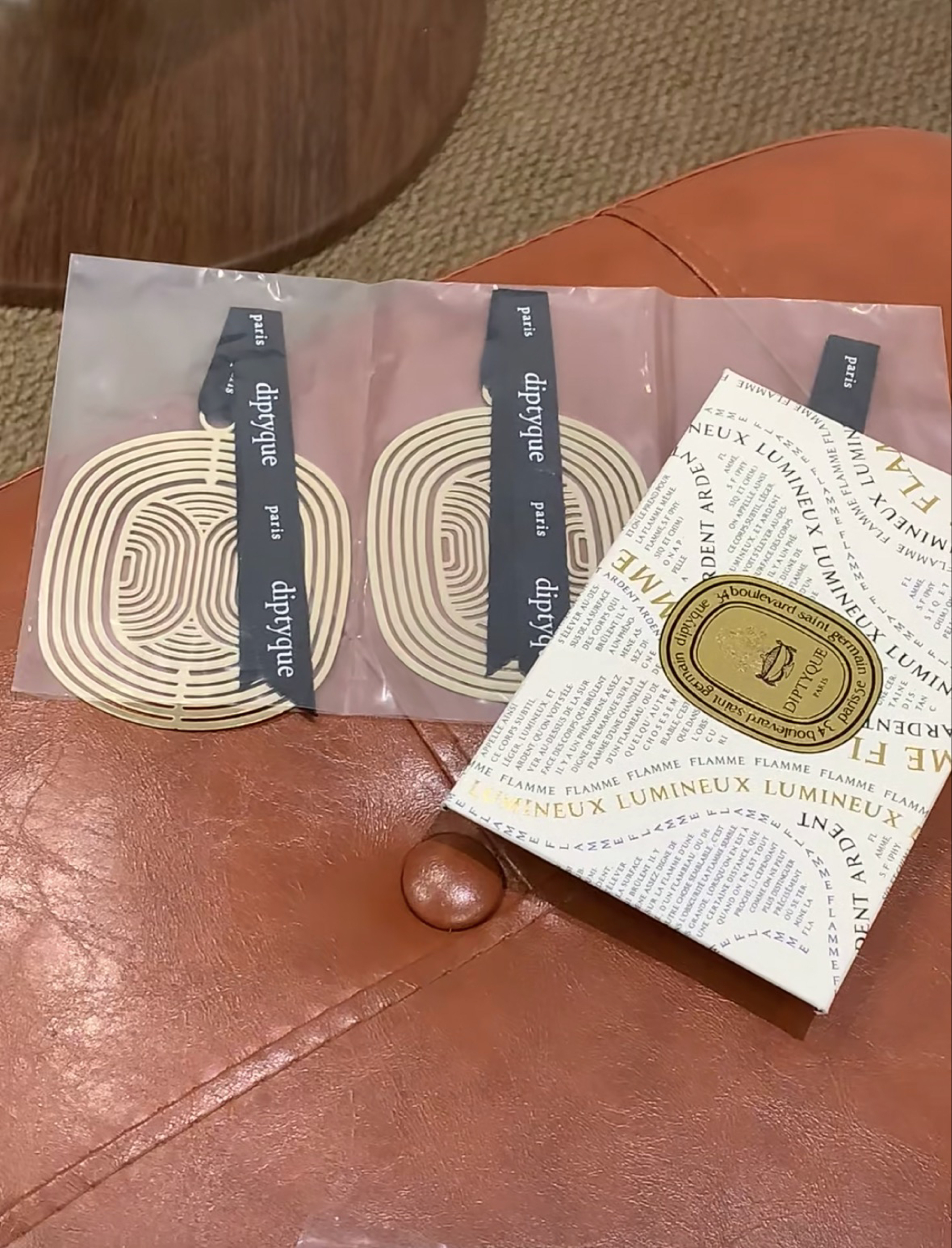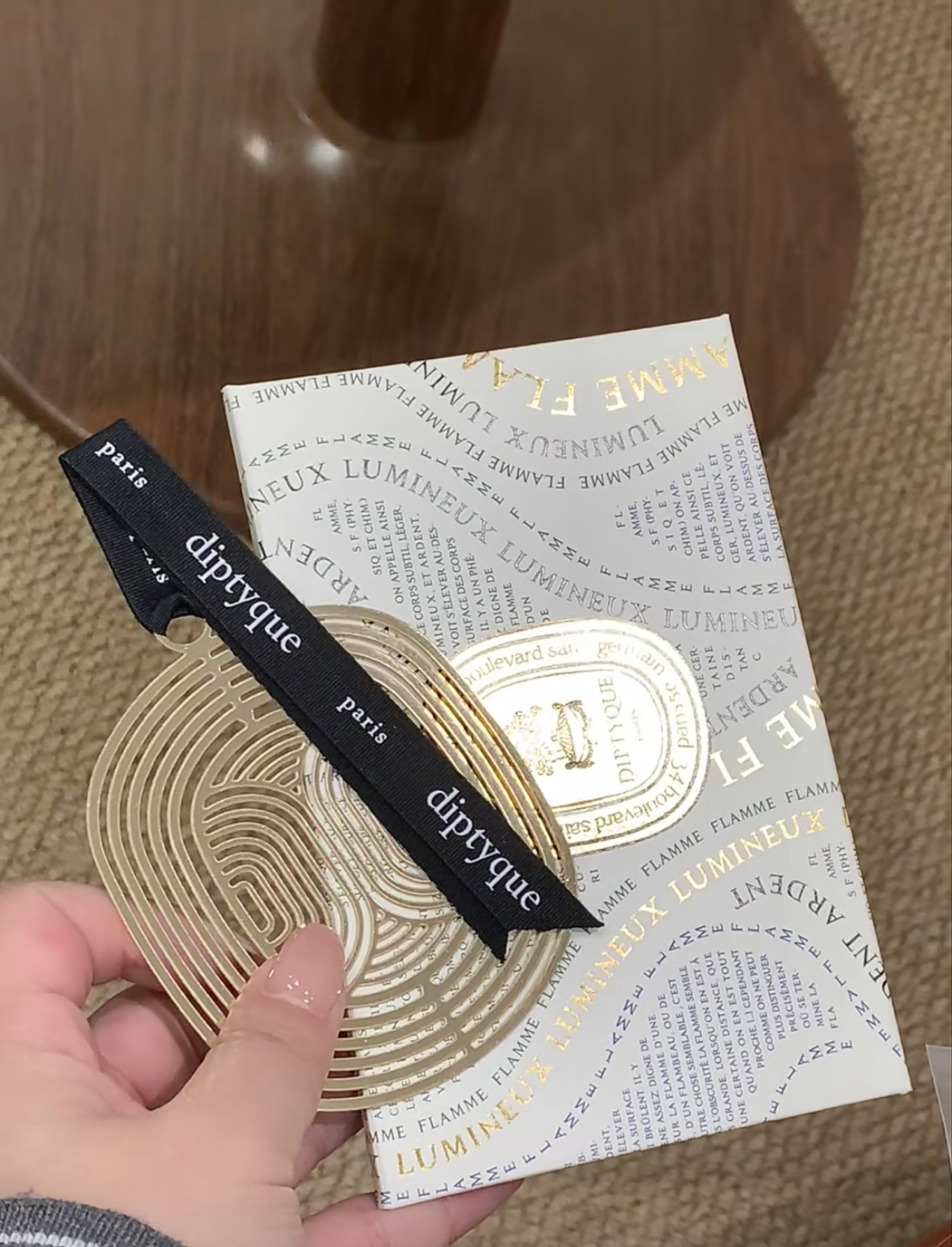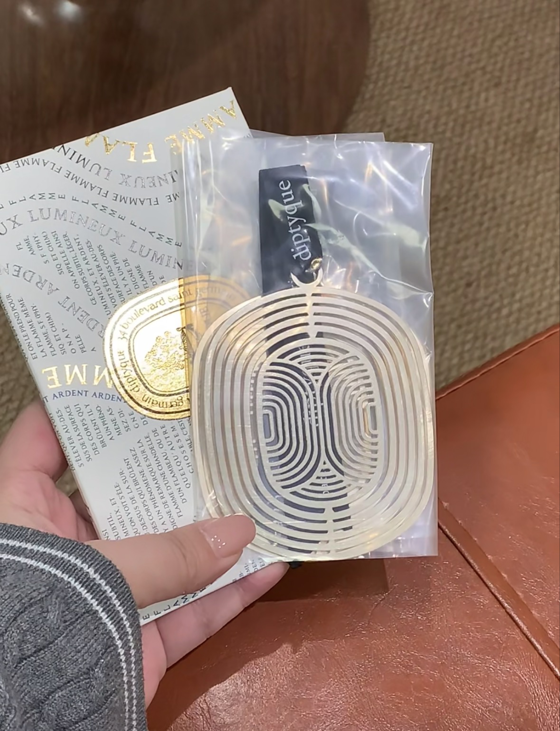 入手了 Diptyque 的车载挂件,一盒三个装,可以用很久。金色的镂空设计很精致,香气是那种很纯粹的木质调,不会过于甜腻。挂在车里,每次上车都感觉被温柔的香气包裹,通勤路上的心情都变好了。