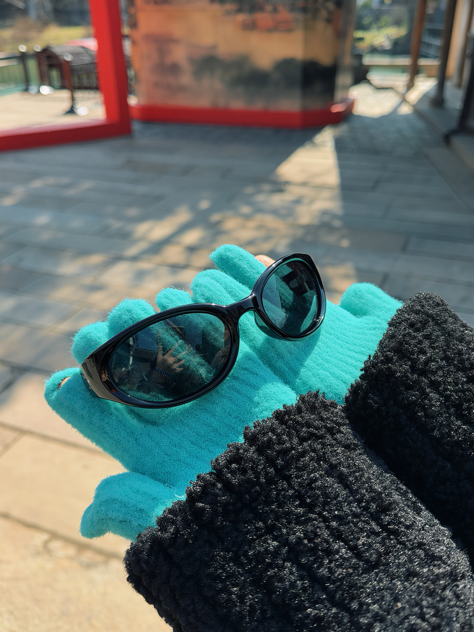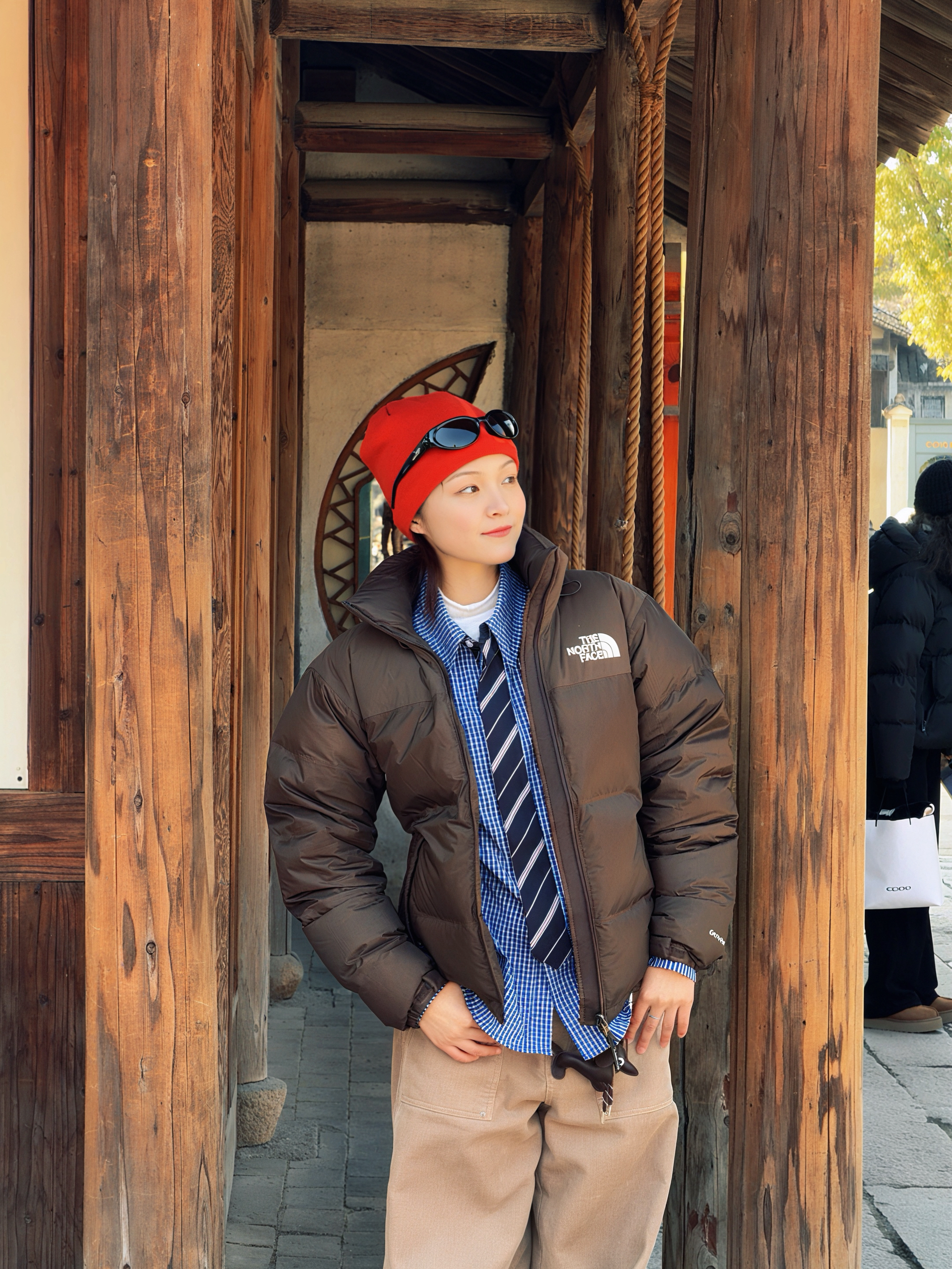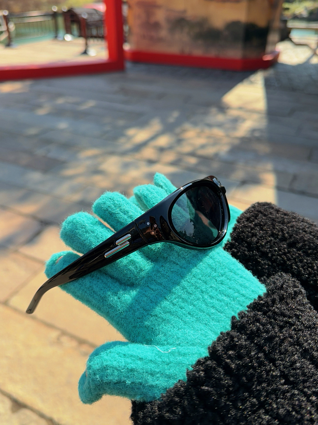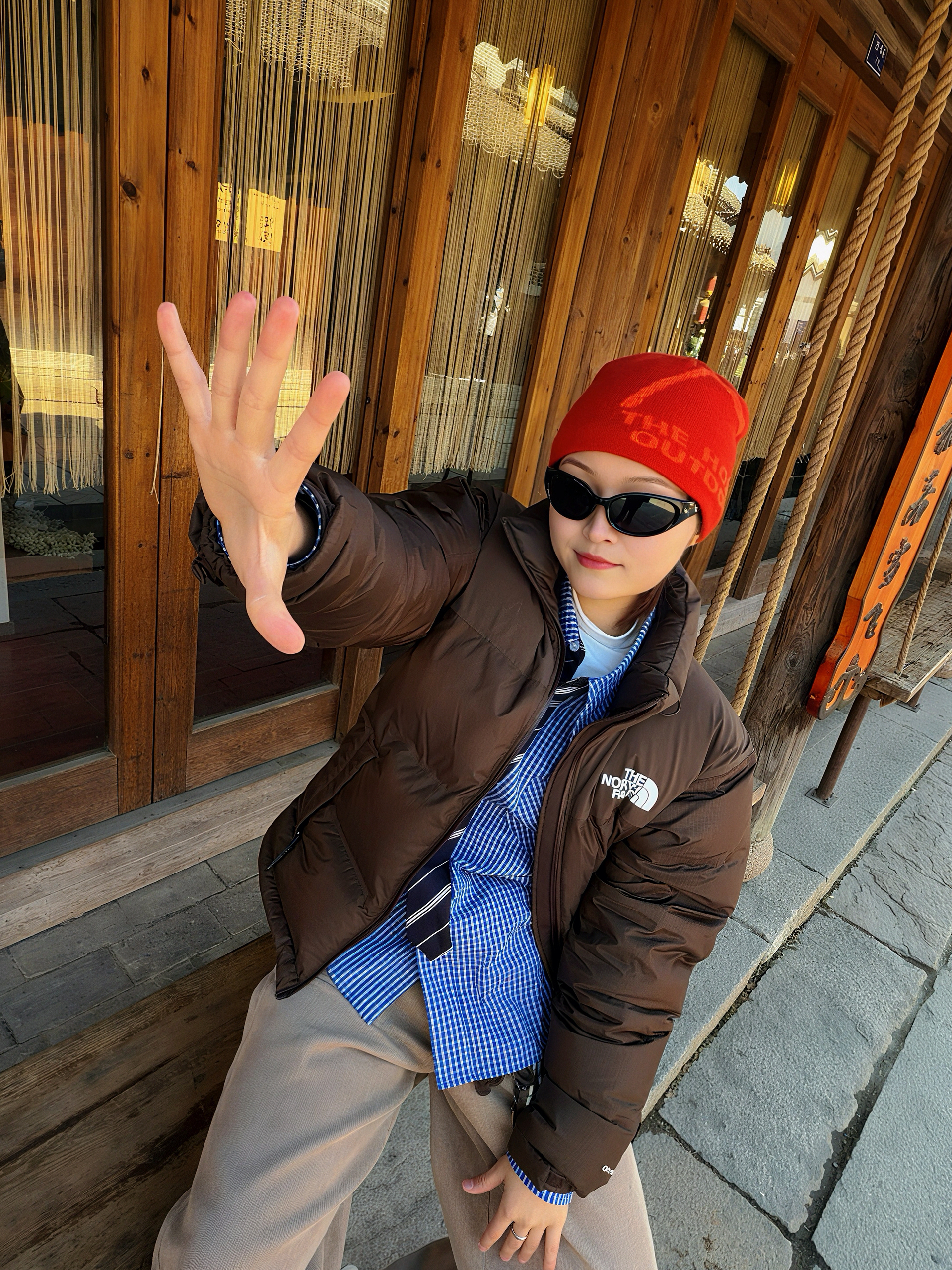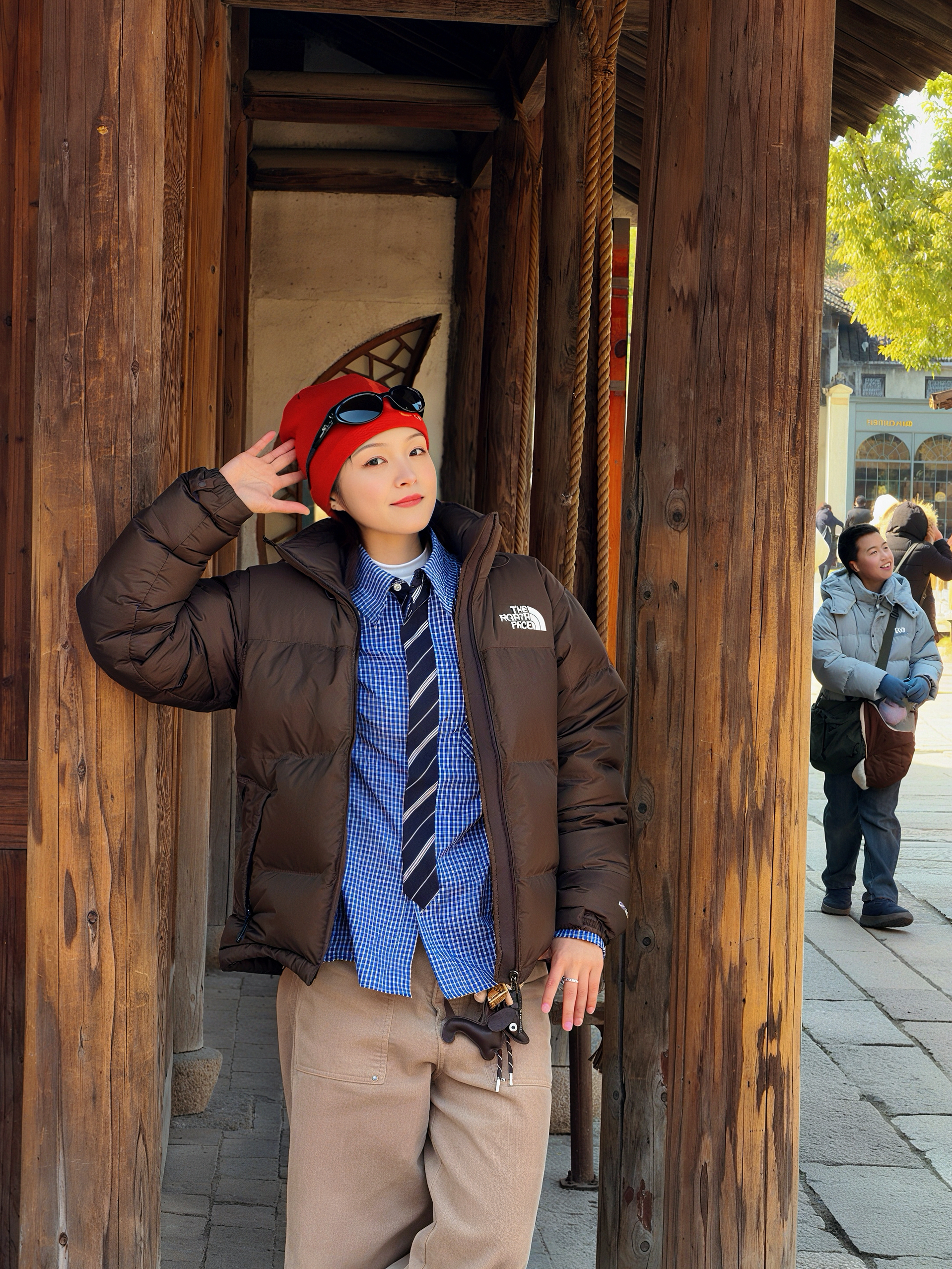 新年逛古镇 特意戴了PULAIS复古墨镜 亮黑镜框很显脸小 阳光下镜片不刺眼👁️ 还能当发箍夹在红帽子上 搭配棕色羽绒服和蓝格衬衫 既有美式复古感 又能hold住中式场景 拍照出片率超高 是我今年最爱的配饰之一