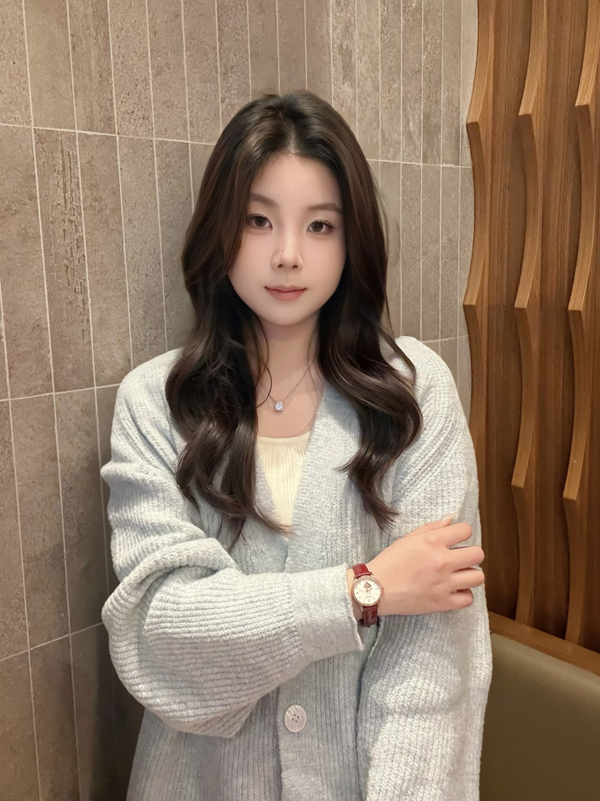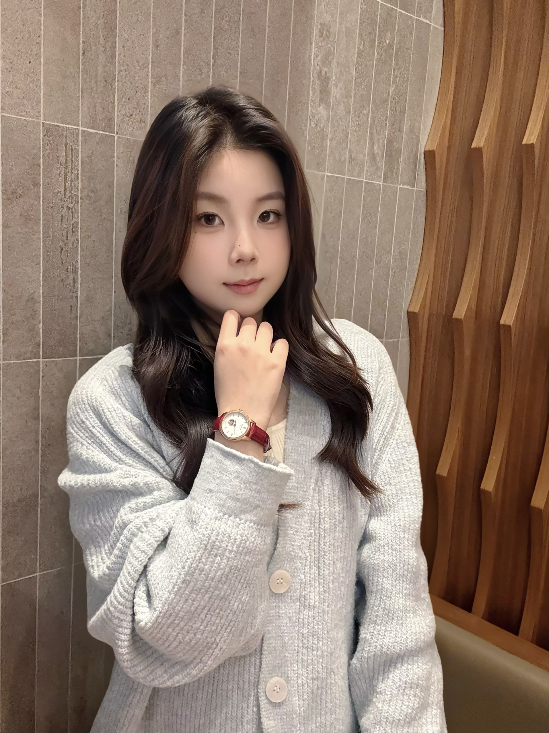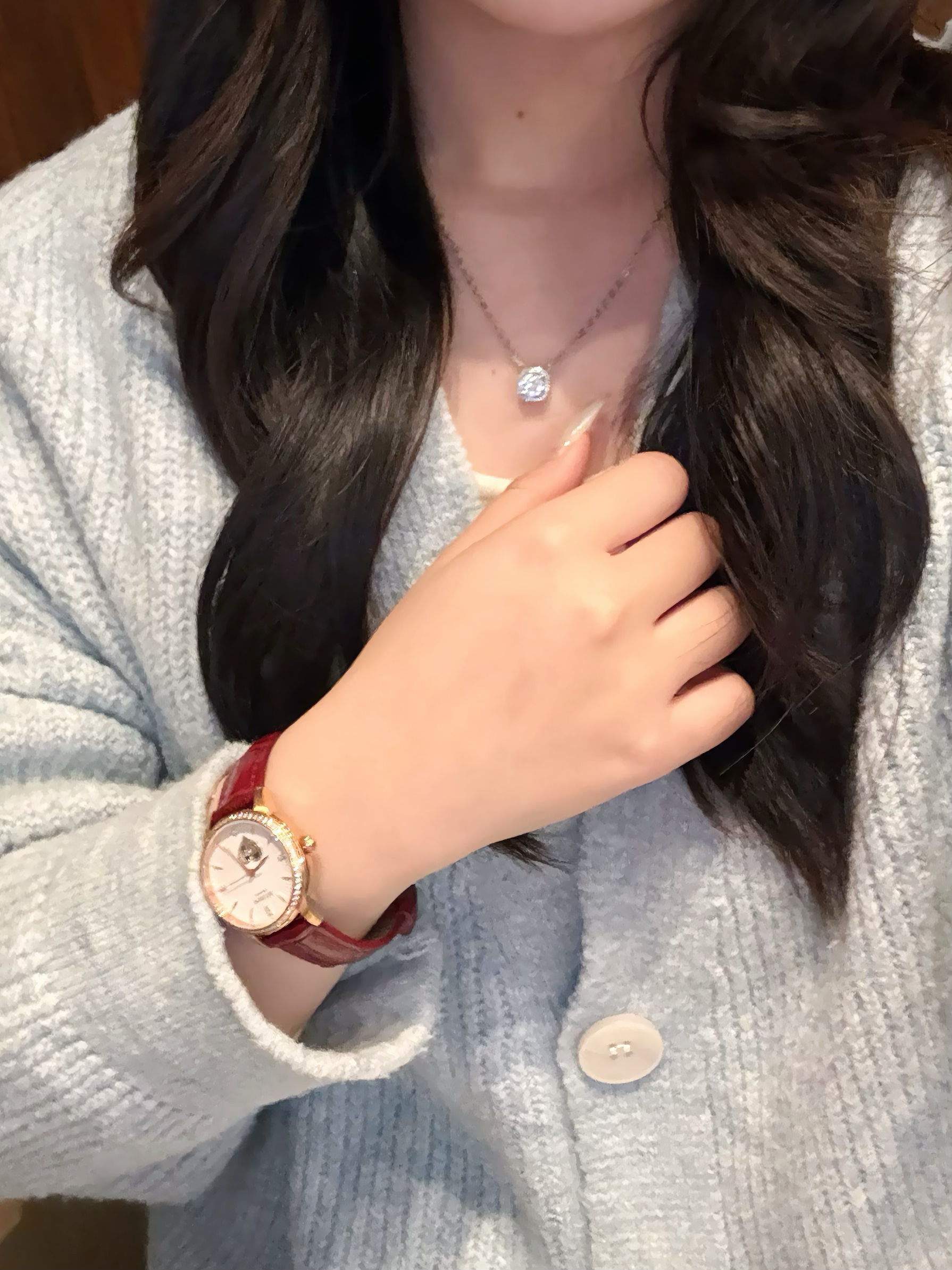 冬天搭配一些红色的小配饰很吸睛 今天穿的毛衣 手上的小红表是点睛之笔 酒红色的表带气质一下上来了 表盘上的爱心镂空机芯 我感觉还是挺独特的 搭配项链一起温温柔柔的