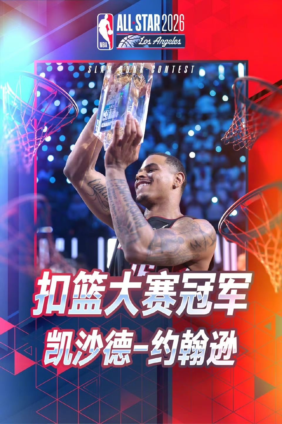 2026年NBA扣篮大赛冠军 凯沙德`约翰逊(迈阿密热火) 决赛关键 决赛对手:卡特。布莱恩特(马刺) 决赛得分:约翰逊97.1分,布莱恩特93分 制胜一扣:罚球线内一步滑翔单手风车劈扣,47.8分 布莱恩特首扣拿50分(本届唯一满分),但第二扣失误仅43分