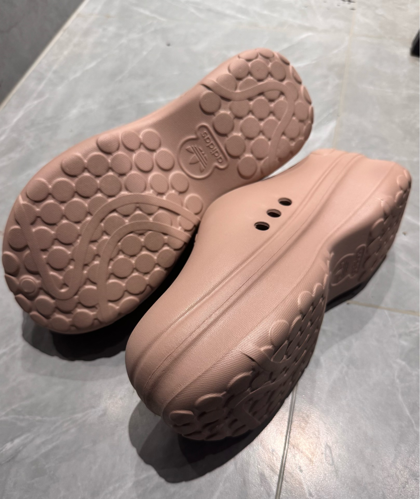 谁懂啊!这双裸粉色穆勒拖真的戳中我心巴💘 一体成型的EVA材质+厚底设计,甜酷感直接拉满,春夏穿搭的懒人福音来了! ✨ 颜值暴击 • 裸粉色温柔又高级,完全不挑皮,黄皮姐妹也能轻松驾驭 • 鞋头圆润可爱,侧面的三叶草浮雕Logo低调又有辨识度 • 厚底足足3cm+,秒变腿精,小个子姐妹狂喜 👟 脚感实测 • 一体成型EVA材质,上脚软乎乎的,像踩在云朵上☁️ • 鞋底有防滑纹路,走路稳当不...