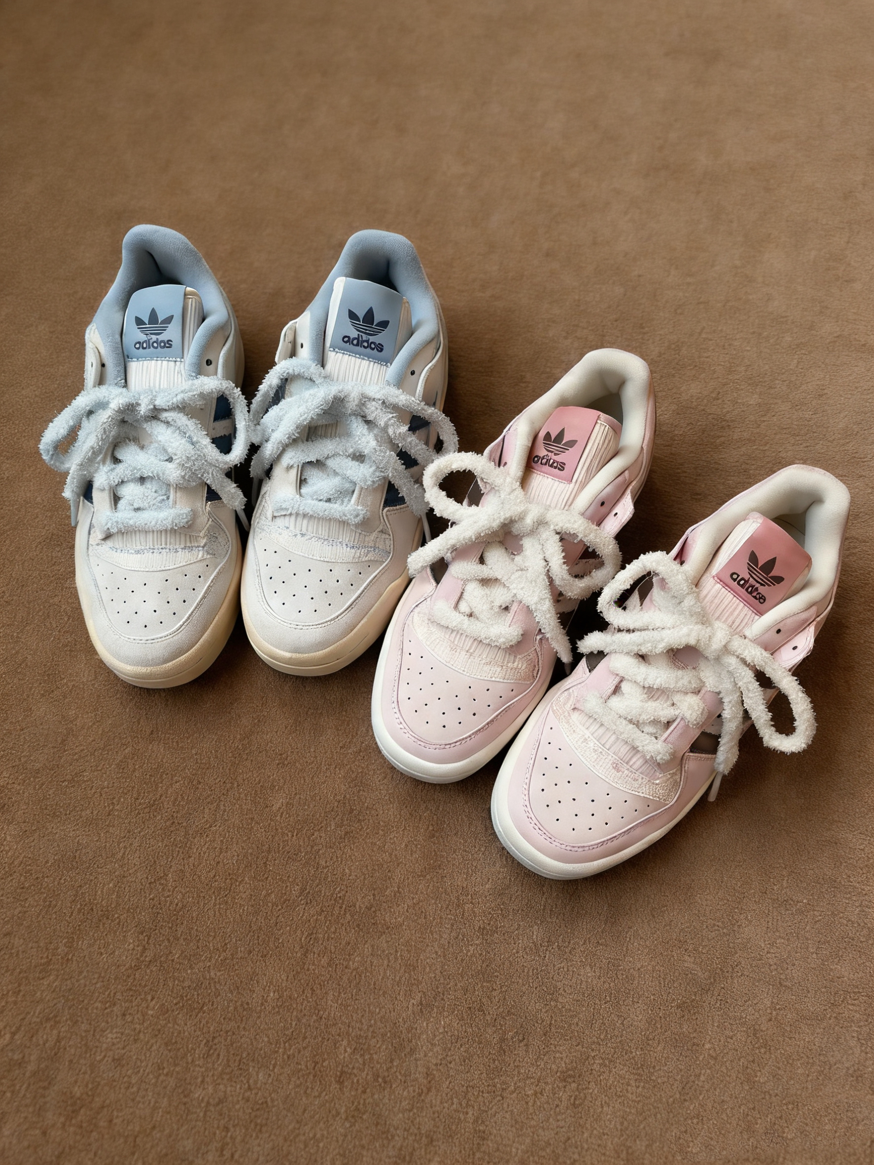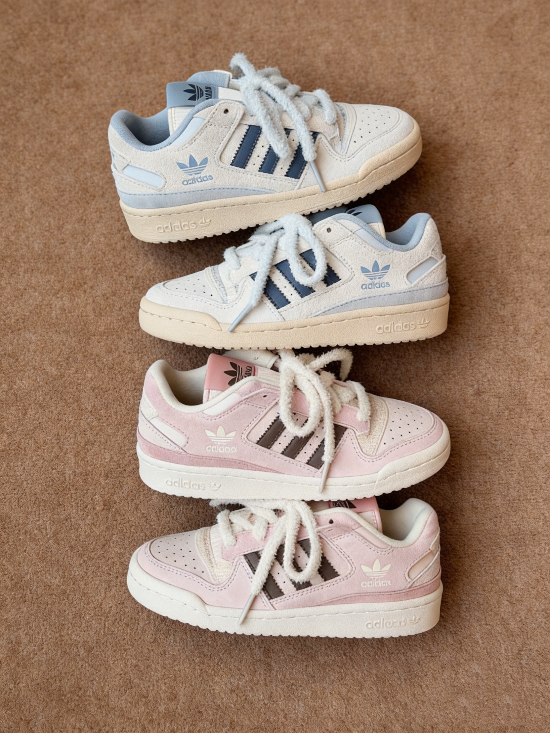 ✨细节拉满,复古质感在线 • 奶白浅蓝款:米白色麂皮鞋身搭配浅蓝细节,毛绒鞋带自带软糯感,做旧中底复古味十足,像把80年代的美式校园穿在了脚上。 • 樱花粉款:全粉麂皮包裹,搭配深棕三条杠,毛绒鞋带增添了几分俏皮,鞋身的碎花暗纹更是点睛之笔,温柔又不失个性。 👟经典版型,百搭不踩雷 FORUM标志性的魔术贴设计,不仅提升了包裹感,还让整体造型更具层次感。低帮版型对各种脚型都很友好,无论是日常出...