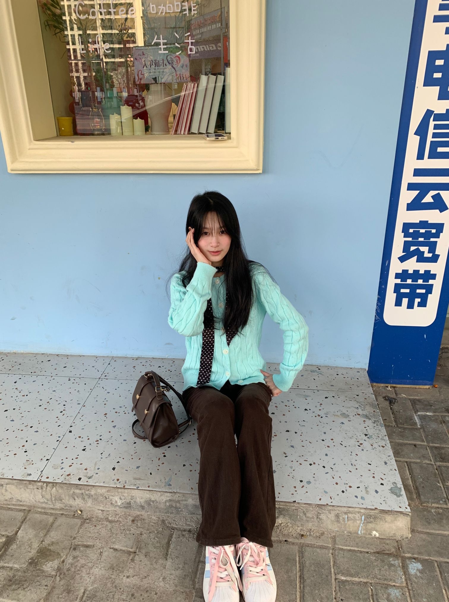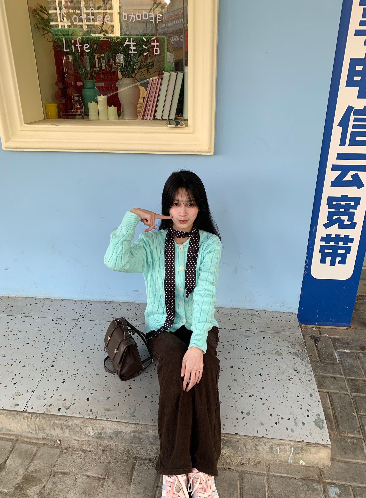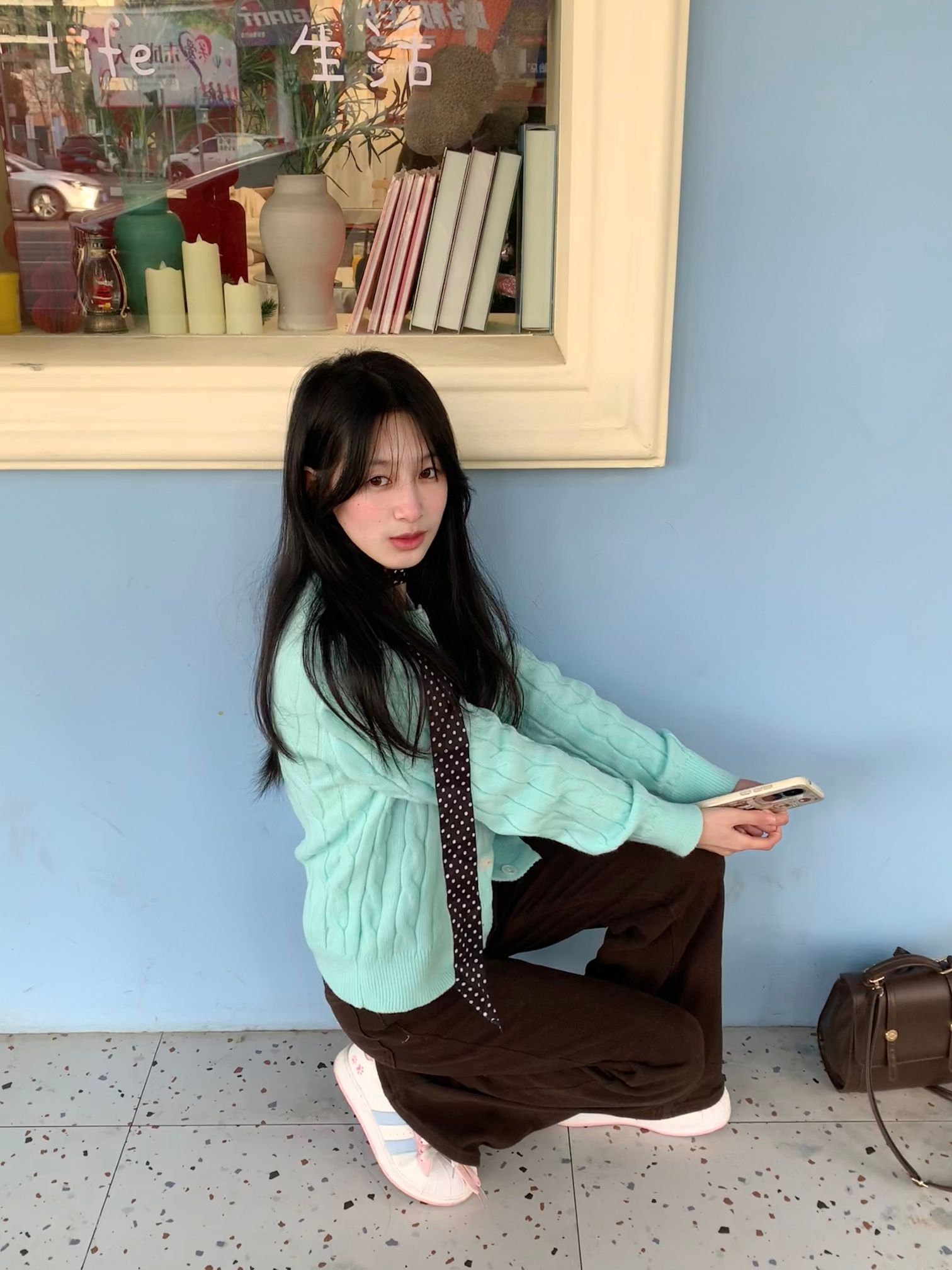 薄荷绿针织开衫,宽松的版型自带慵懒感,我是H型身材,梨型身材也可以轻松驾驭,日常通勤或者约会都适合,而且薄荷绿还挺显白 领口点缀一条深色波点丝巾,瞬间提升层次与精致度。觉得黑色丝巾也挺百搭的,下装搭配高腰棕色阔腿裤,拉长比例的同时呼应氛围,脚踩白色休闲鞋,轻盈又舒适。 整体配色柔和清新,与浅蓝墙面的背景相映成趣,仿佛将春天的气息穿在了身上