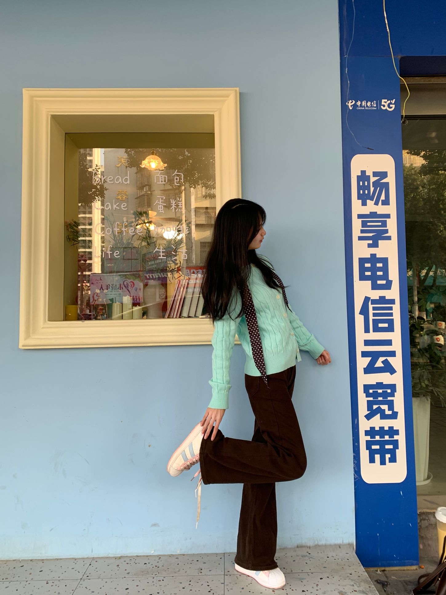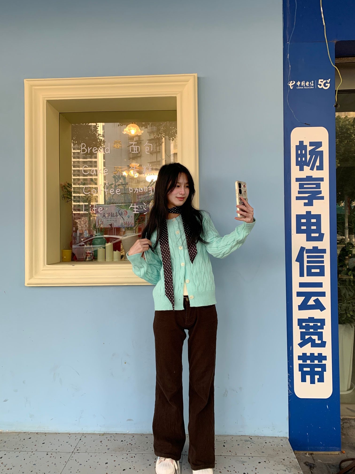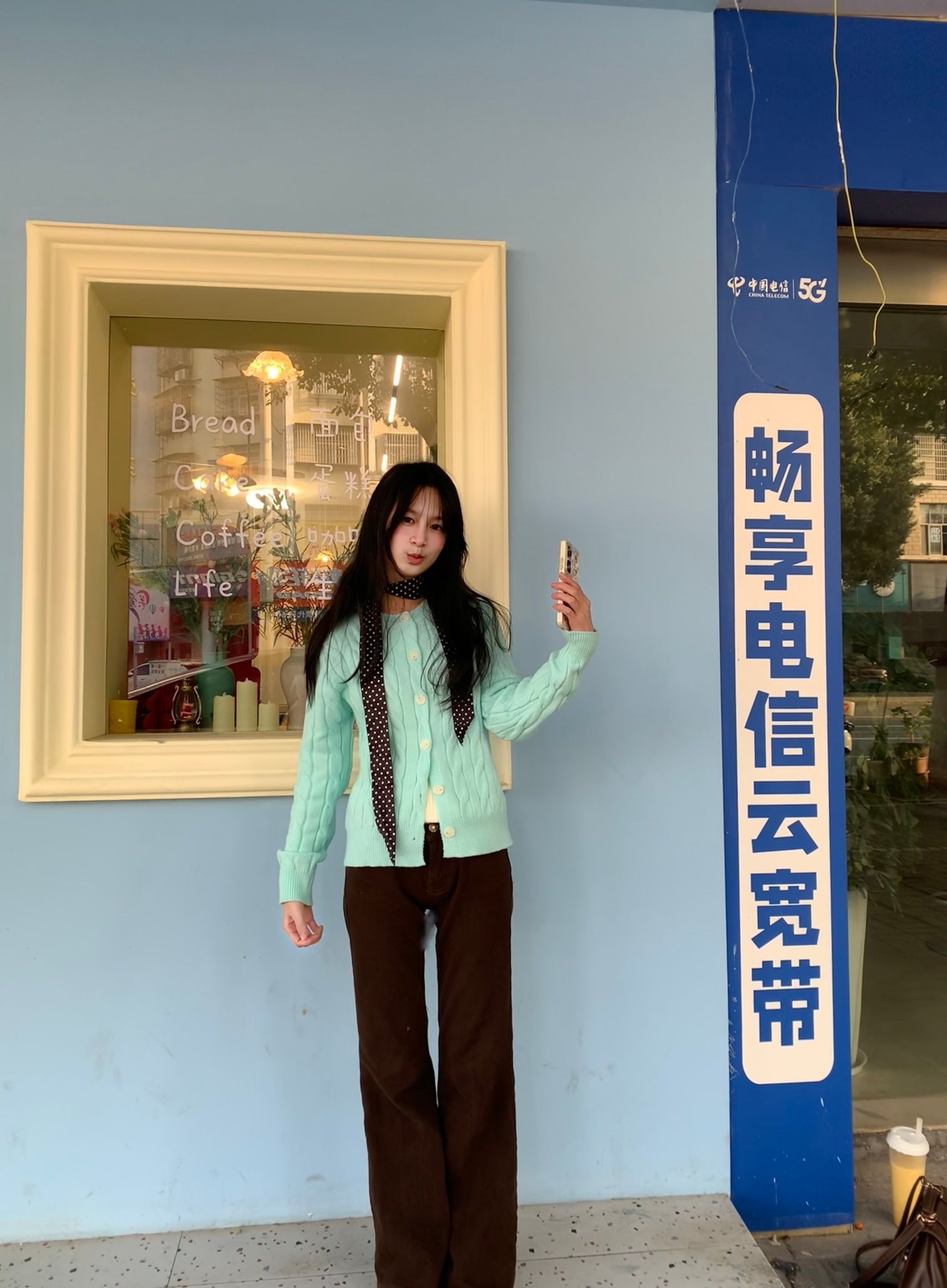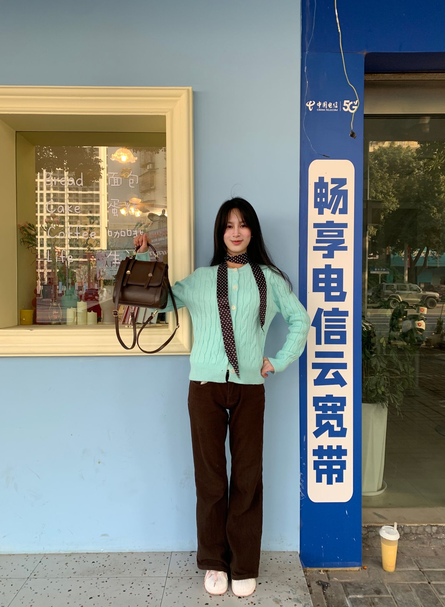 薄荷绿针织开衫,宽松的版型自带慵懒感,我是H型身材,梨型身材也可以轻松驾驭,日常通勤或者约会都适合,而且薄荷绿还挺显白 领口点缀一条深色波点丝巾,瞬间提升层次与精致度。觉得黑色丝巾也挺百搭的,下装搭配高腰棕色阔腿裤,拉长比例的同时呼应氛围,脚踩白色休闲鞋,轻盈又舒适。 整体配色柔和清新,与浅蓝墙面的背景相映成趣,仿佛将春天的气息穿在了身上