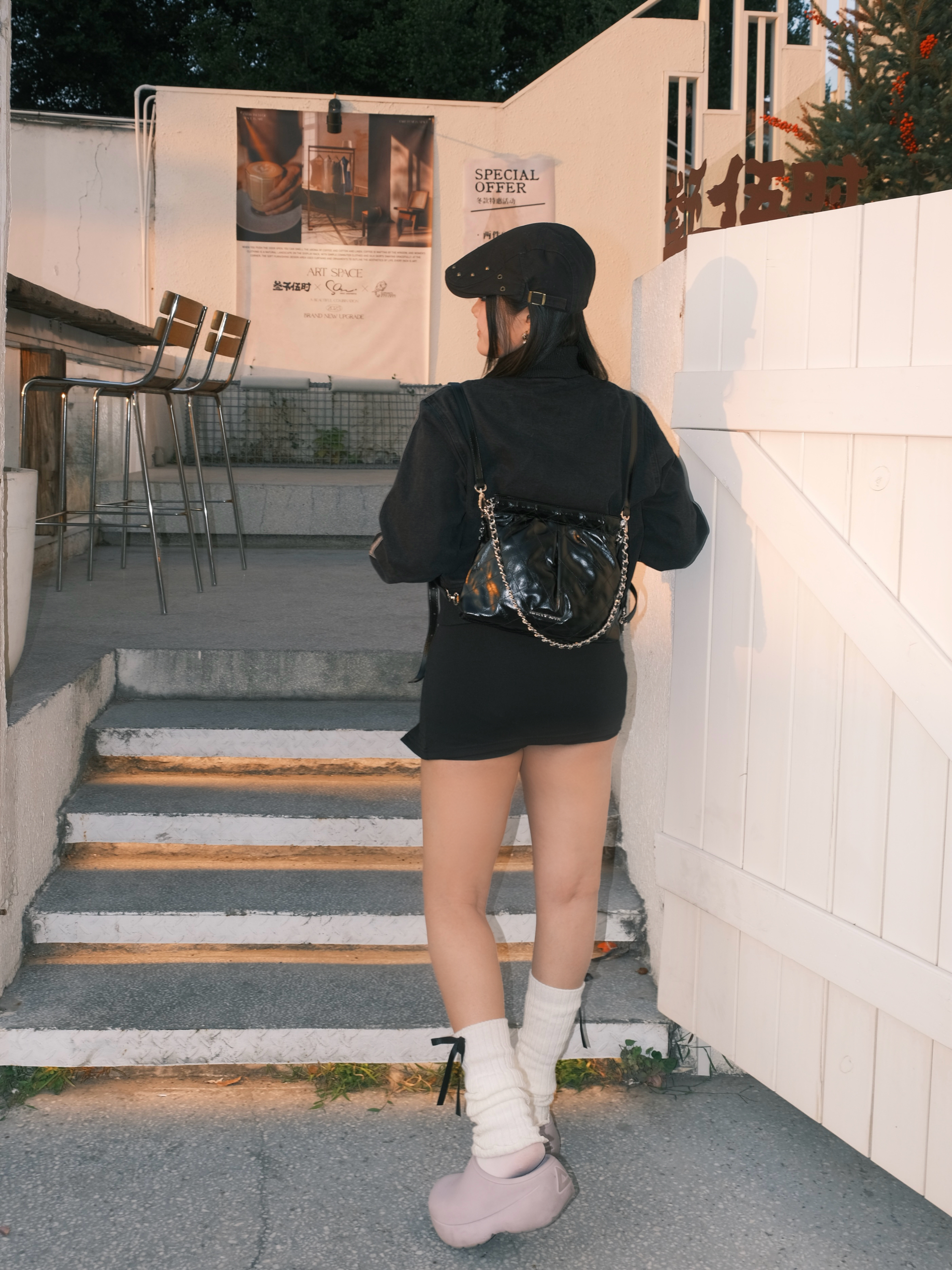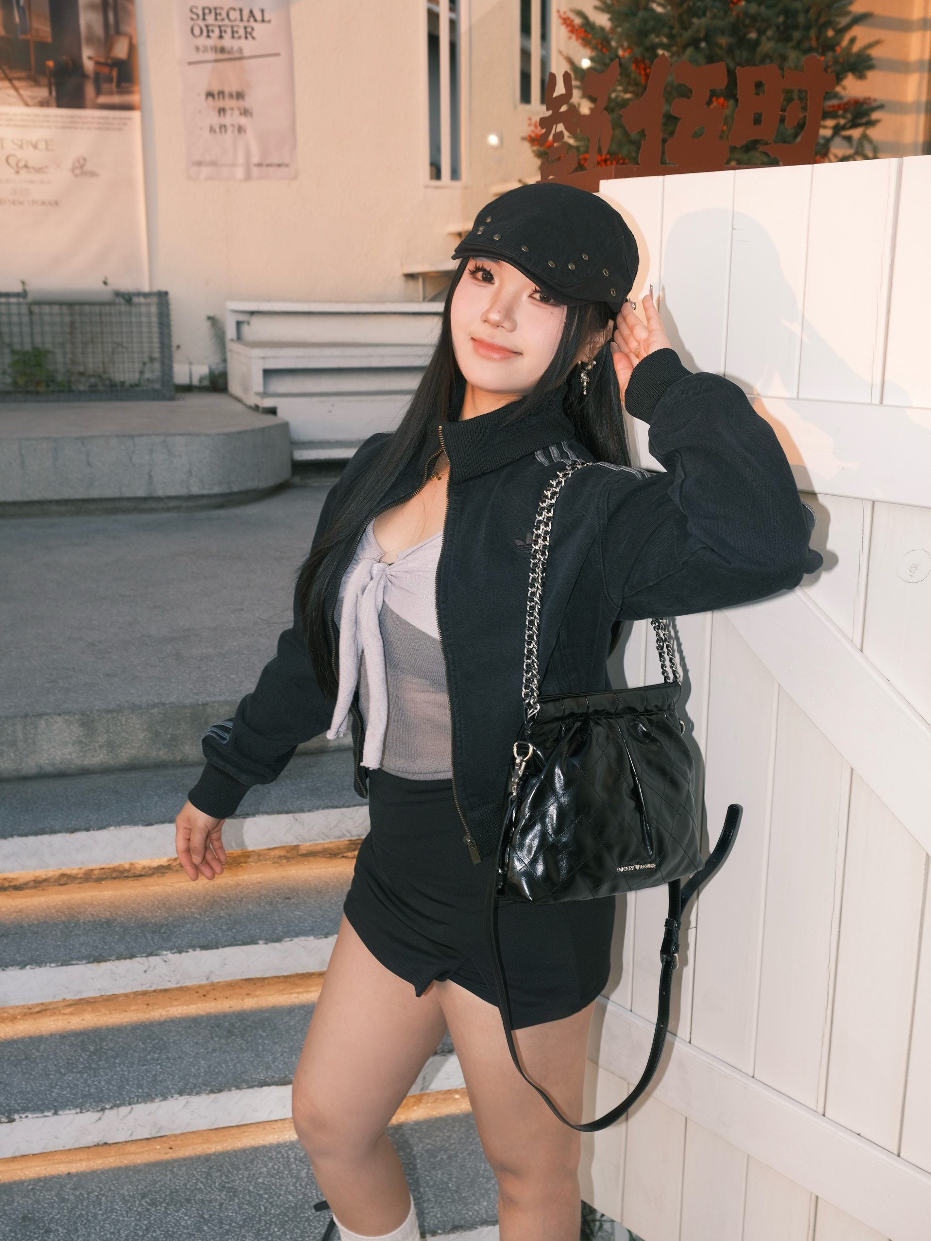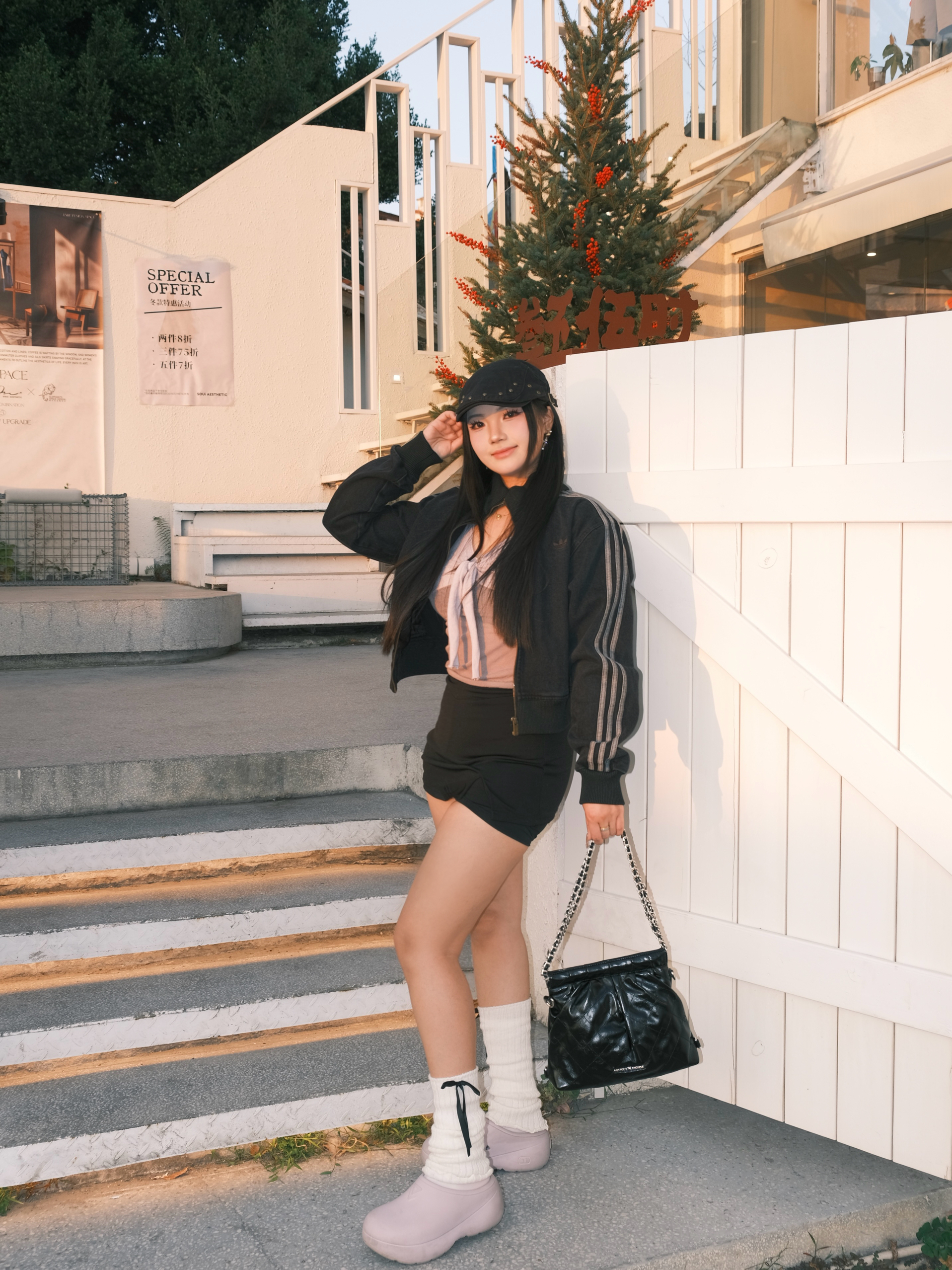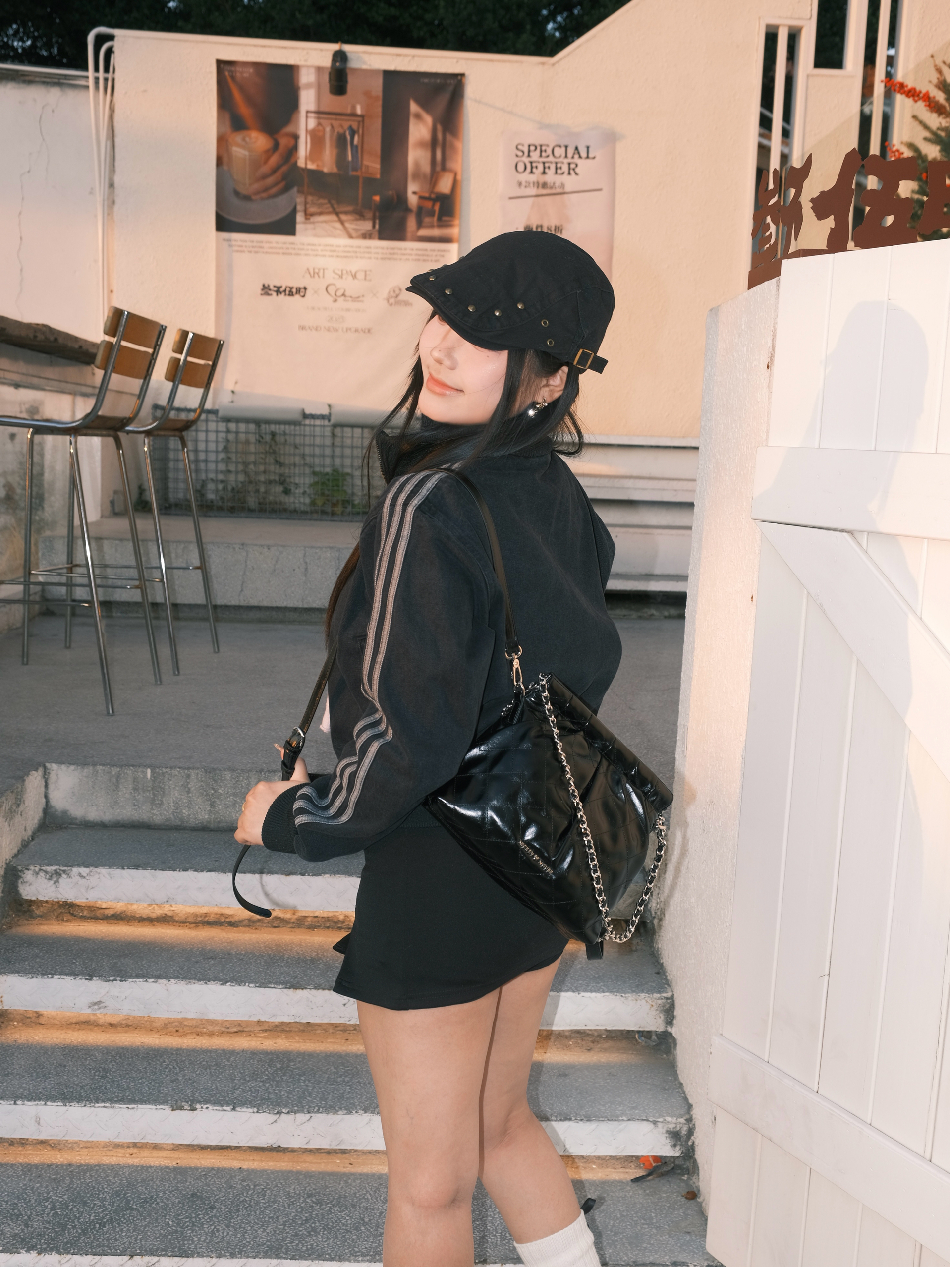 新年穿All Black真的又酷又有氛围感,简约又高级。短款黑色夹克搭配浅灰吊带,利落显瘦,甜酷平衡刚刚好。下身配黑色短裤与白袜拖鞋,慵懒随性,日常出门敲舒服。 点睛的黑色菱格链条包,质感在线,单肩斜挎都很出彩,轻松点亮整套穿搭。不用刻意打扮,也能自带气场,新年出门拍照敲上镜,好看又耐看。 当然也很适合给闺蜜姐妹整一个!