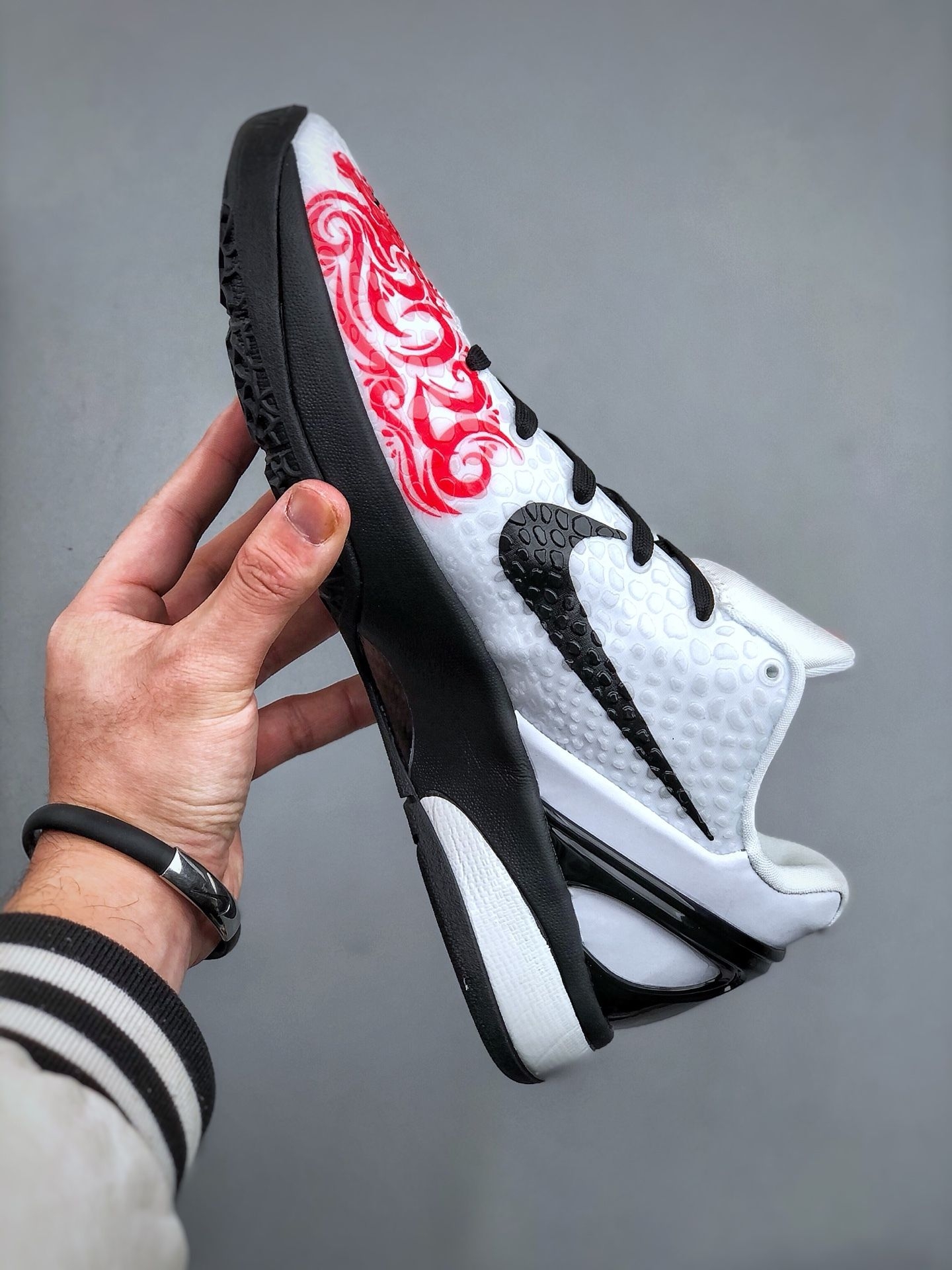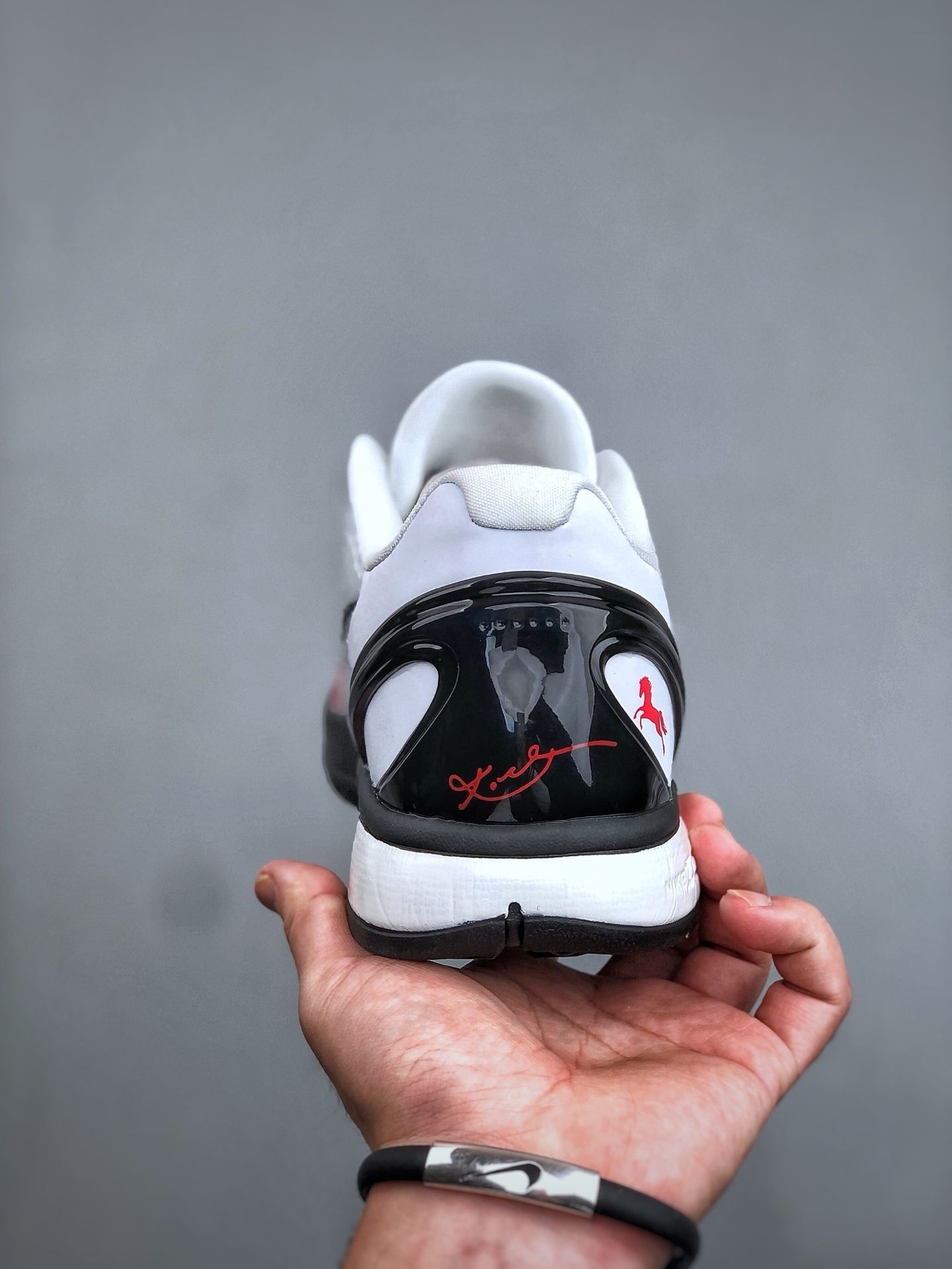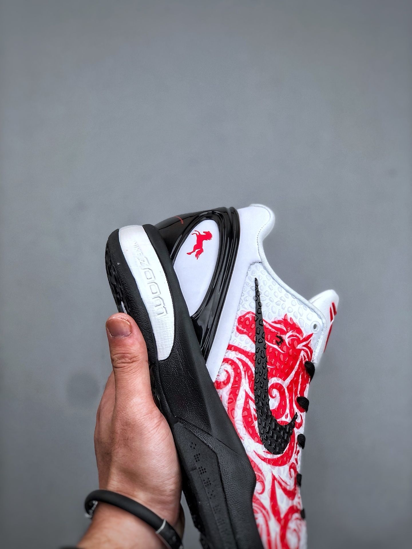 吸引我的,首先是那种“东西合璧”的巧思。 白红黑的经典湖人配色之上,最妙的是后跟那个红色的奔马图案,旁边还有科比的签名。马年的生肖元素,用这种张扬又艺术的方式,烙在了一双极富现代感的篮球鞋上。鞋面的聚氨酯蛇鳞纹理,在光线下有种幽幽的光泽,摸上去有清晰的颗粒感。这种质感,和普通皮质完全不同,它让你想起黑曼巴的鳞片,也想起年画里那种充满力量的线条。它不只是一双运动鞋,更像一个文化的小小交汇点。