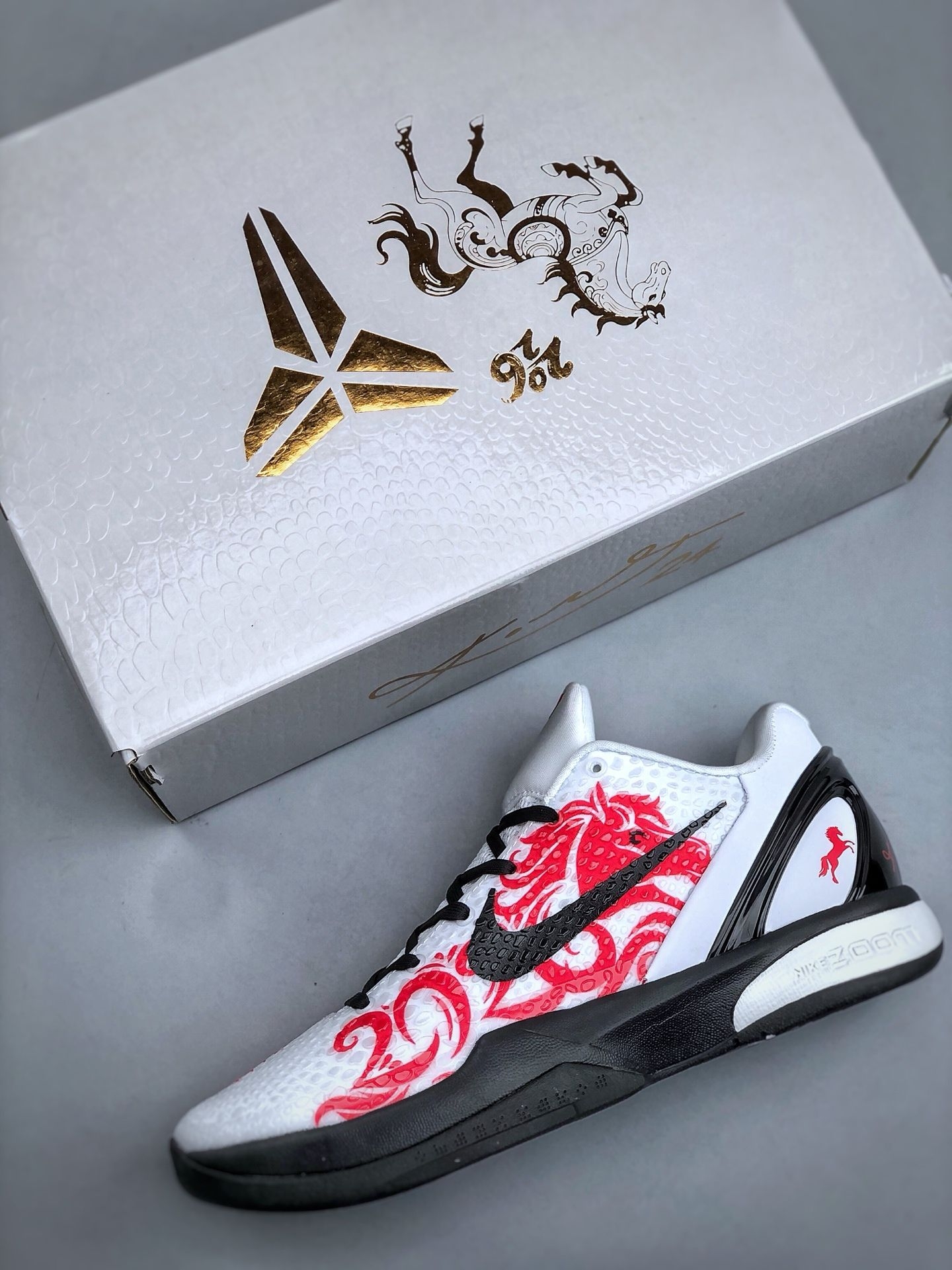 我书柜最上层,有个位置是留给几双舍不得下地鞋子的。其中一双,就是这双Kobe 6马年限定。每年总会拿出来看几次,不是炫耀,更像一种私人的仪式。擦擦灰,端详一会儿,再放回去。最近整理时又把它请了出来,随手拍了这些照片。