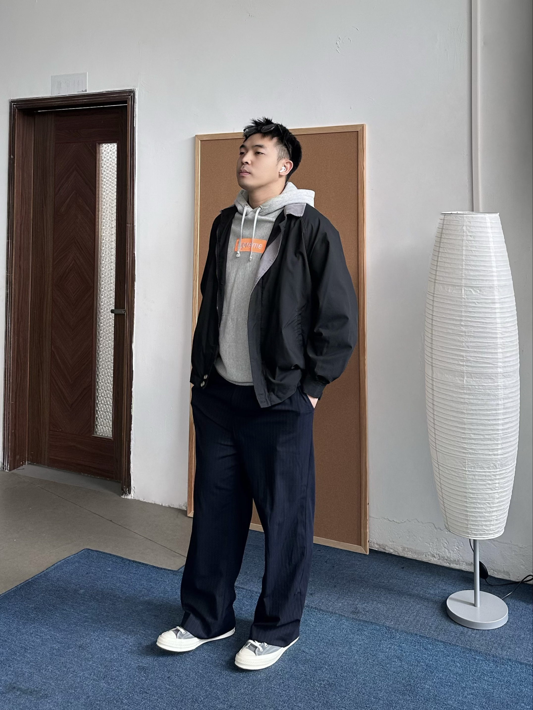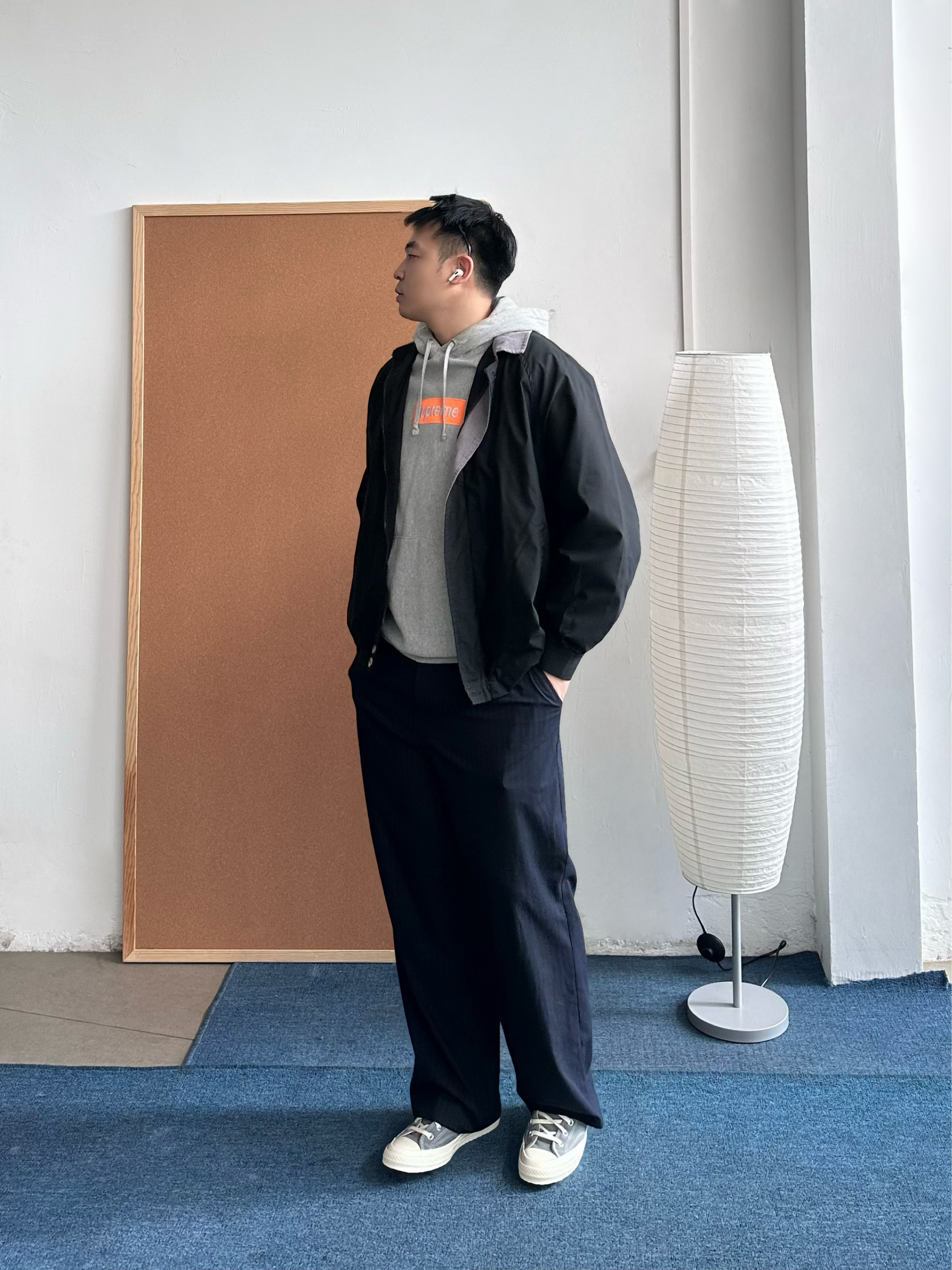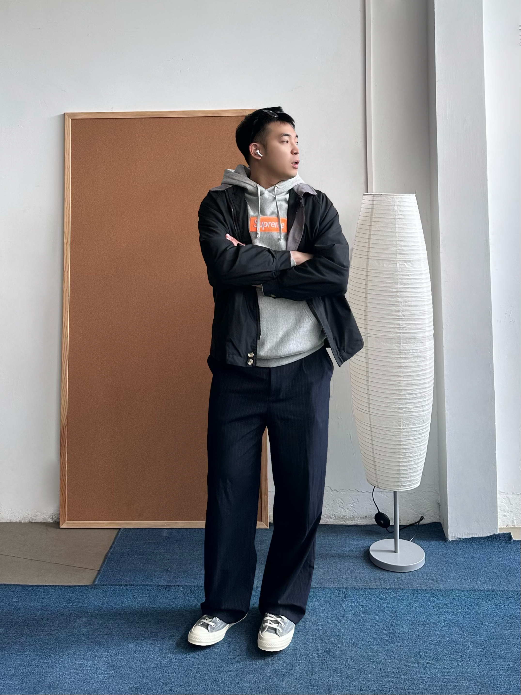 👕 内搭:今天我选了花灰色连帽卫衣,经典box logo点到为止,不会太花,但比纯色有细节。早春单穿刚好,叠穿也很干净。 🧥 外搭:薄款黑色立领夹克很适合这个季节,挡风但不闷,我喜欢立领穿着,更加干净利落。 👖 下装:我搭了一条藏青色西裤,把卫衣的休闲感收一收,通勤也OK。 👟 鞋子:浅灰色帆布鞋收尾,颜色顺着卫衣走,整体更统一,轻松但不随便。