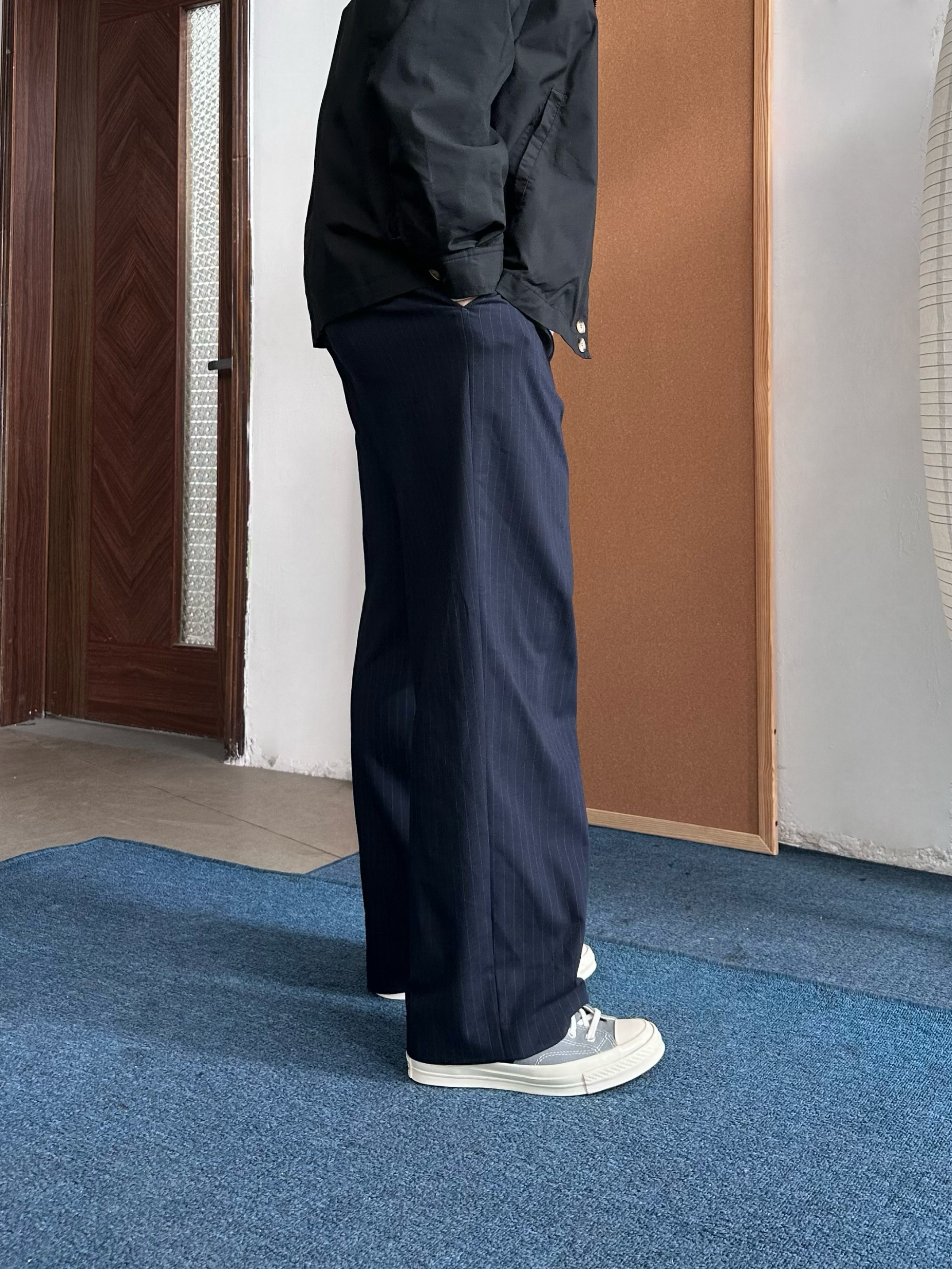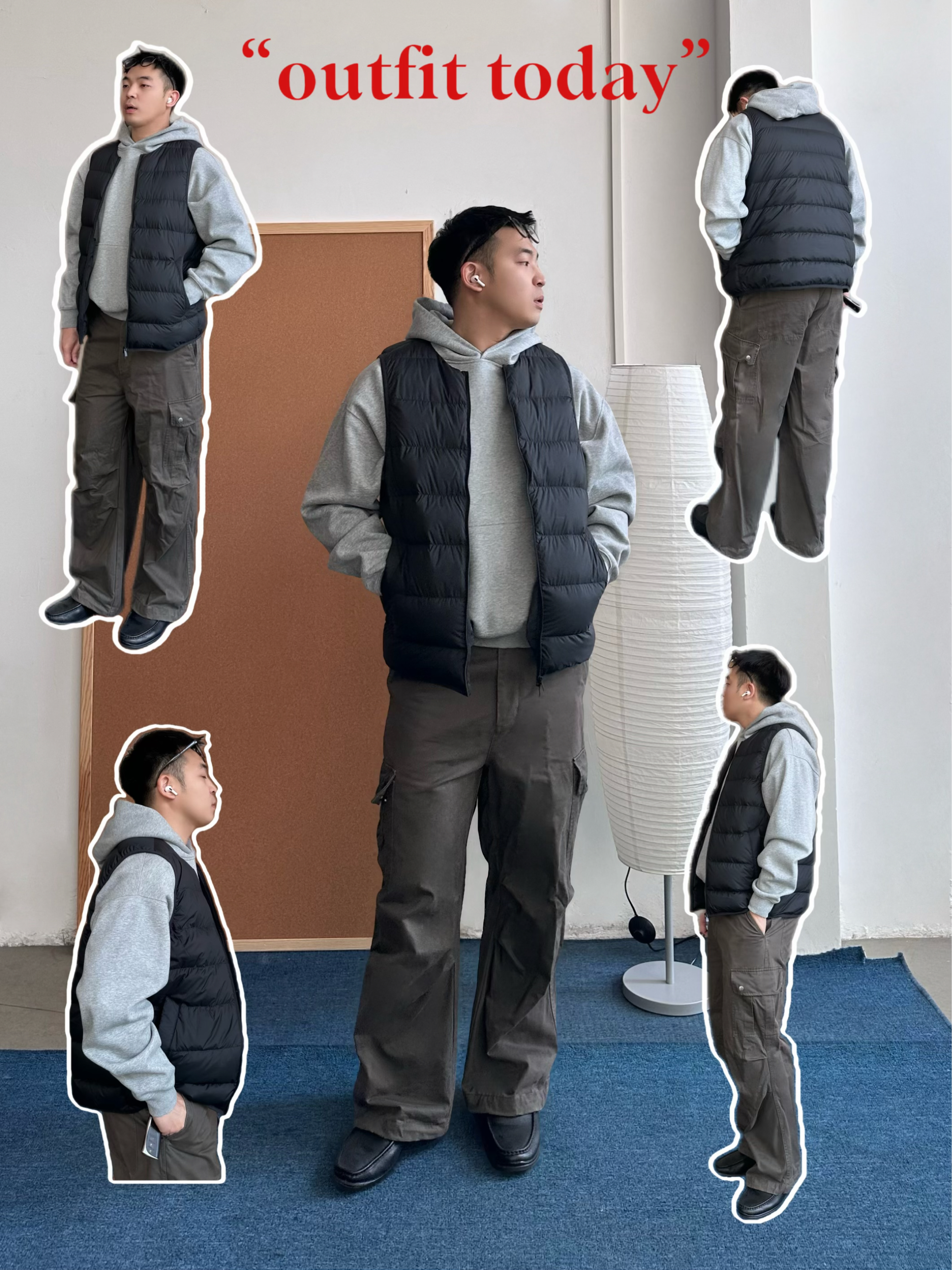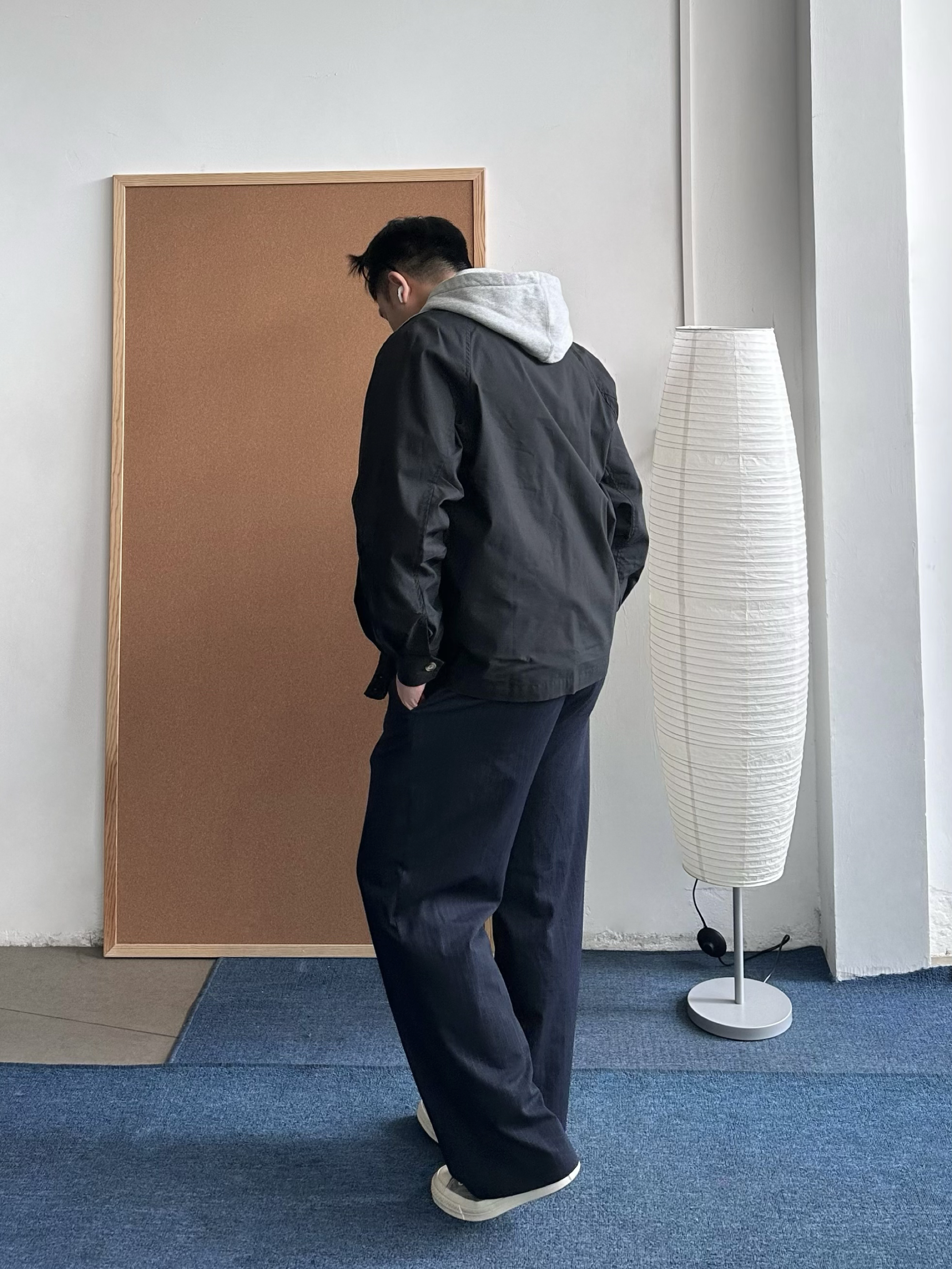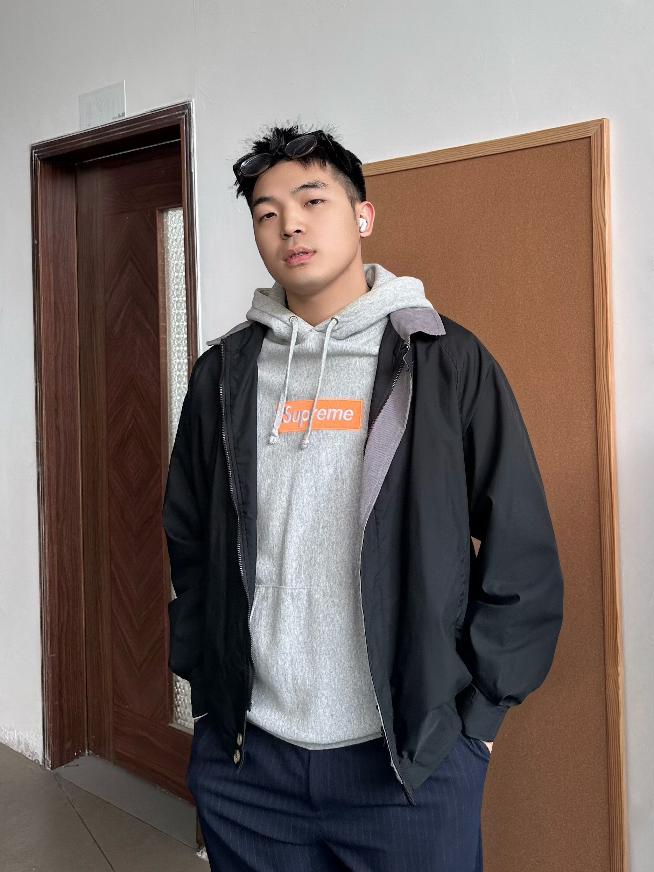 👕 内搭:今天我选了花灰色连帽卫衣,经典box logo点到为止,不会太花,但比纯色有细节。早春单穿刚好,叠穿也很干净。 🧥 外搭:薄款黑色立领夹克很适合这个季节,挡风但不闷,我喜欢立领穿着,更加干净利落。 👖 下装:我搭了一条藏青色西裤,把卫衣的休闲感收一收,通勤也OK。 👟 鞋子:浅灰色帆布鞋收尾,颜色顺着卫衣走,整体更统一,轻松但不随便。