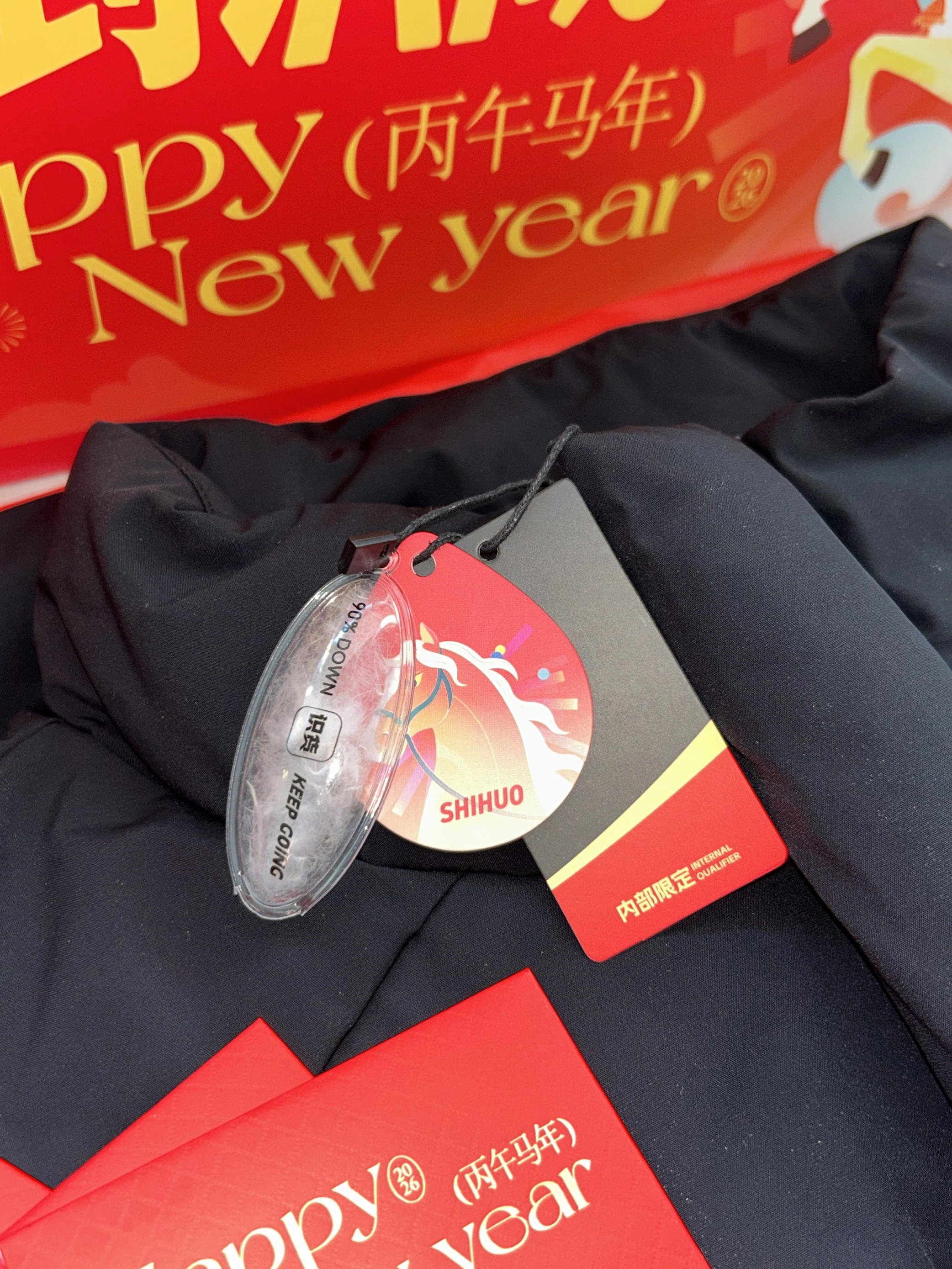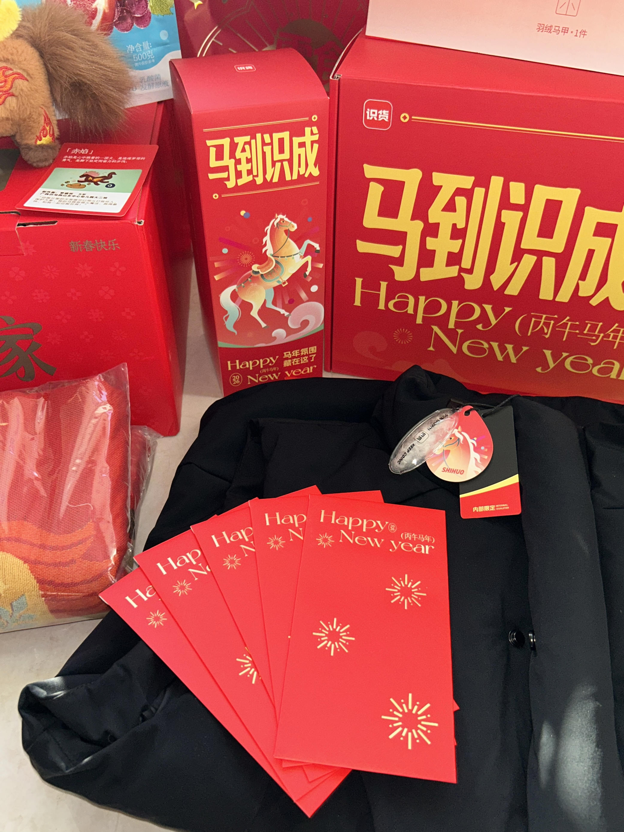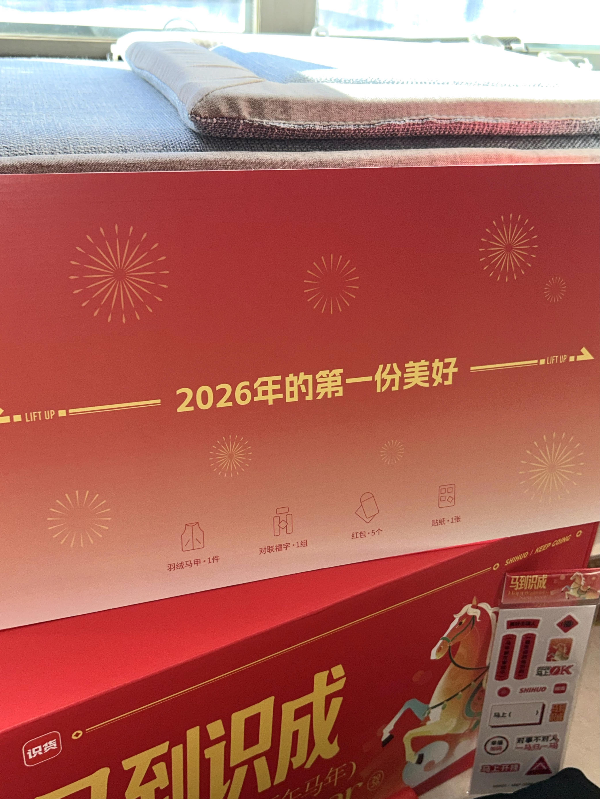 2026如期收到识货的新年礼盒 羽绒马甲、对联、红包福字、贴纸 满满的新年年味气息,简直太有爱