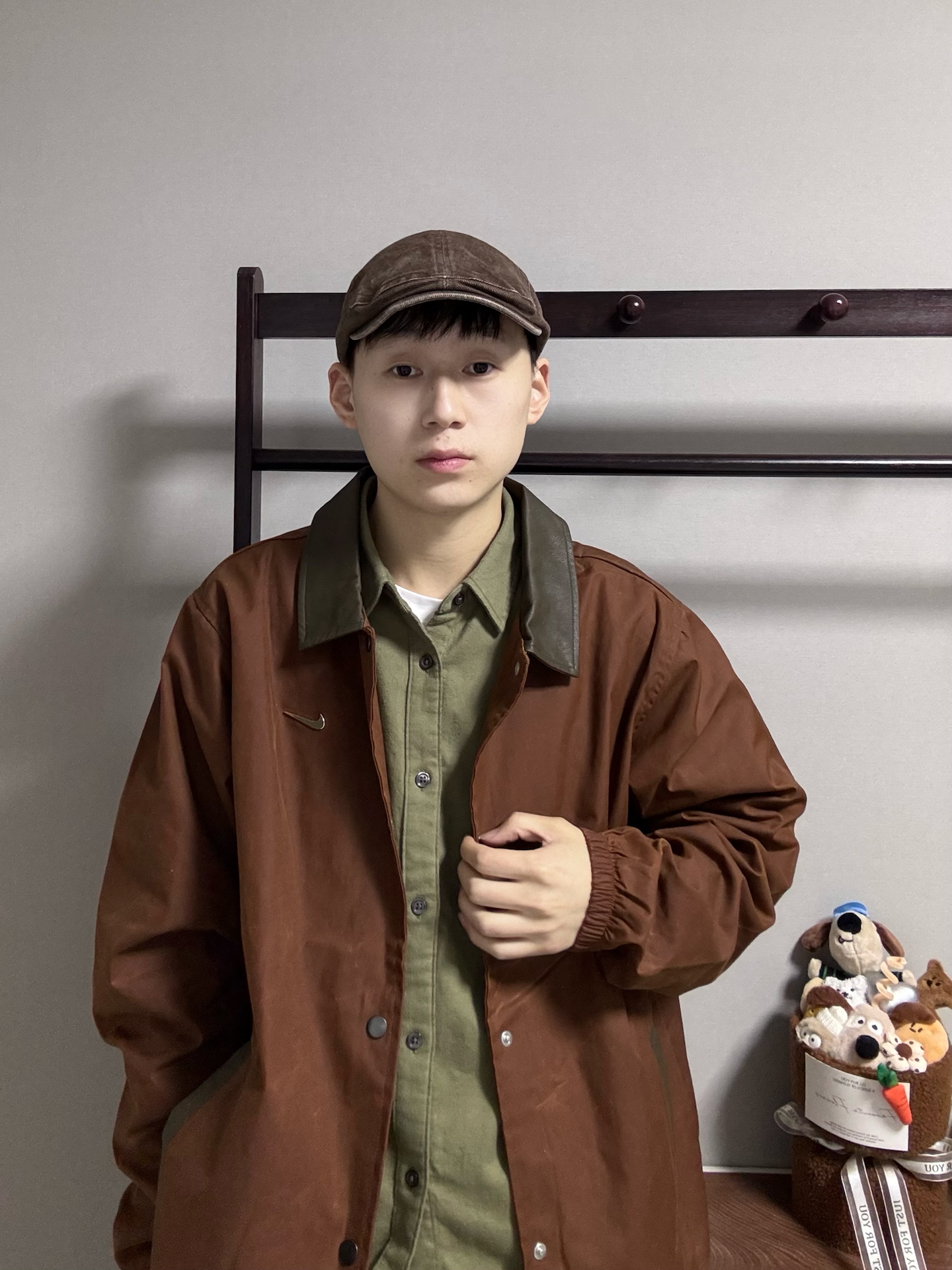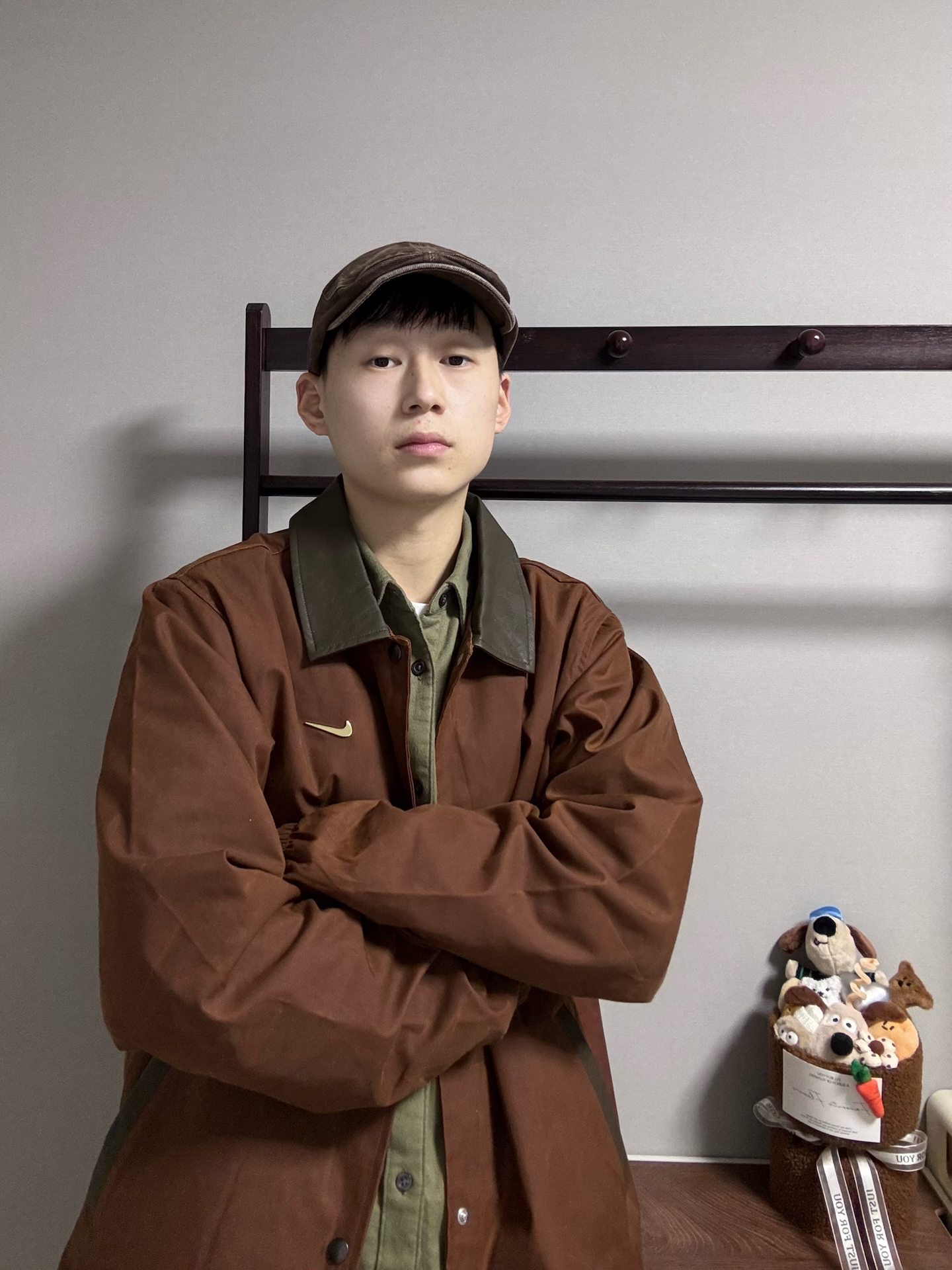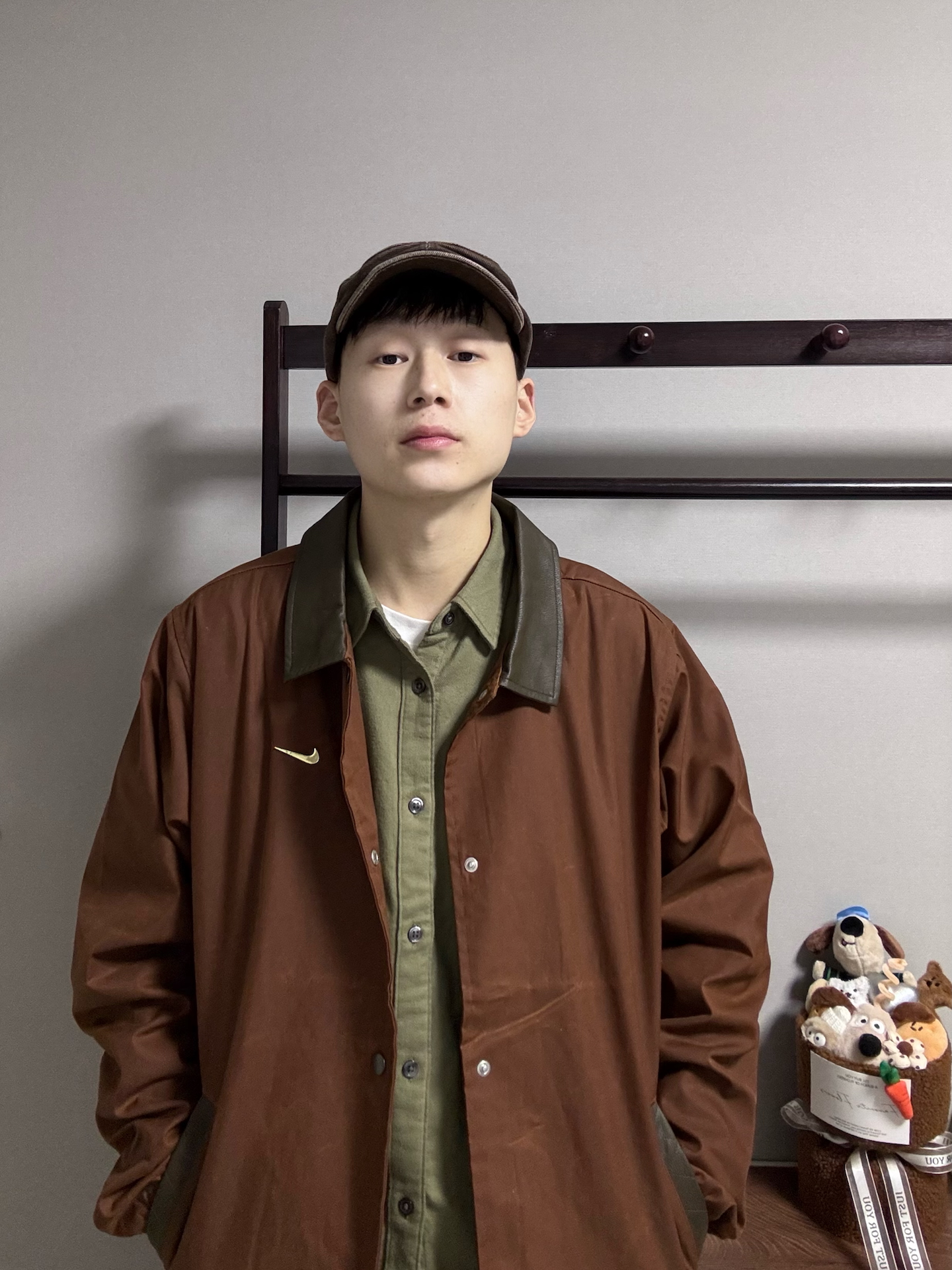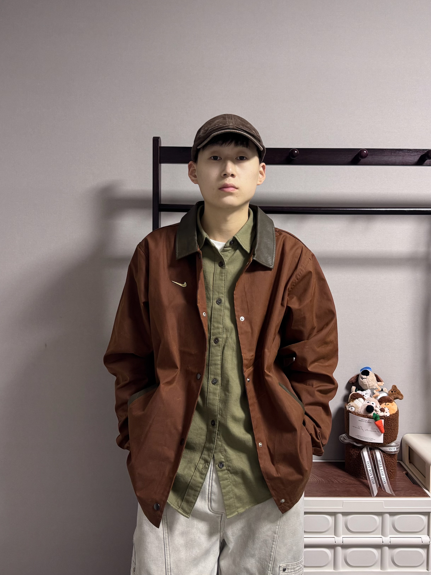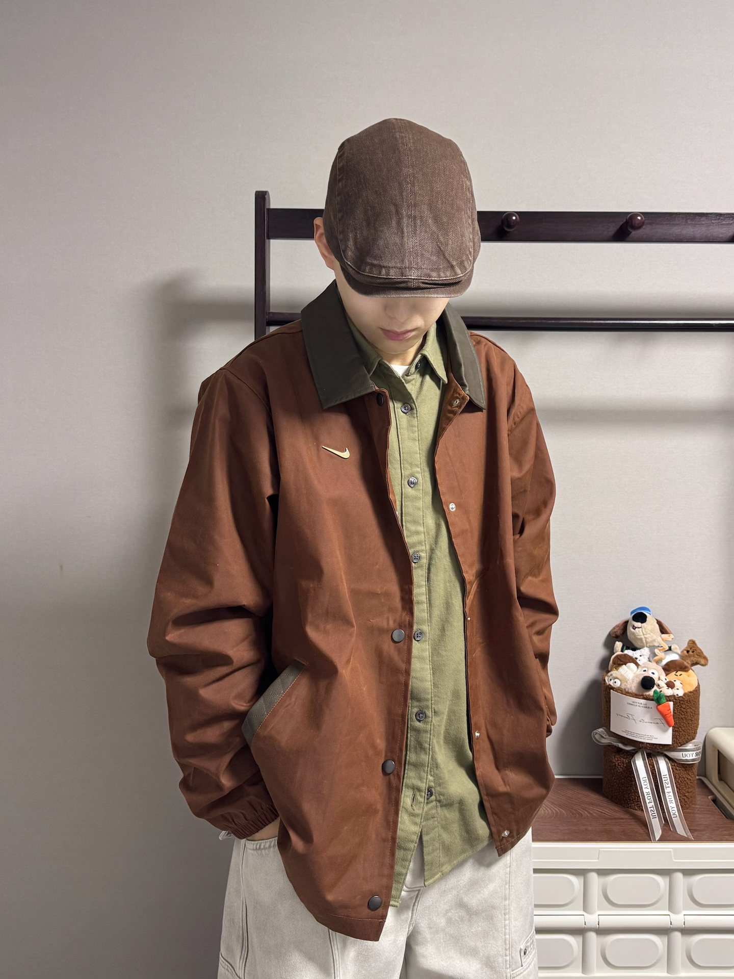 焦糖色教练夹克自带复古滤镜📷 做旧皮质翻领和小勾标细节拉满💯 内搭军绿色衬衫,同色系叠穿让层次更显高级,宽松版型弱化了硬朗感~ 浅灰工装裤中和了上半身的厚重,再配上一顶复古前进帽,瞬间拉回旧时代的记忆穿搭🎧 🧢:前进帽 👕: #Nike 复古油蜡夹克 #预制春节穿搭 #预制我的过年战衣 #当我以为穿得很潮 #人设穿搭法 #马上换新也焕新