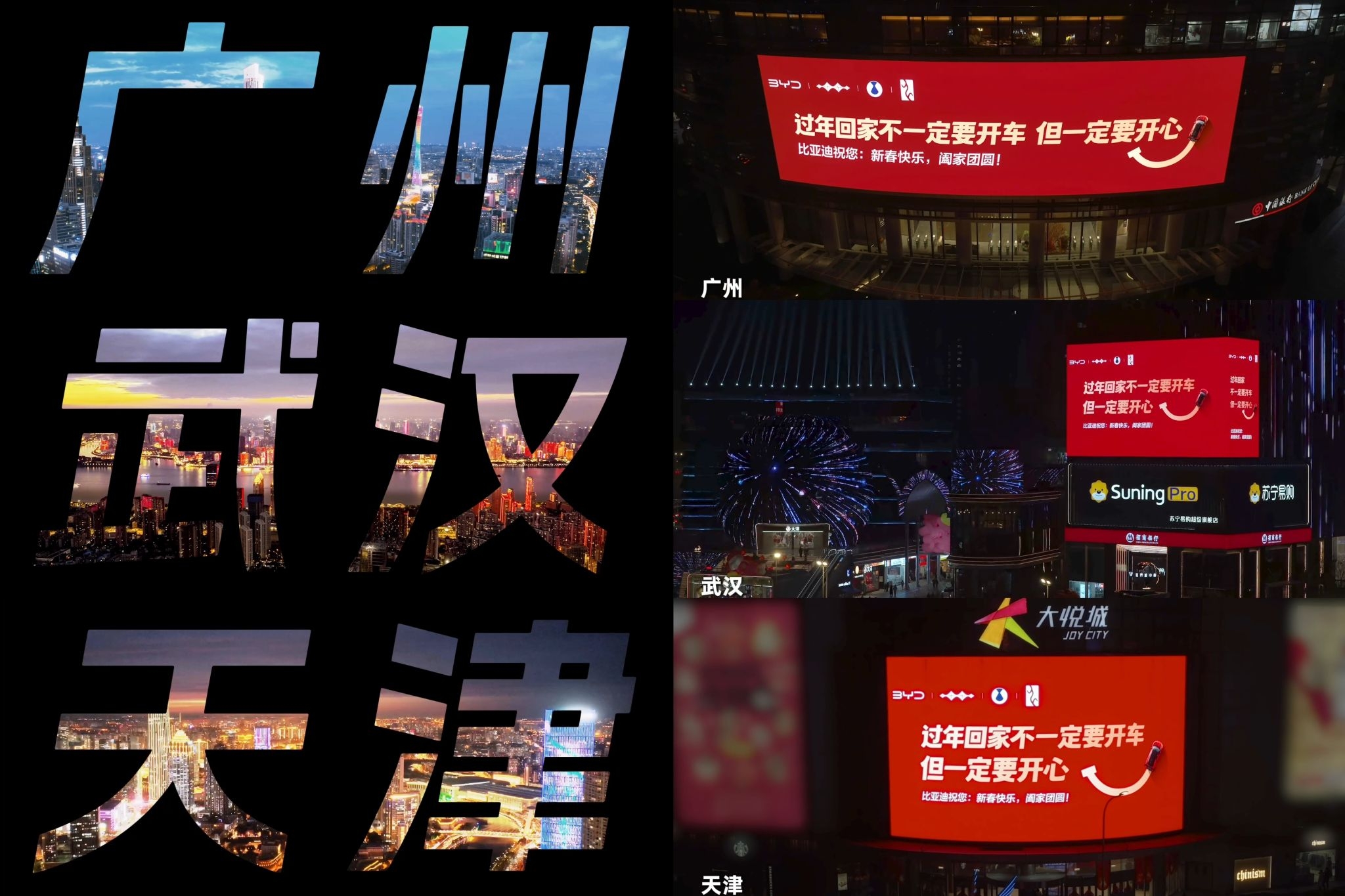 春节,是团圆的时刻,也是品牌传递温情的好时机。 今年春节,比亚迪以一场别开生面的户外广告投放,在机场、商圈等公共空间,为归家的人们送上了一份特别的祝福,让“开心”成为这个春节最动人的旋律。 春节户外广告中,比亚迪没有一味地强调产品性能和技术优势,而是将关注点放在了“人”的感受上。 “过年回家不一定要开车但一定要开心”“比亚迪太懂了!过年不劝开车,只祝你开心”,这些简单却真挚的话语,如同一股暖流,...
