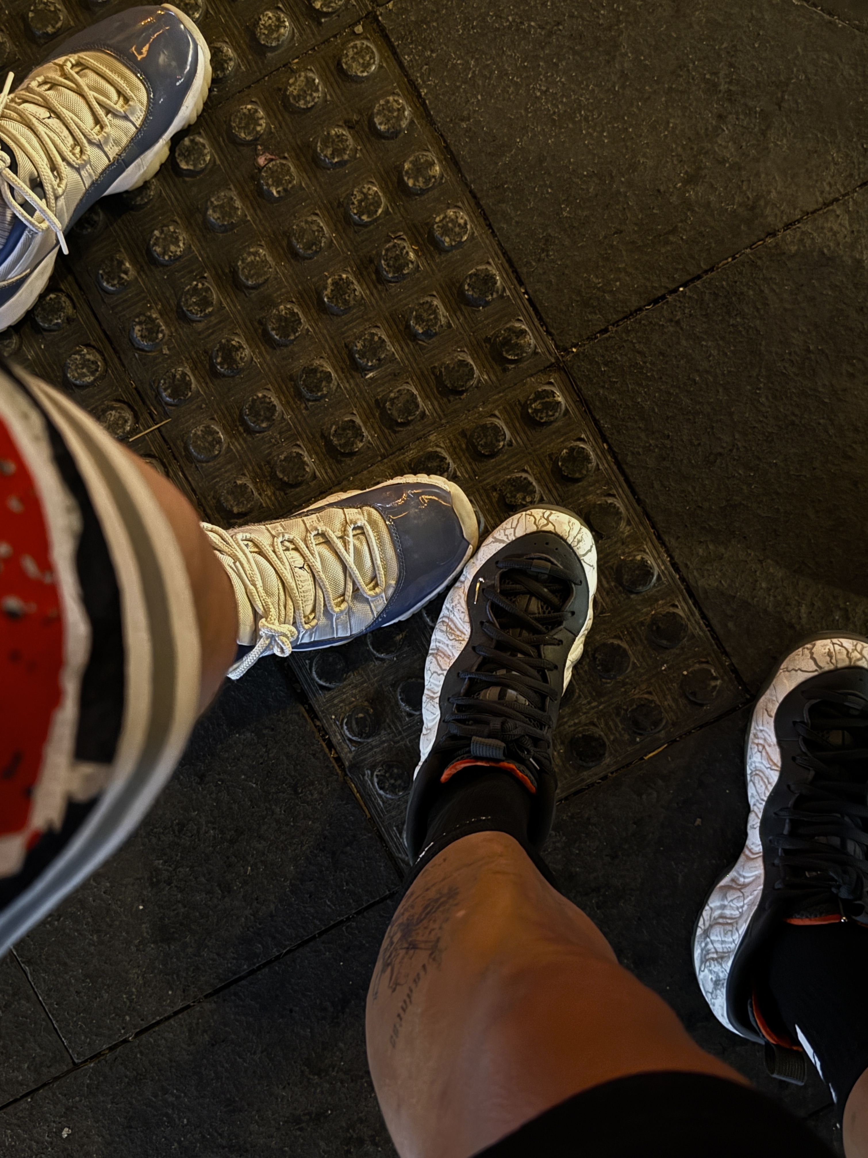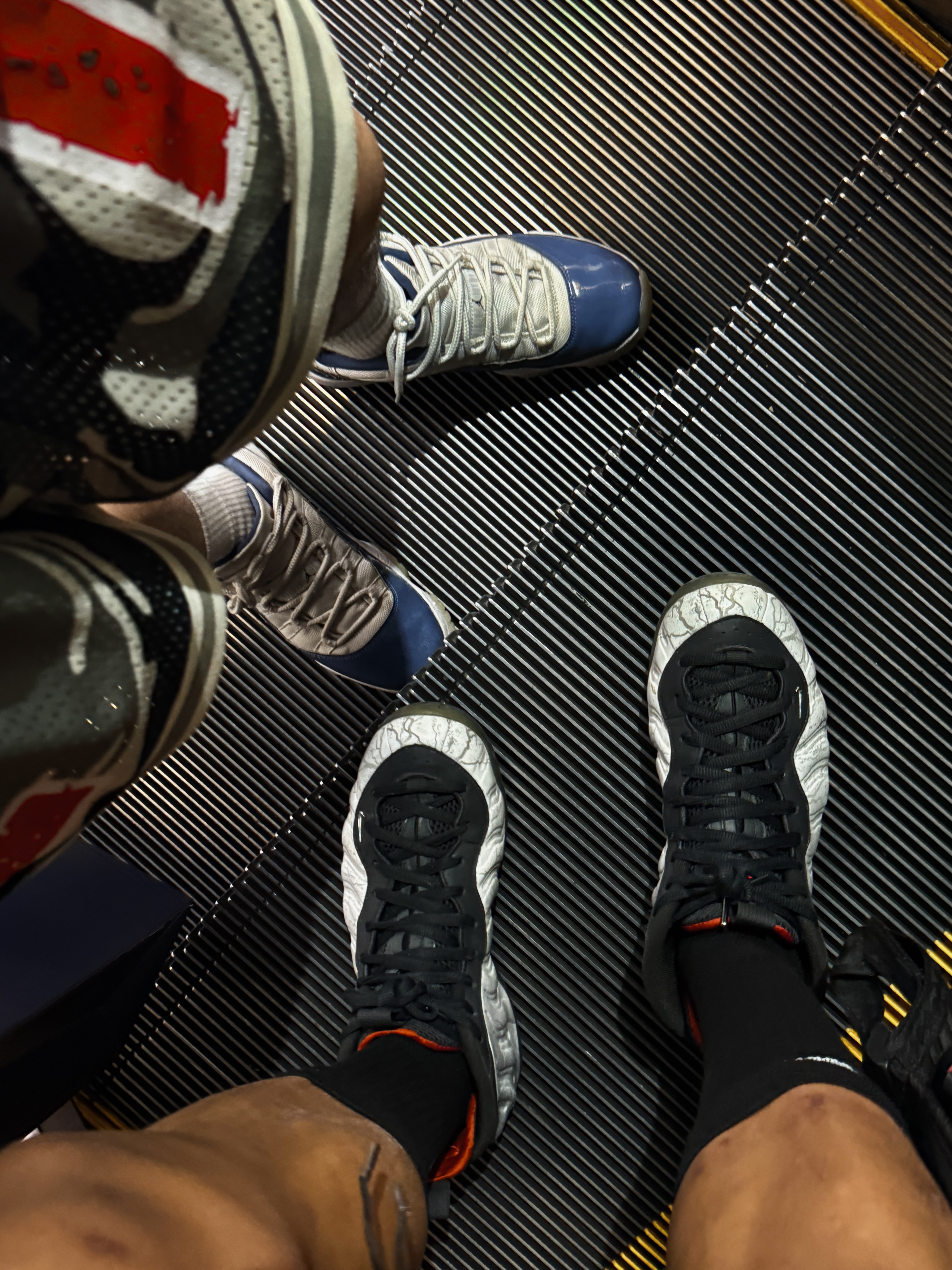广州老巷的咖啡店 和兄弟凑了个球鞋局🆒 喷泡铁拳喷的爆裂纹理遇上AJ11午夜蓝的复古漆皮 黑白蓝三色碰撞 街头感氛围直接焊身上喽🙋🏻♂️ ▪️蓝色球衣加AJ11午夜蓝 清爽的运动少年感 ▪️黑色机能夹克加喷泡铁全喷 硬核的街头酷感 球鞋是语言 姿势是态度 两双硬鞋 你更喜欢哪一双和哪种温度💥 #篮球男孩穿搭ootd #美式运动风穿搭 #体育生穿搭ootd #男生美式街头穿搭 ...