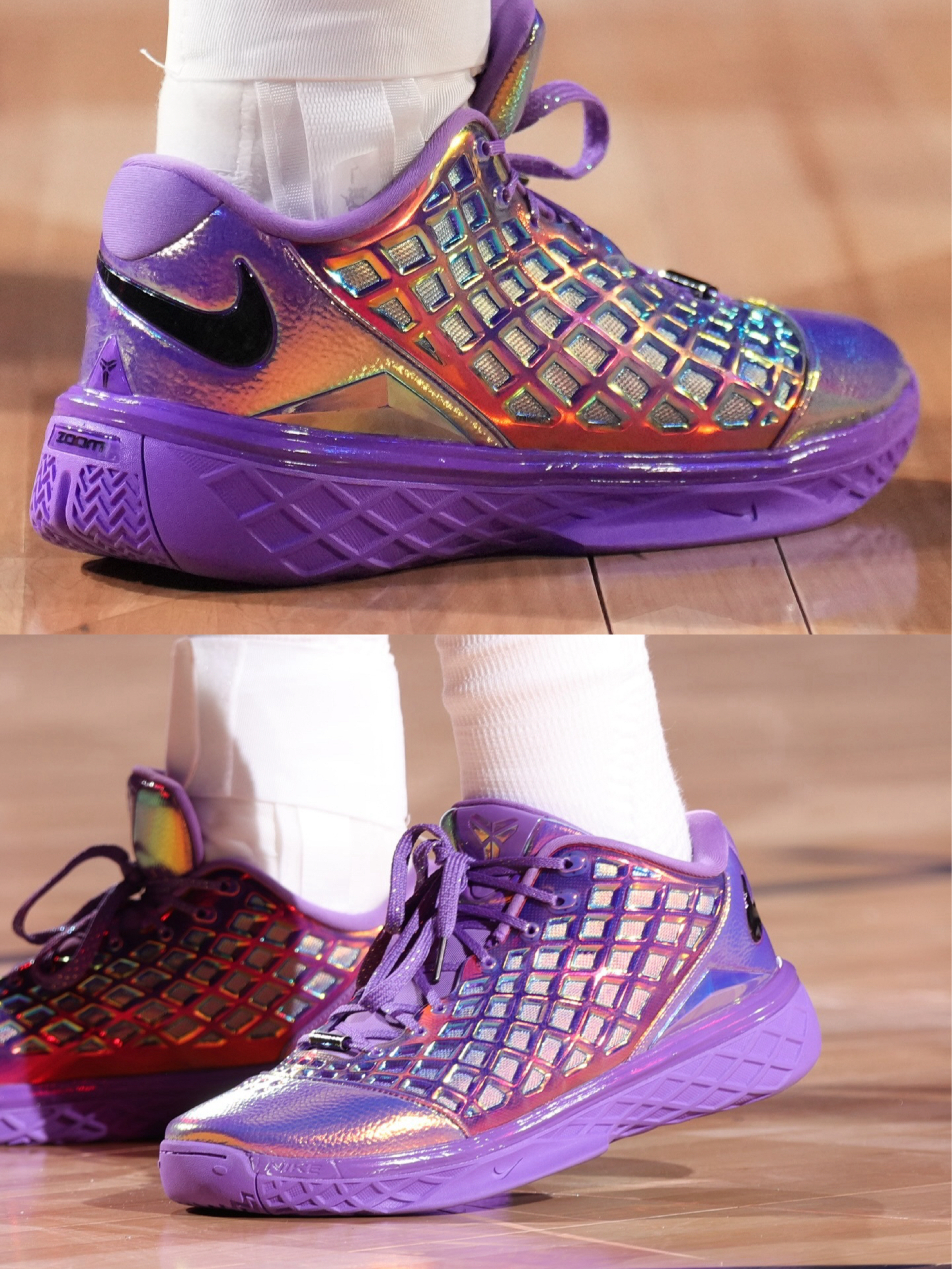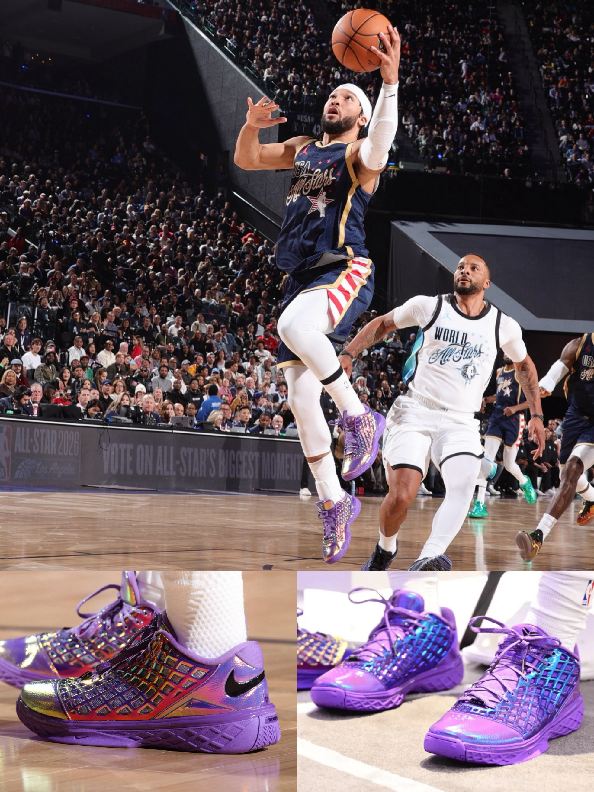 全明星周末的紫金色曼巴战靴,布伦森这双Kobe 3 Low Protro“Warning Label”真的杀疯了! 渐变紫虹彩+网格纹理,在聚光灯下直接把赛场变成秀场。USA All-Stars球衣+这双鞋,曼巴精神在全明星舞台上再次闪耀