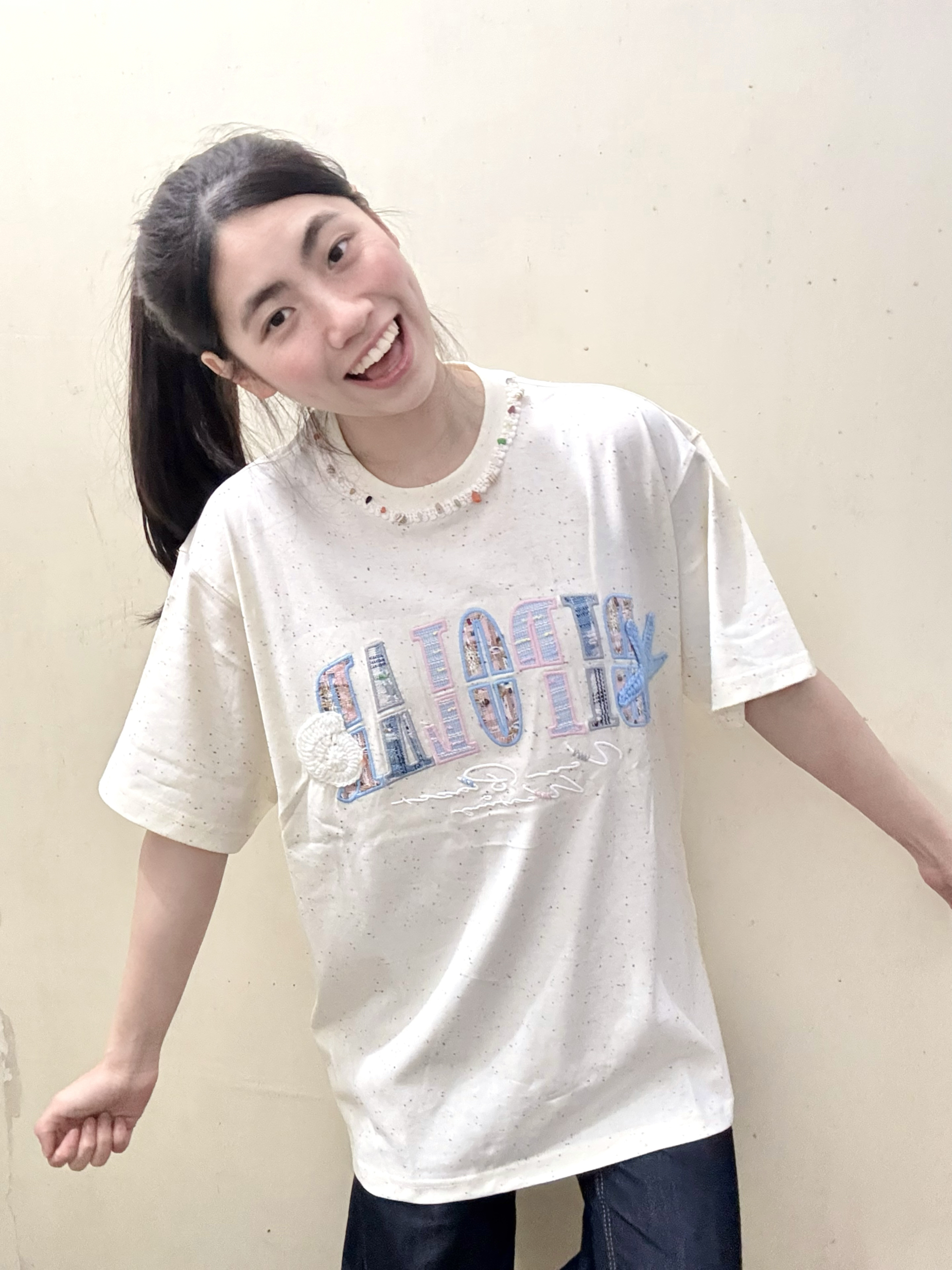 166 102穿的是M码 拿到手真的发现好多小细节 太戳我了 领口一圈做了彩点织带 上面还有七彩刺绣 和彩色的波点 太有多巴胺那味了