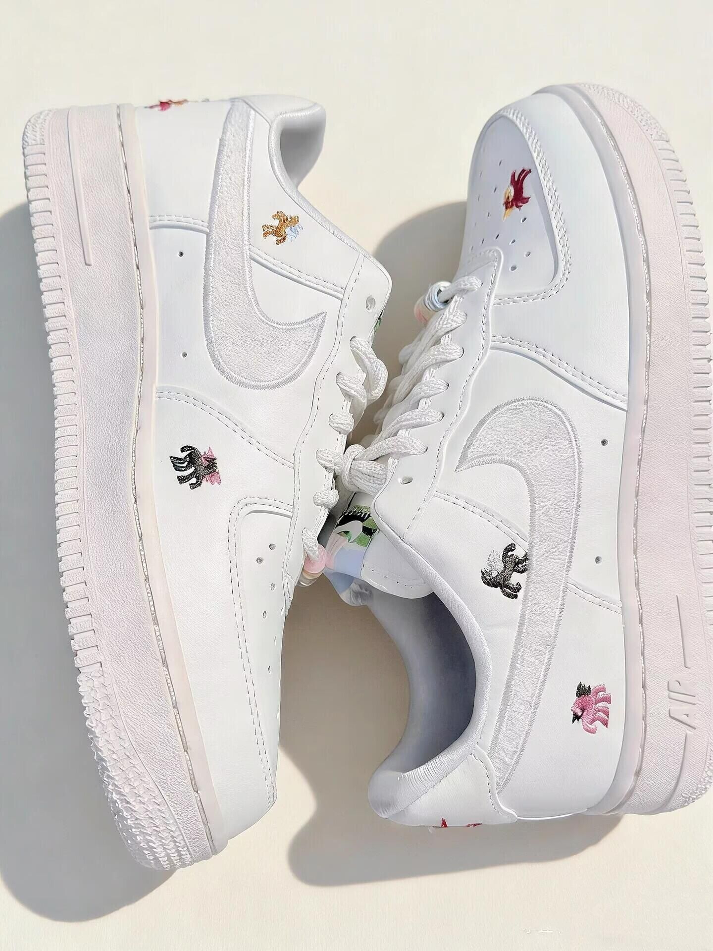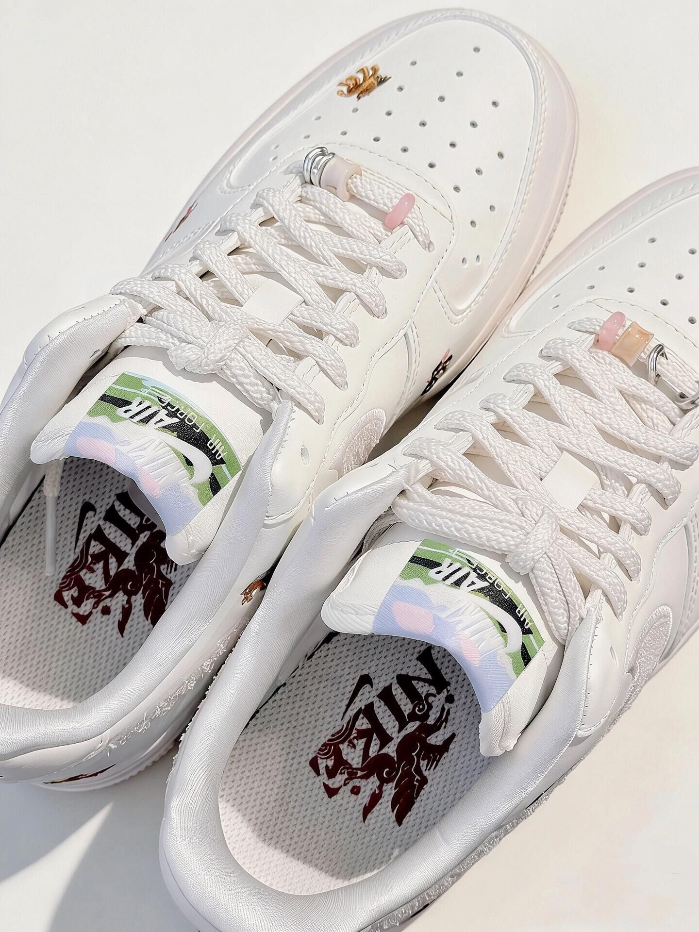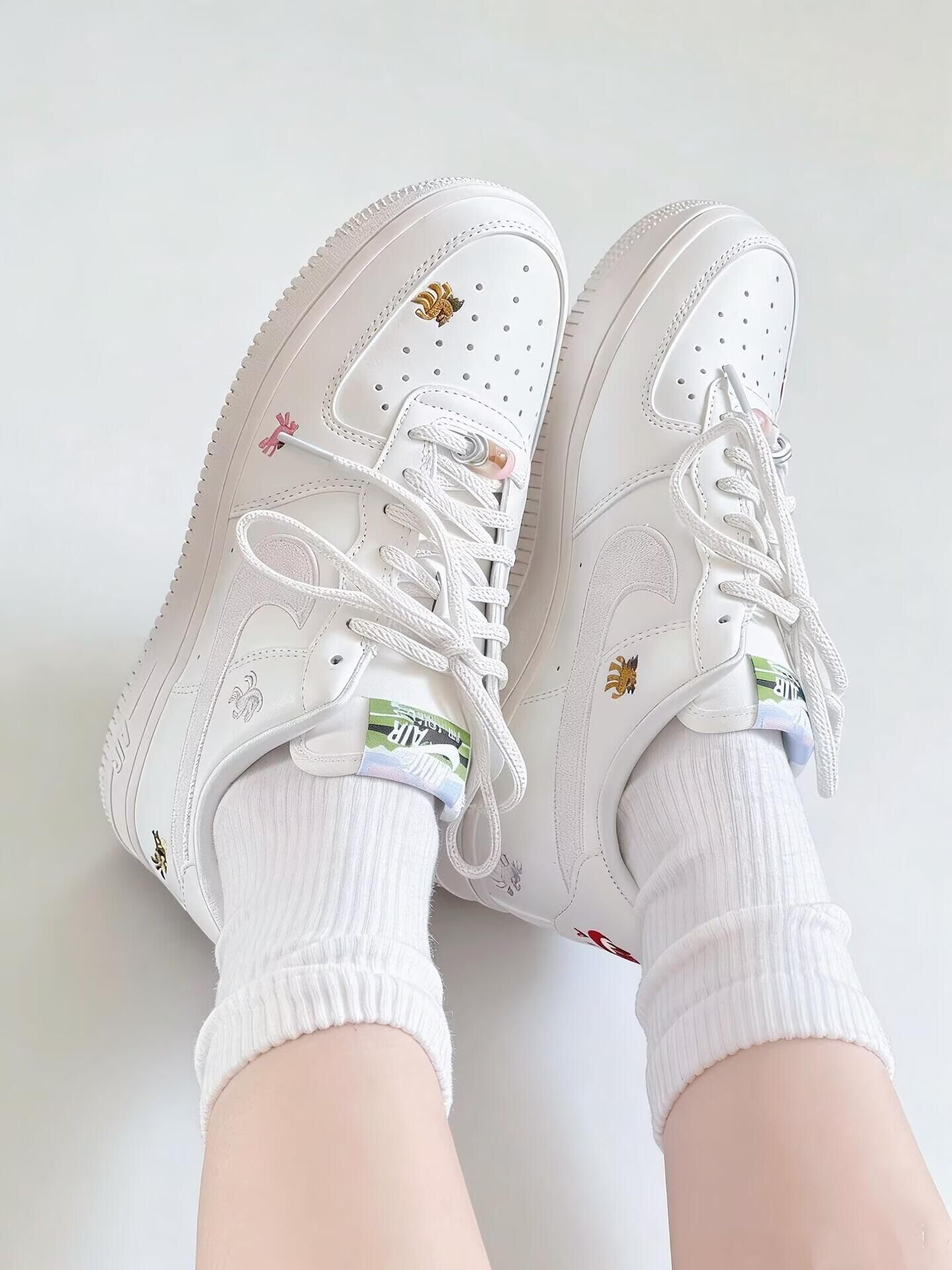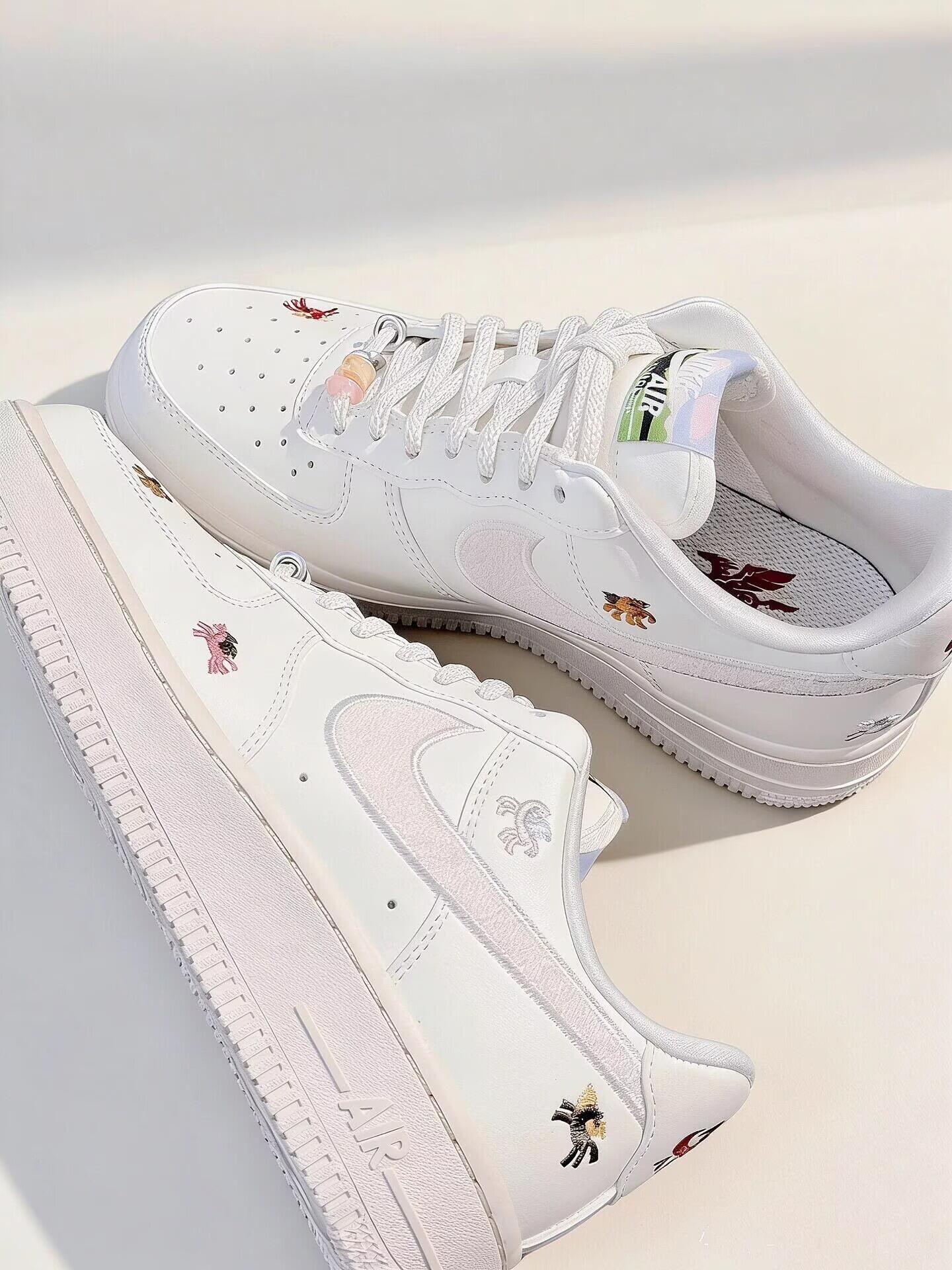 Nike马年限定Air Force 1,经典低帮板鞋型,奶白皮革+浅杏绒面Swoosh,质感细腻又高级计。 鞋身点缀多彩小马刺绣,每只姿态都不同,细节超丰富!🥰 日常通勤、节日出街都超百搭,牛仔裤裙装随心搭!!💗 纯白鞋身搭配细闪勾子,温柔又精致鞋面上的小马刺绣超灵动不同配色的小马图案细节拉满 马年穿这双限定款氛围感和仪式感直接拉满~上脚舒适度拉🈵 新年穿新鞋,马年就要步步生风呀✨