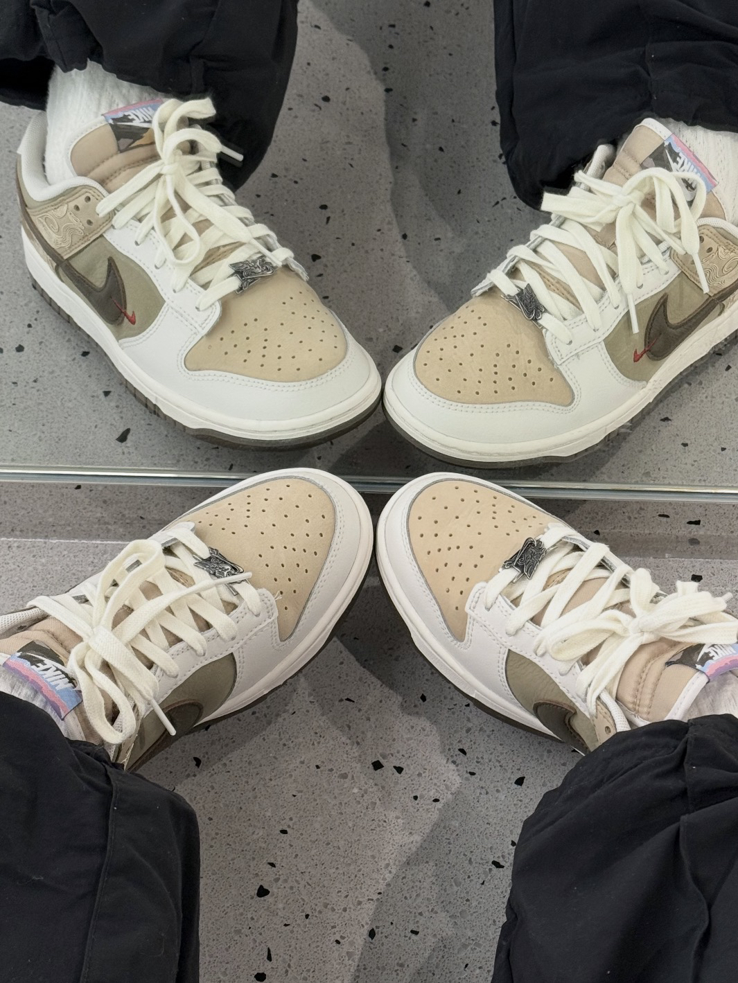 米白+卡其拼接,橄榄绿点缀,复古感满满! 鞋身祥云压纹+后跟飞马刺绣,细节超有中式美学✨。 红色Swoosh和金属鞋扣超吸睛,翻毛皮+皮革拼接,质感在线。 低帮设计,日常通勤、新年穿都很百搭,寓意“马到成功”,收藏&潮流穿搭都值得入手!
