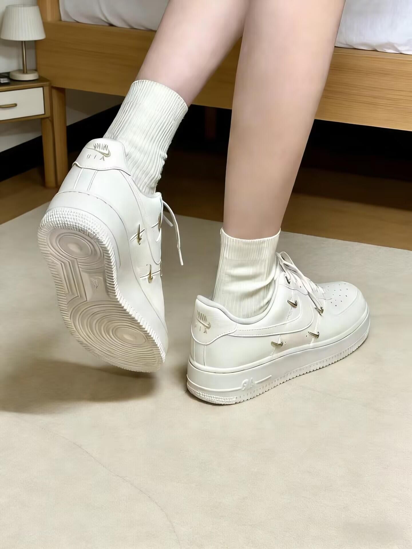 空军一号白金款,颜值与脚感双在线这双Nike Air Force 1白金装饰款真的戳中我了!经典纯白鞋身搭配精致的金色金属饰钉,简约又不失细节感,不管搭休闲裤还是小裙子都超适配。脚感方面延续了空军一号的经典气垫,踩起来软乎乎的,日常走路逛街完全不累脚。中筒白袜配它更是把简约高级感拉满,百搭又耐看,真的是鞋柜里的宝藏小白鞋!